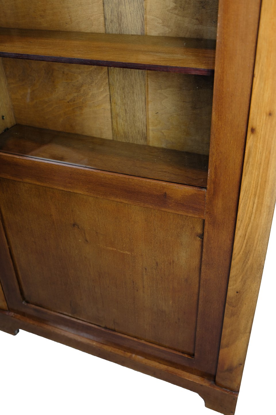 Skabet har en klassisk overkant med udskæringer og en god dybde, der gør det velegnet til opbevaring af både bøger og porcelæn. Glasdøren giver godt indkig til hylderne, mens den nederste del er mere lukket. Skabet står solidt og er håndpoleret.