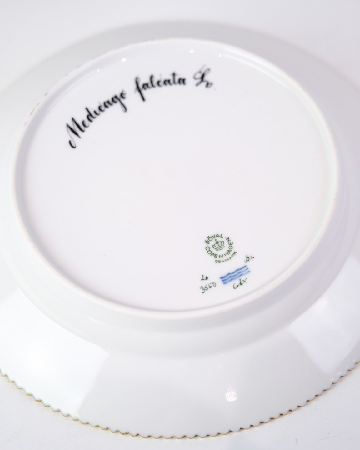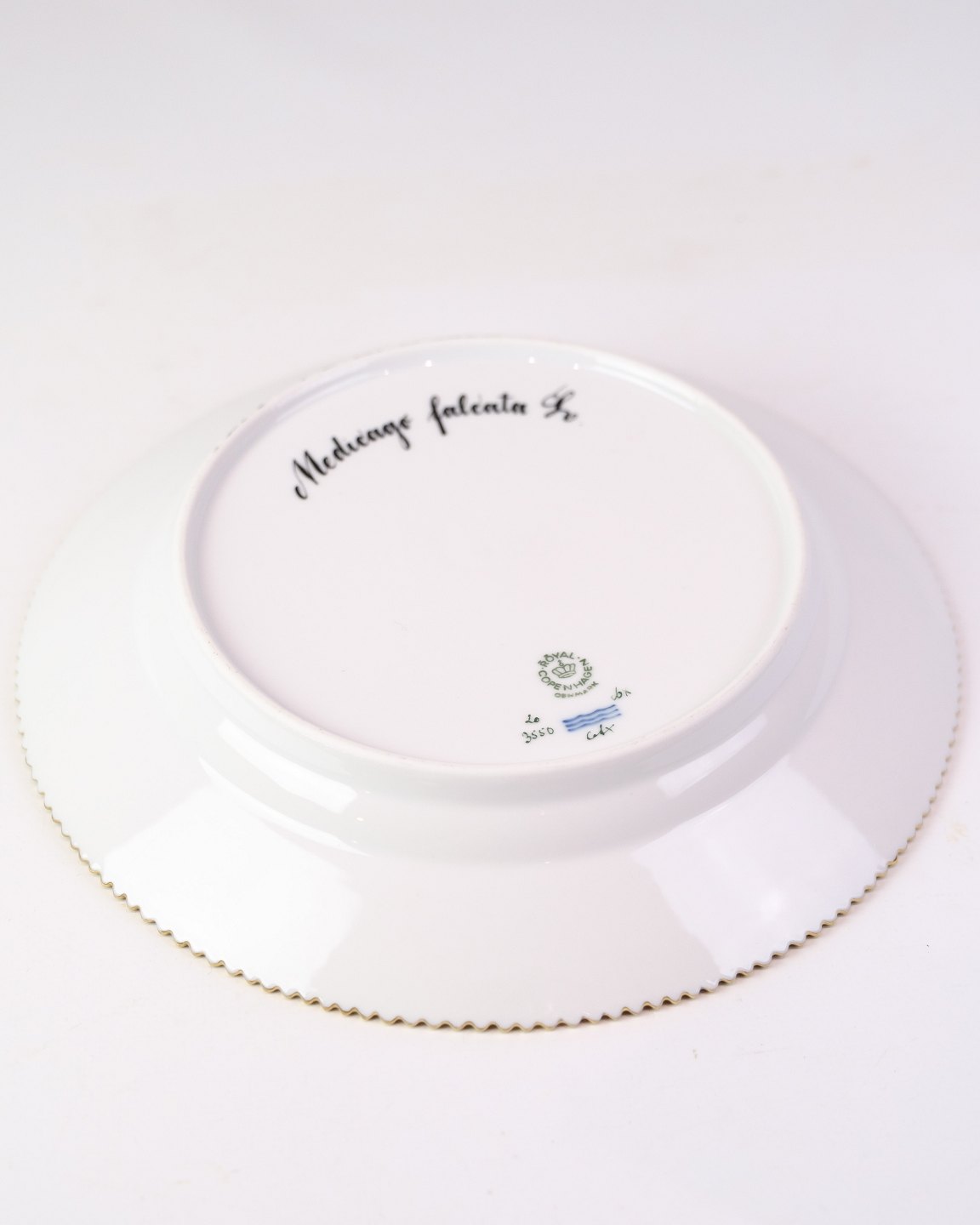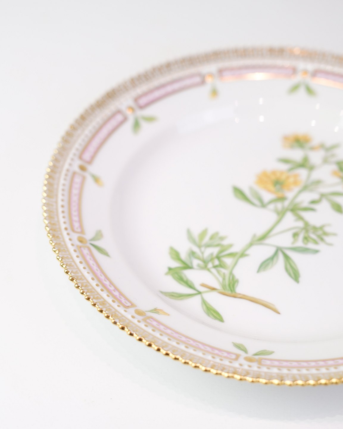 En frokosttallerken fra Royal Copenhagens serie "Flora Danica", dekoreret med håndmalet blomst og guldkant. Denne tallerken bærer dek. nr. 20/3550 og er fremstillet i 1960’erne.