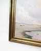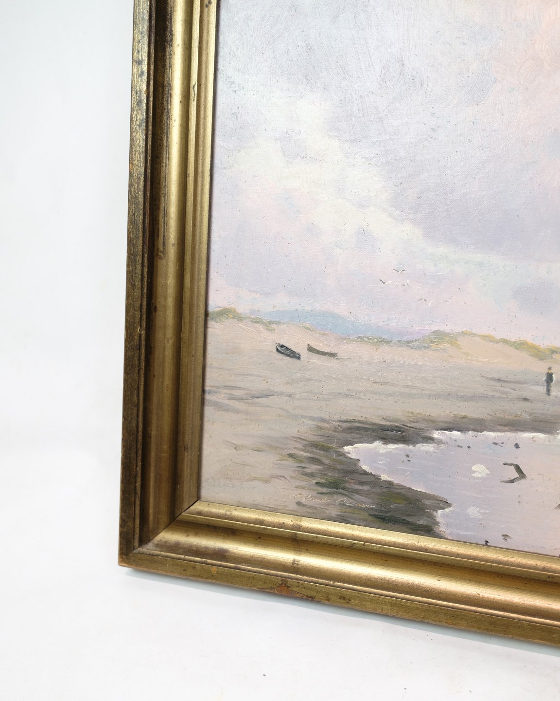 Oliemaleri udført af Alfred Theodor Olsen (1854–1932), kendt dansk marinemaler. Maleriet viser et roligt kystlandskab med strand, hav, drivtømmer og en svagt synlig vindmølle i horisonten. Signeret nederst til højre.