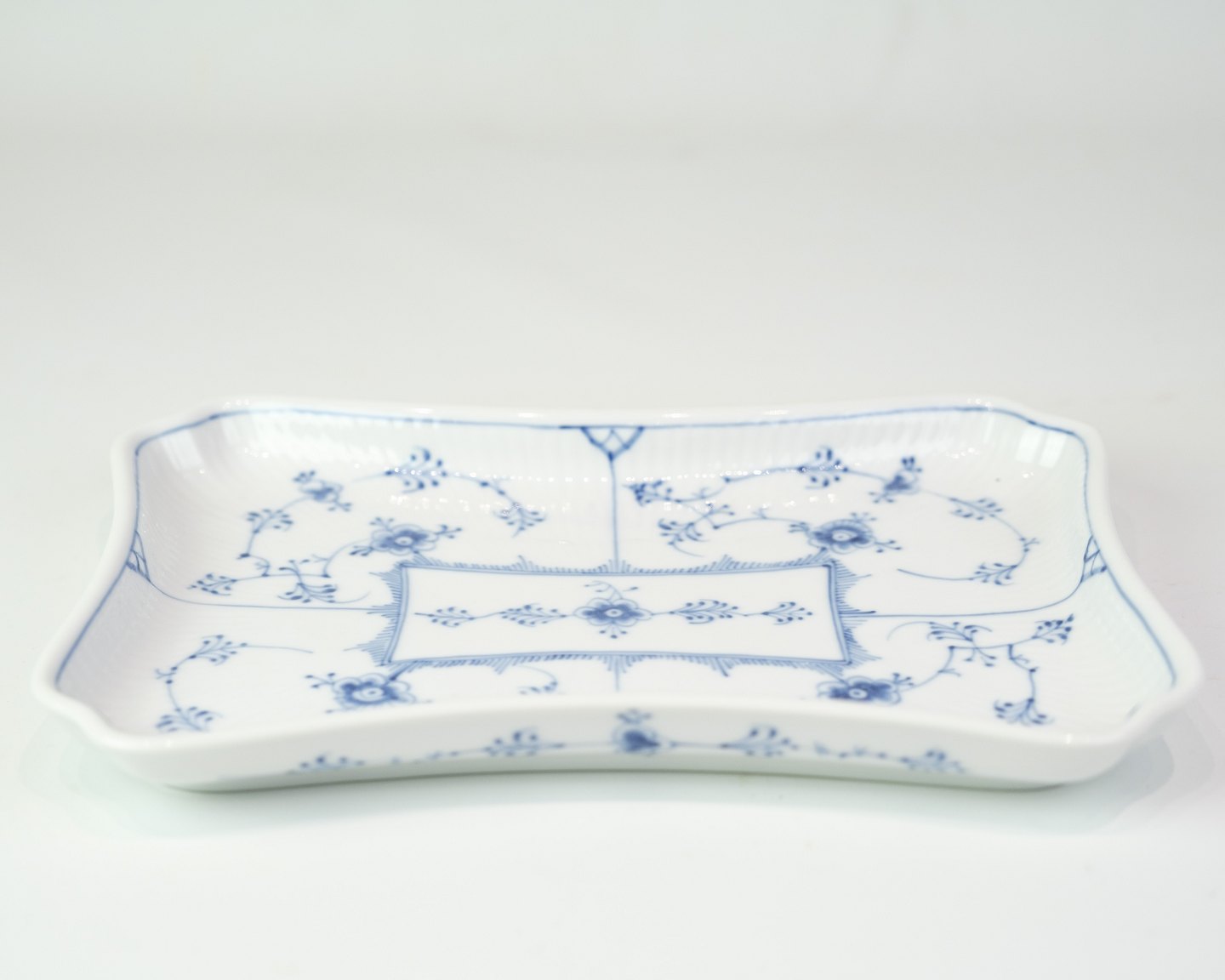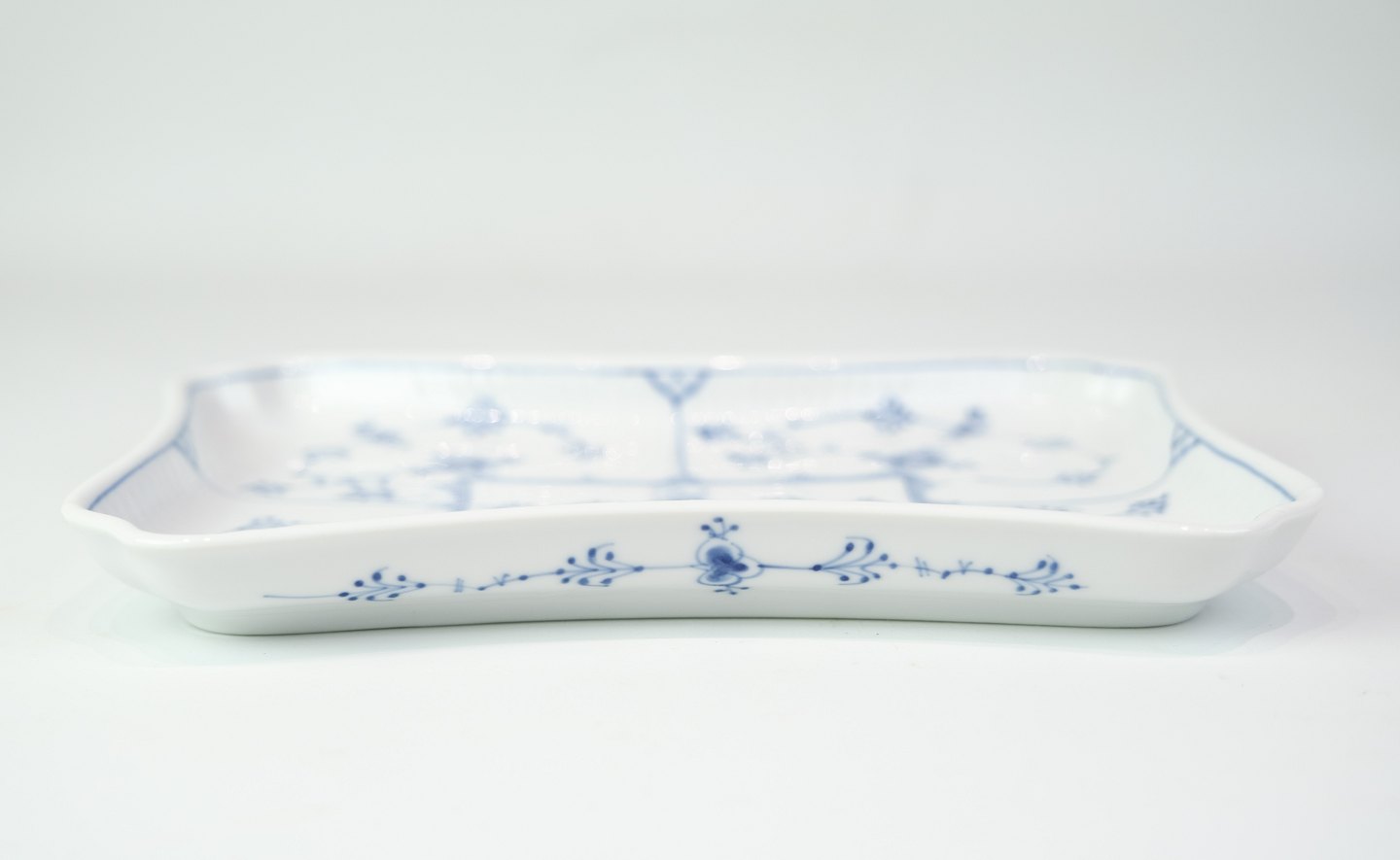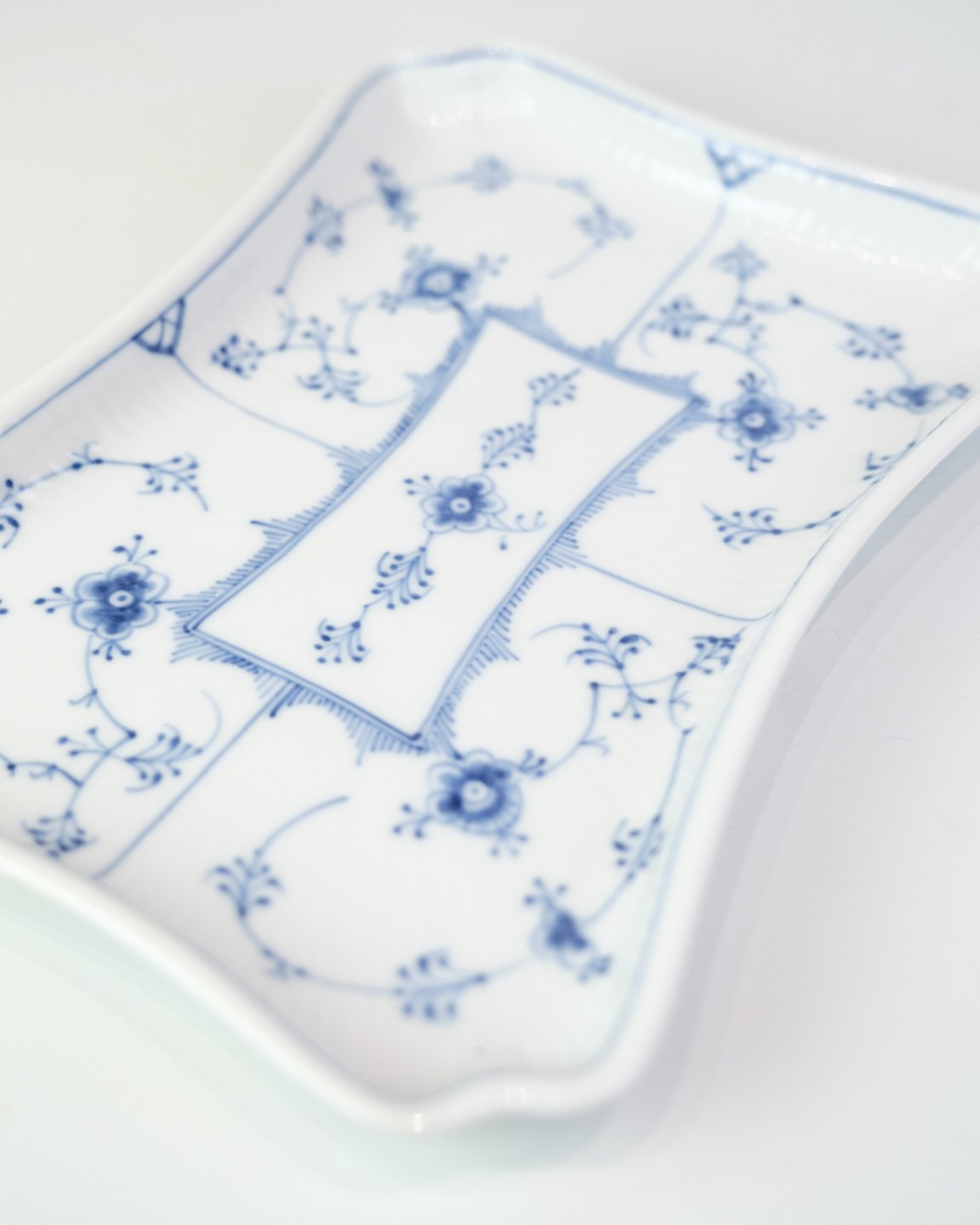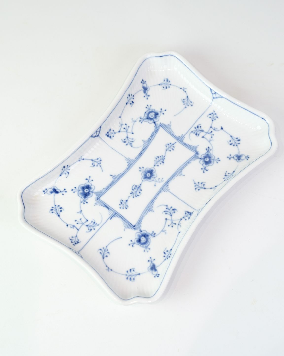 Elegant bakke fra Royal Copenhagen i det klassiske musselmalede riflet stel, designet af Arnold Krog. Udført i håndmalet porcelæn med blå dekoration og den karakteristiske riflede overflade. Modellen er No. 1/269 og fremstår i 1. sortering.