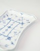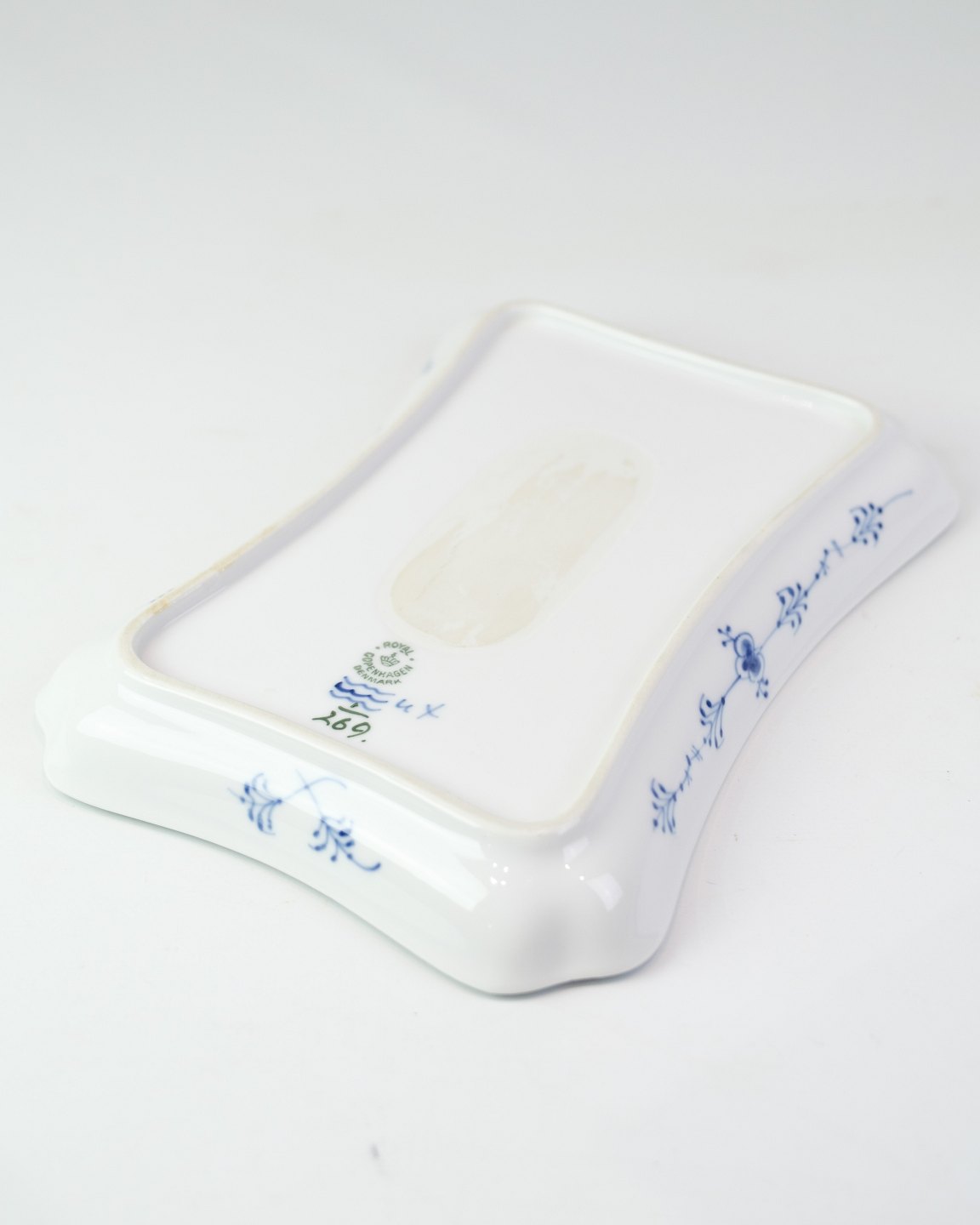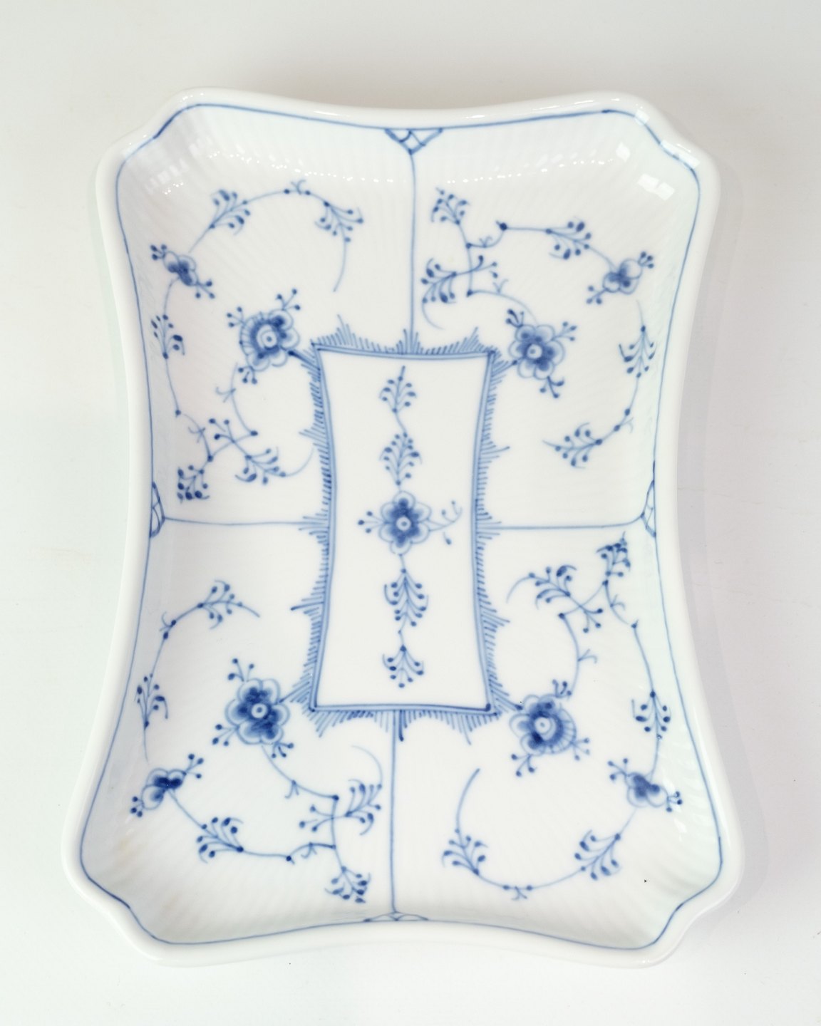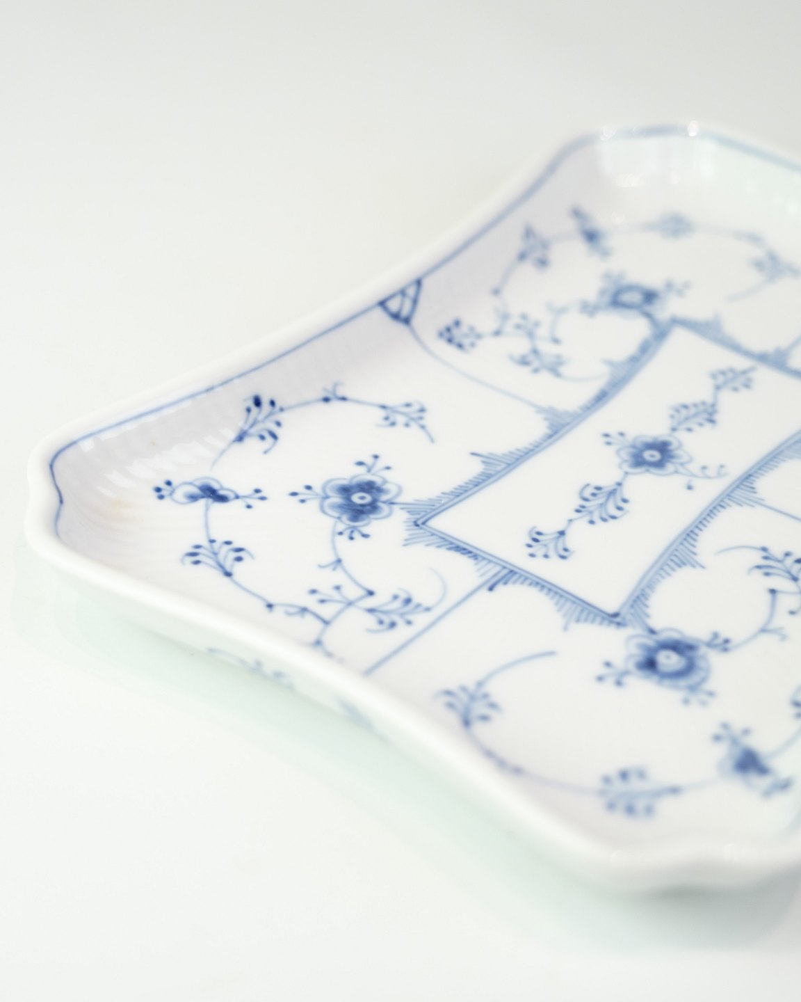 Elegant bakke fra Royal Copenhagen i det klassiske musselmalede riflet stel, designet af Arnold Krog. Udført i håndmalet porcelæn med blå dekoration og den karakteristiske riflede overflade. Modellen er No. 1/269 og fremstår i 1. sortering.