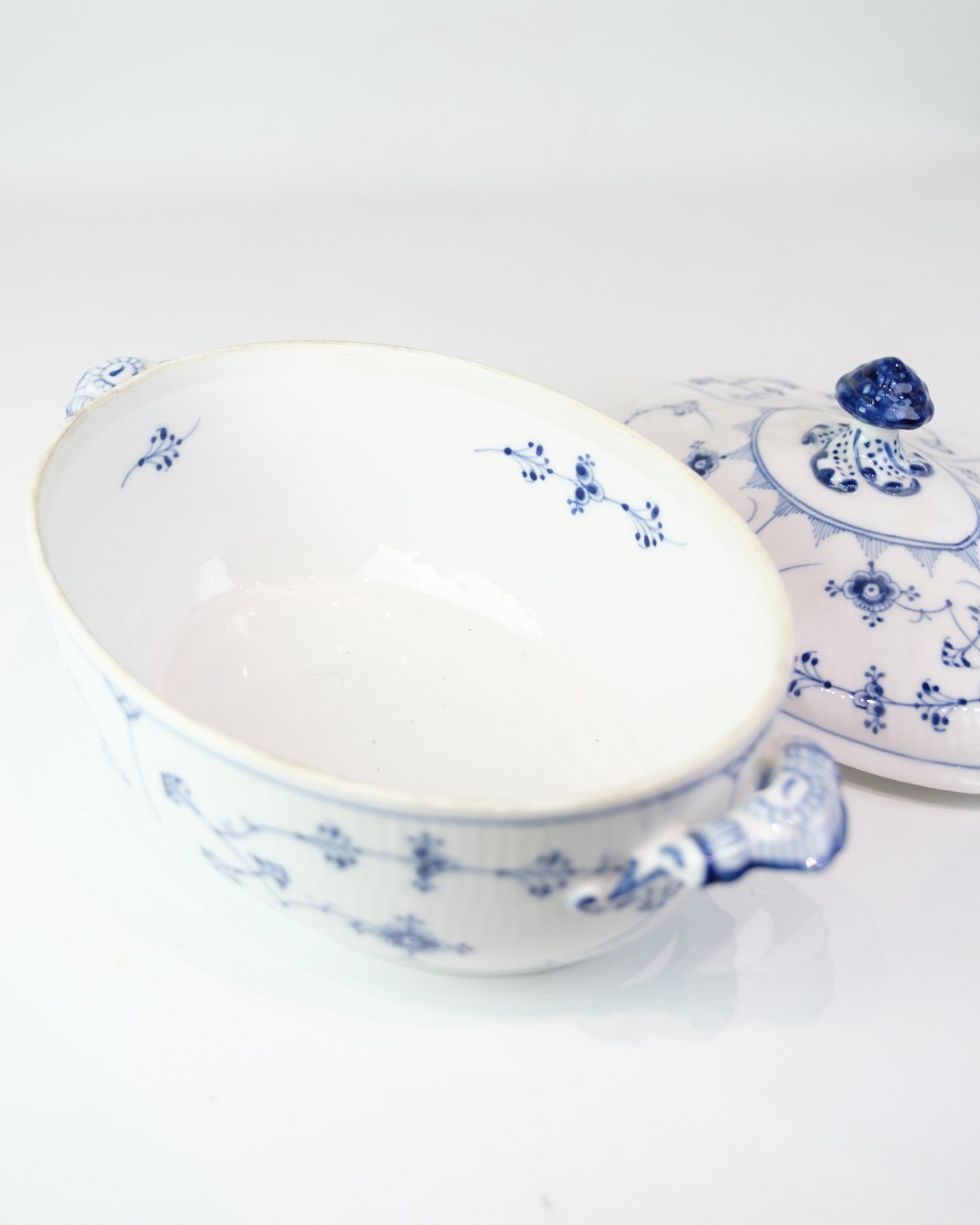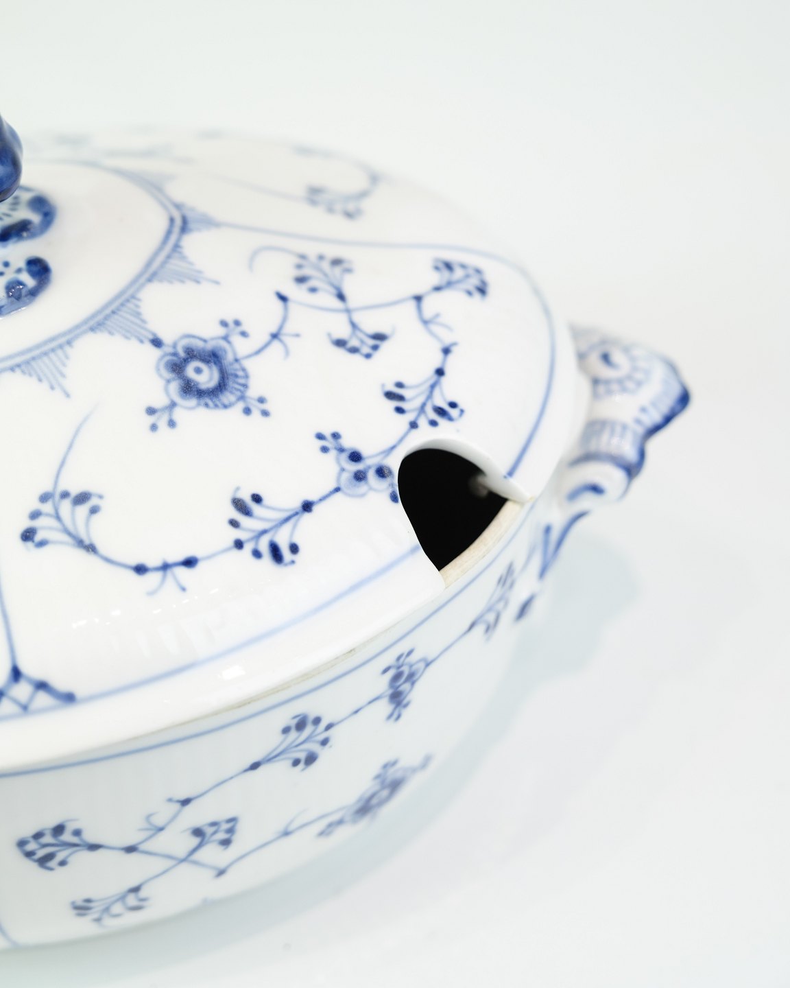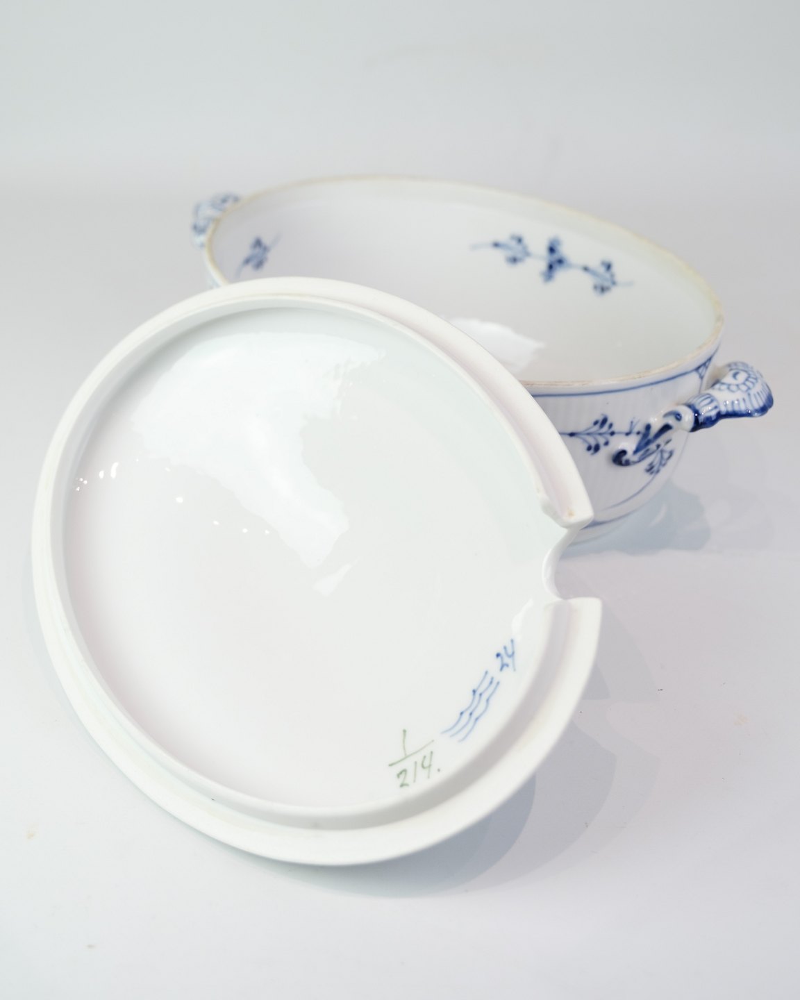 Klassisk terrin fra Royal Copenhagen i det tidløse musselmalede riflet mønster. Modellen er No. 214 og dateres til omkring 1950.