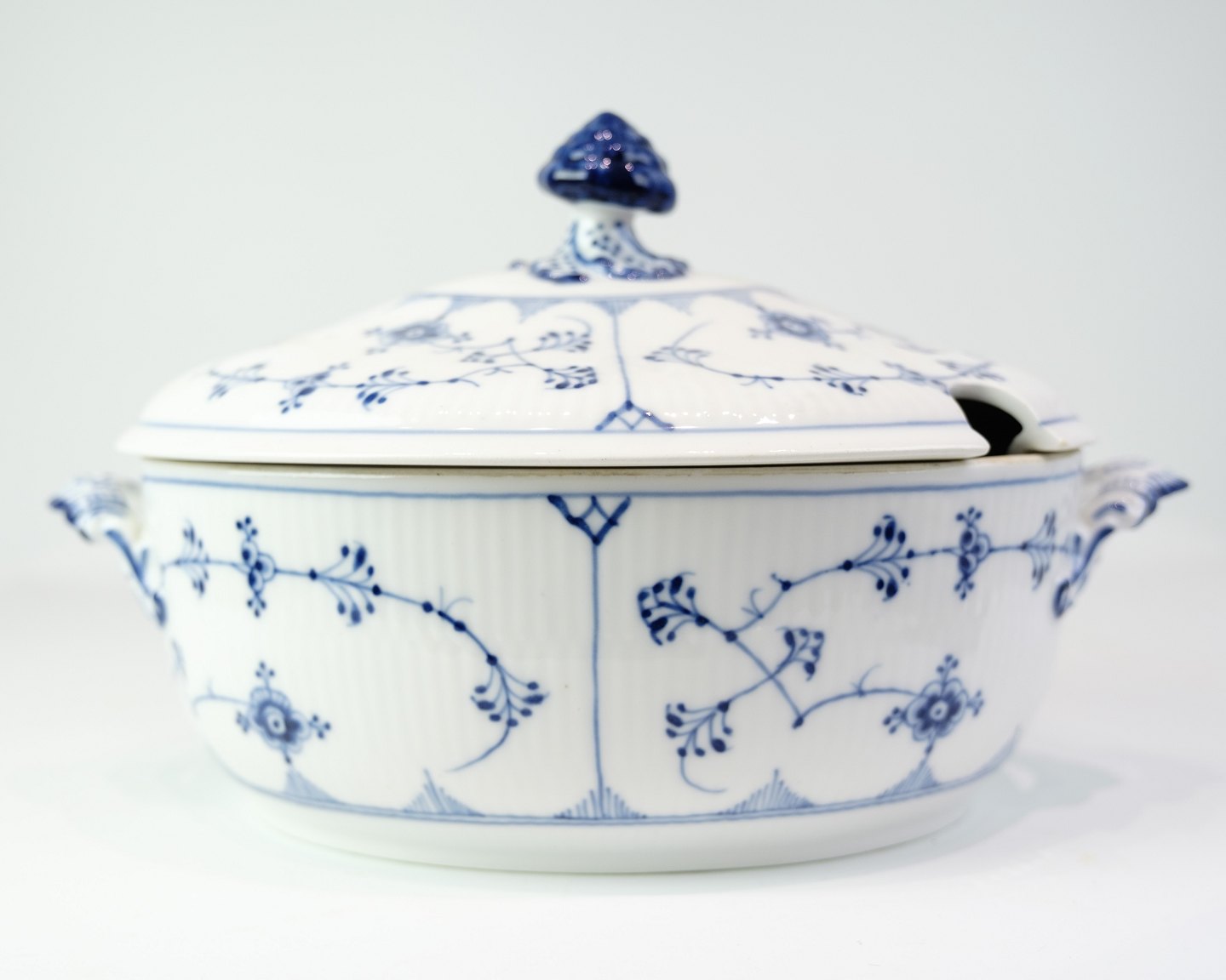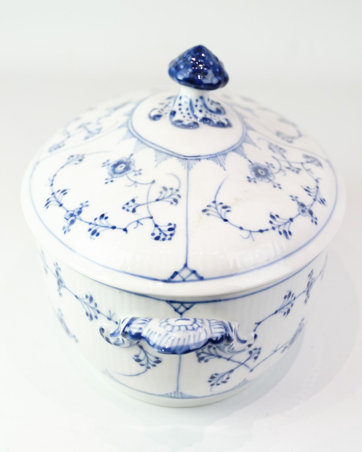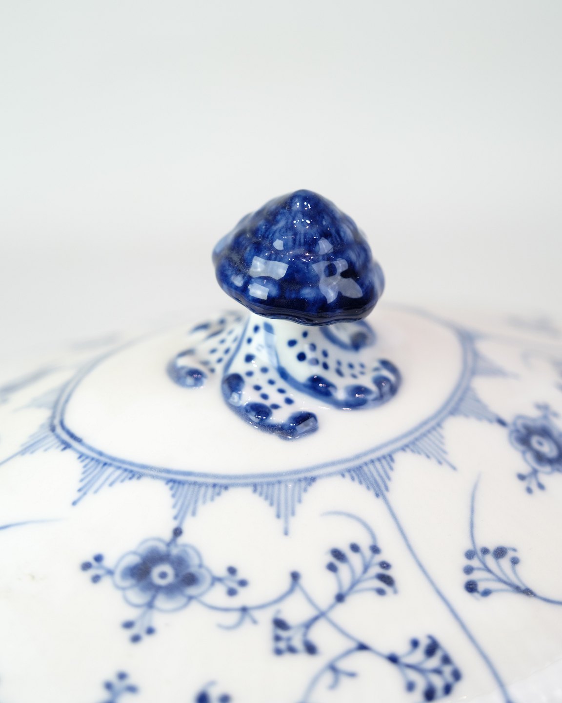Klassisk terrin fra Royal Copenhagen i det tidløse musselmalede riflet mønster. Modellen er No. 214 og dateres til omkring 1950.