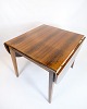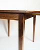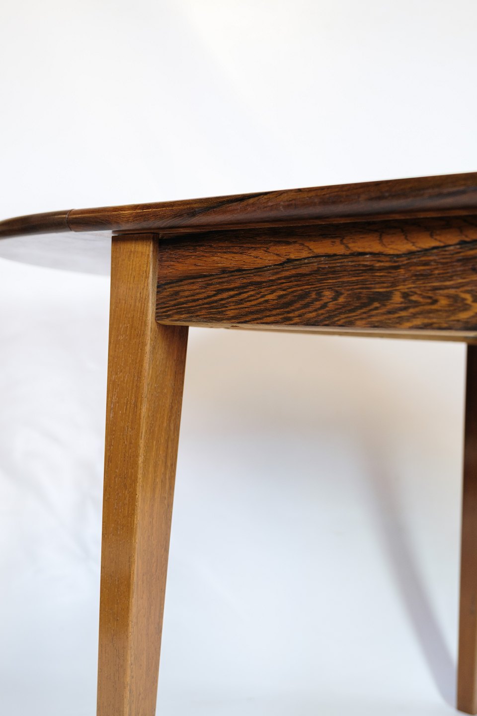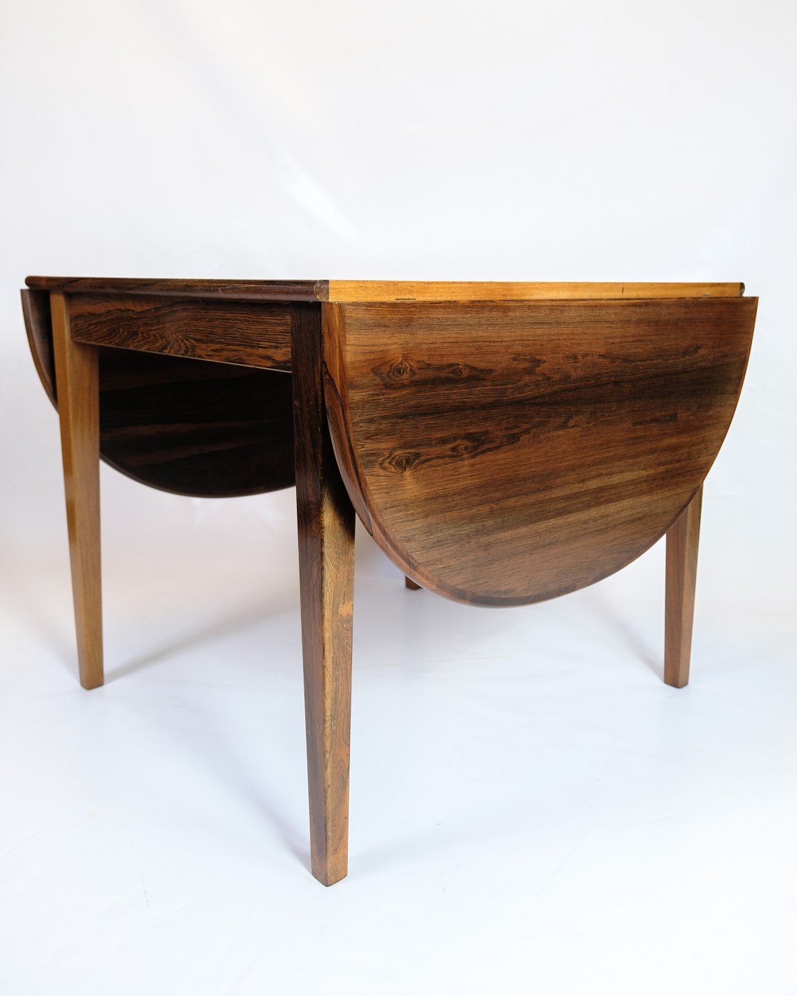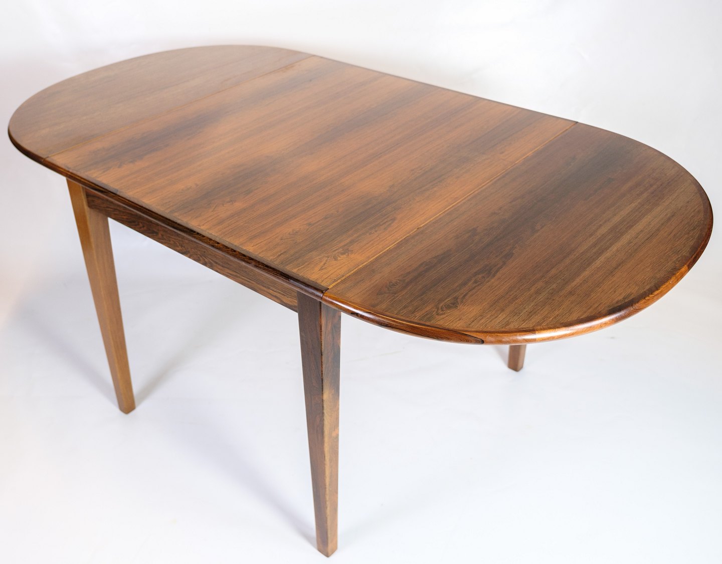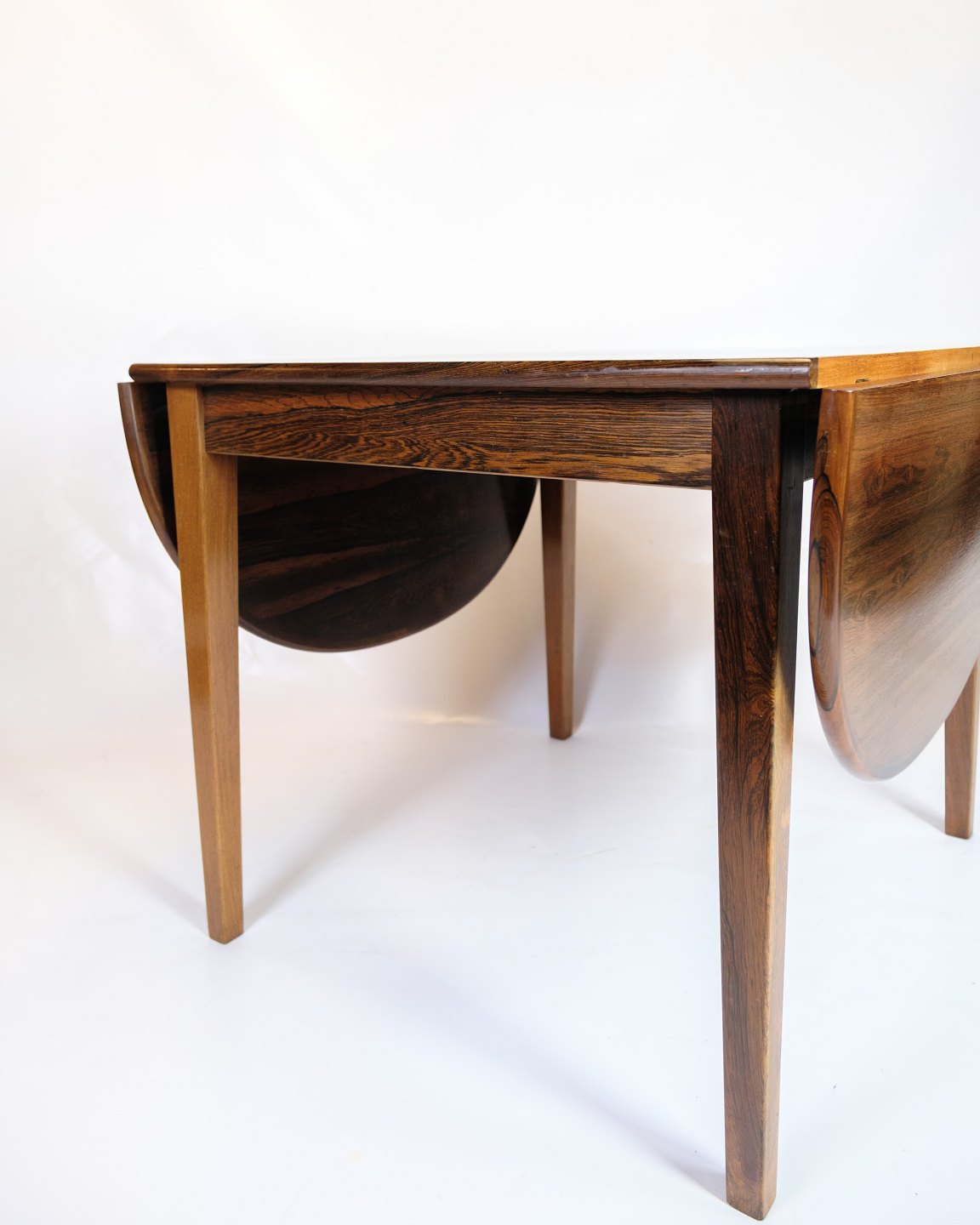 Dining table from the 1960s made of rosewood with beautiful and vibrant grain. The table has two oval folding sides, which makes it ideal for both small and large rooms, depending on your needs.