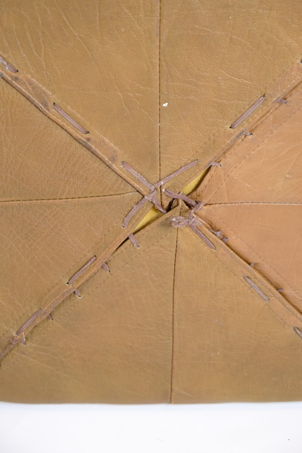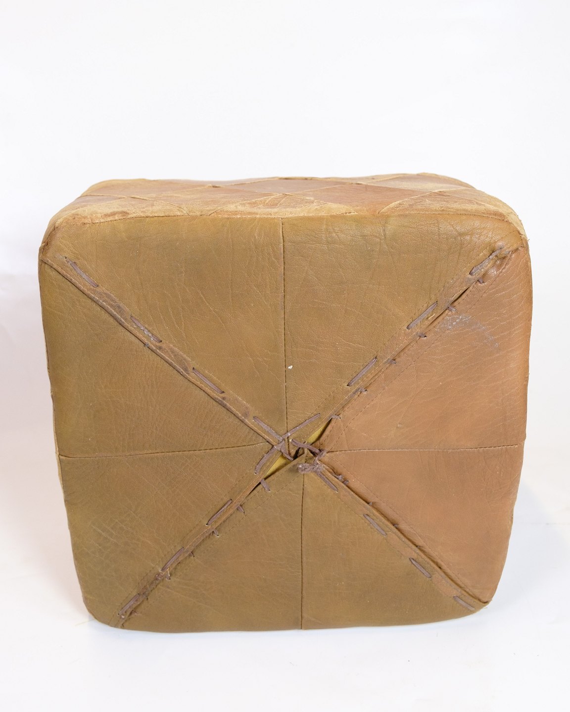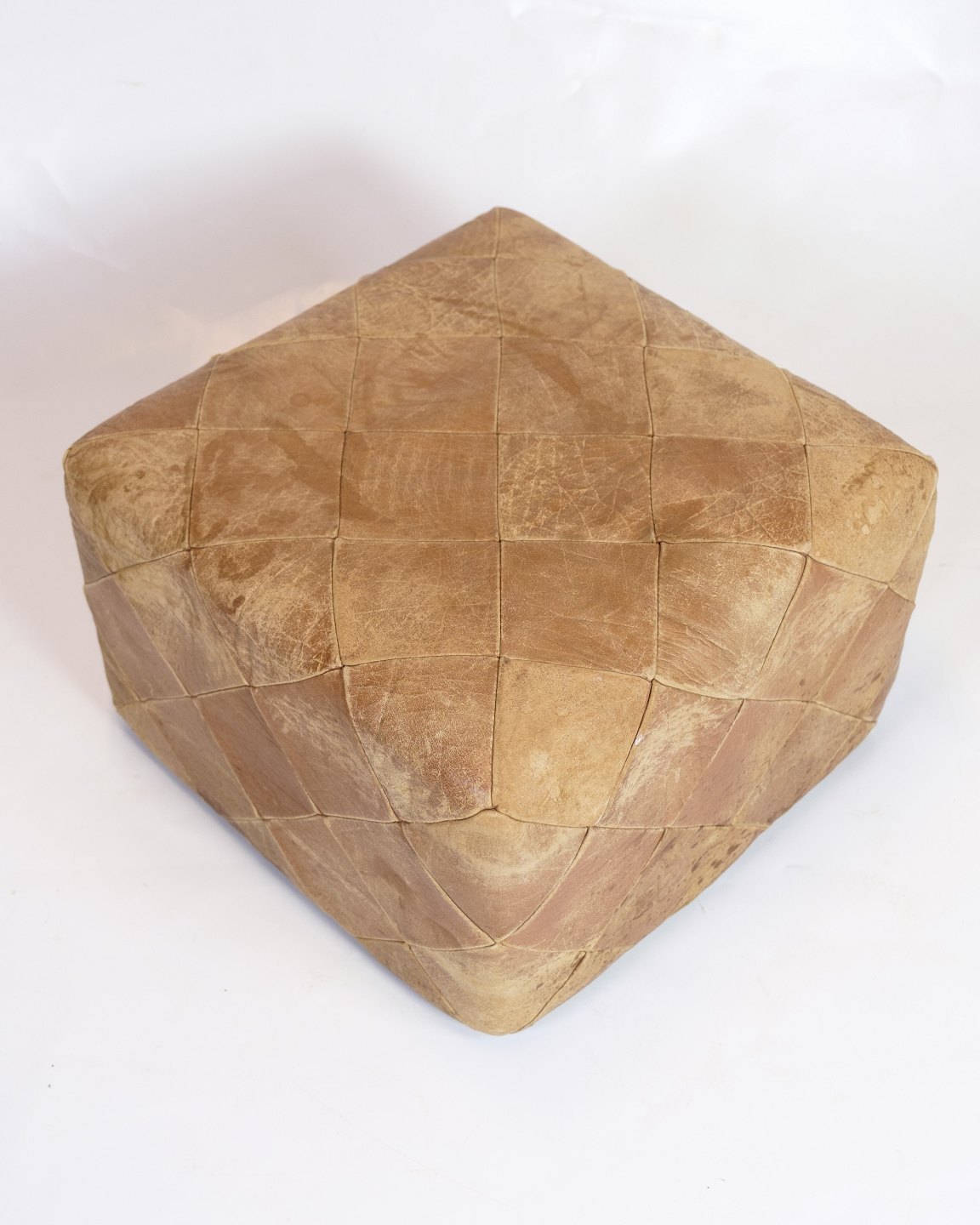 Vintage square leather pouf from the 1970s in natural leather with a beautiful patina. Hand-stitched surface in a geometric pattern.