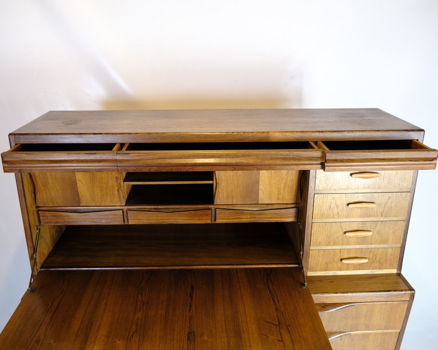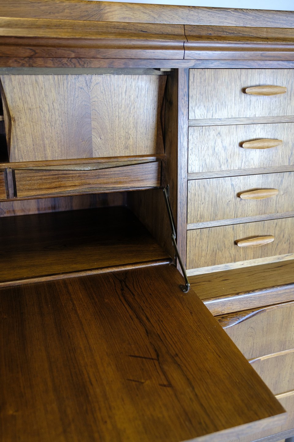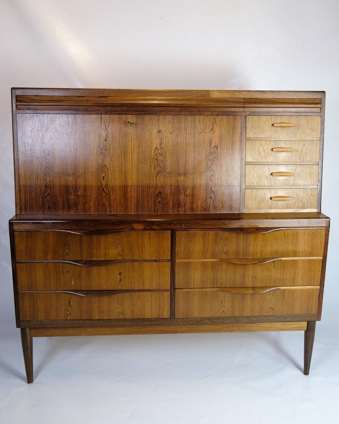 Chatol designed by Erling Torvits and made of rosewood. The upper part opens with a hinged door and has built-in drawers, open compartments, letter shelves and three integrated “secret” drawers in the top section. At the bottom, six spacious drawers with molded handles.