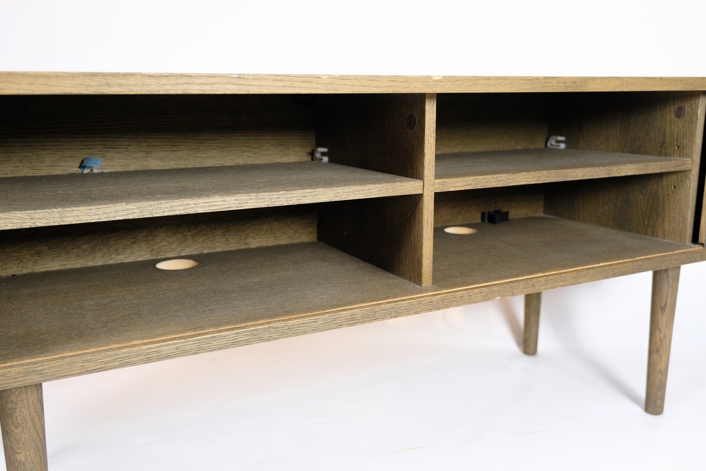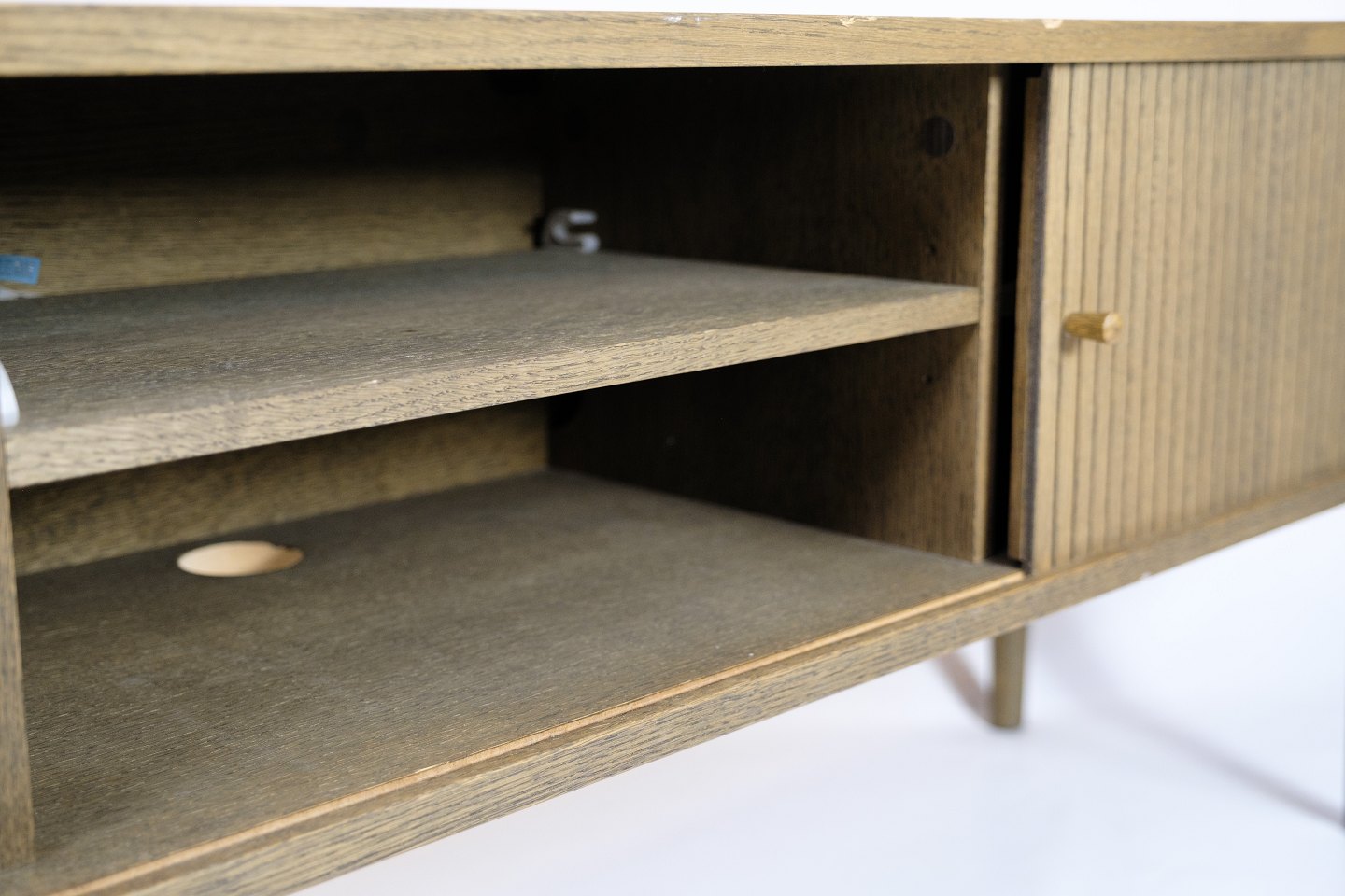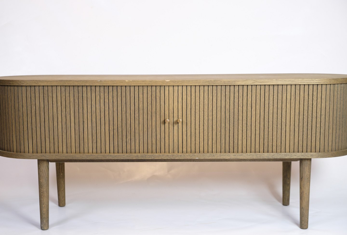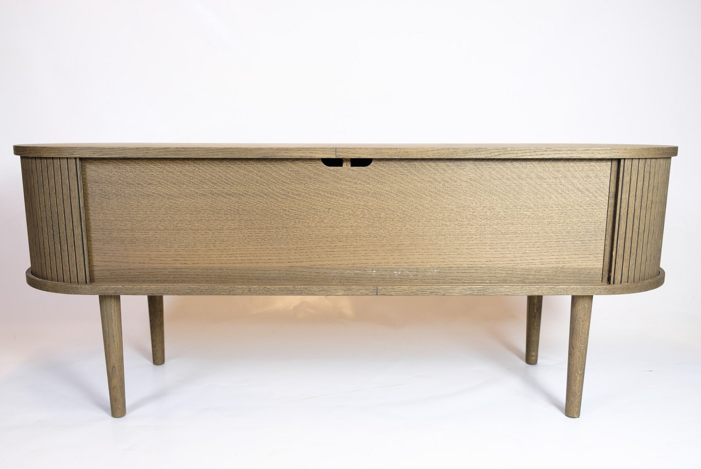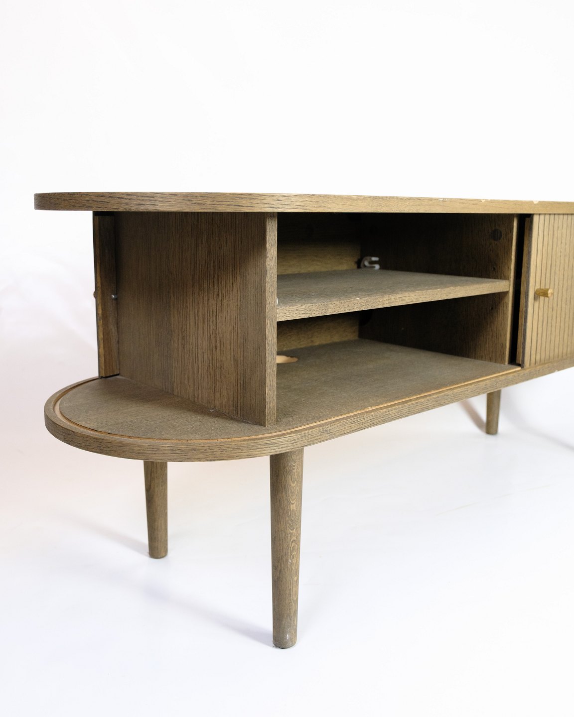 SolgtTV-møbel i gråolieret eg med jalousilåger og rundede former. Dansk design.