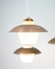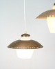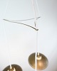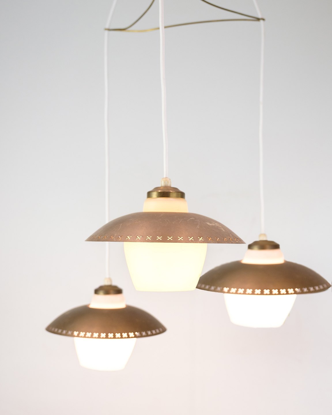 Ceiling lamp by Bent Karlby from the 1950/60s with three pendants in opal glass and brass.
