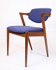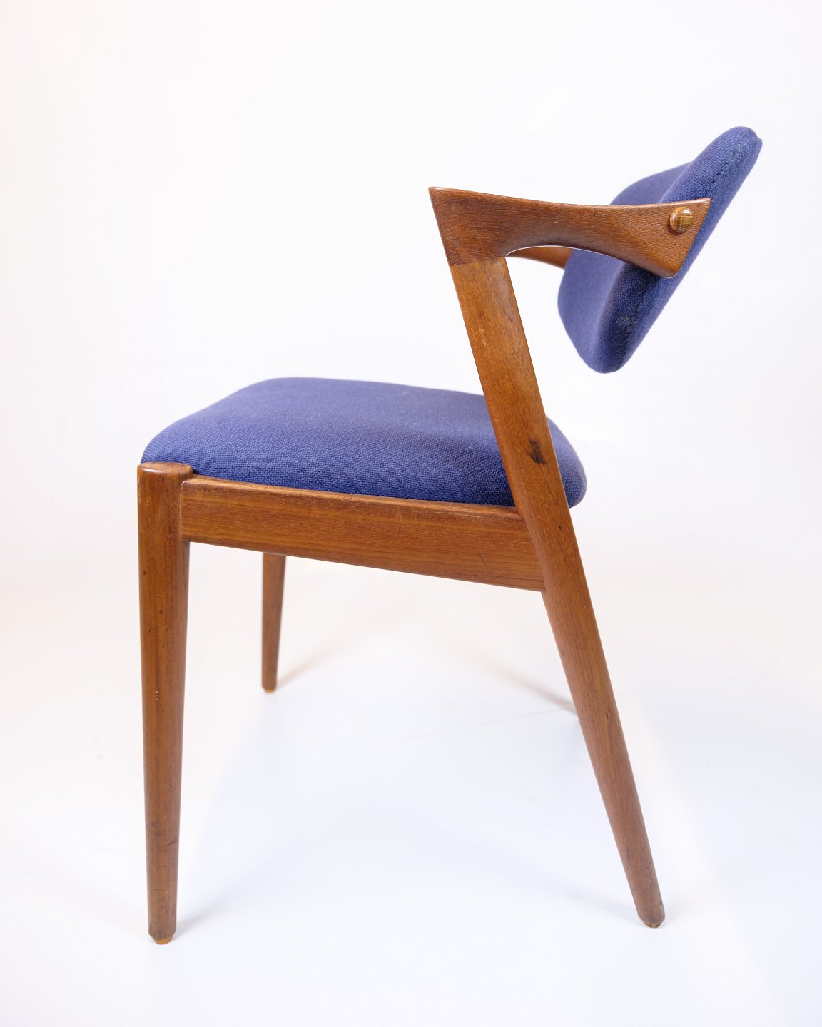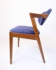 Sæt af seks spisebordsstole, model 42, designet af Kai Kristiansen og produceret af Schou Andersen i 1960’erne. Stolene er udført i teak med det karakteristiske elegante og organiske formsprog, som kendetegner Kristiansens design. Sæderne er polstret med blåt stof.