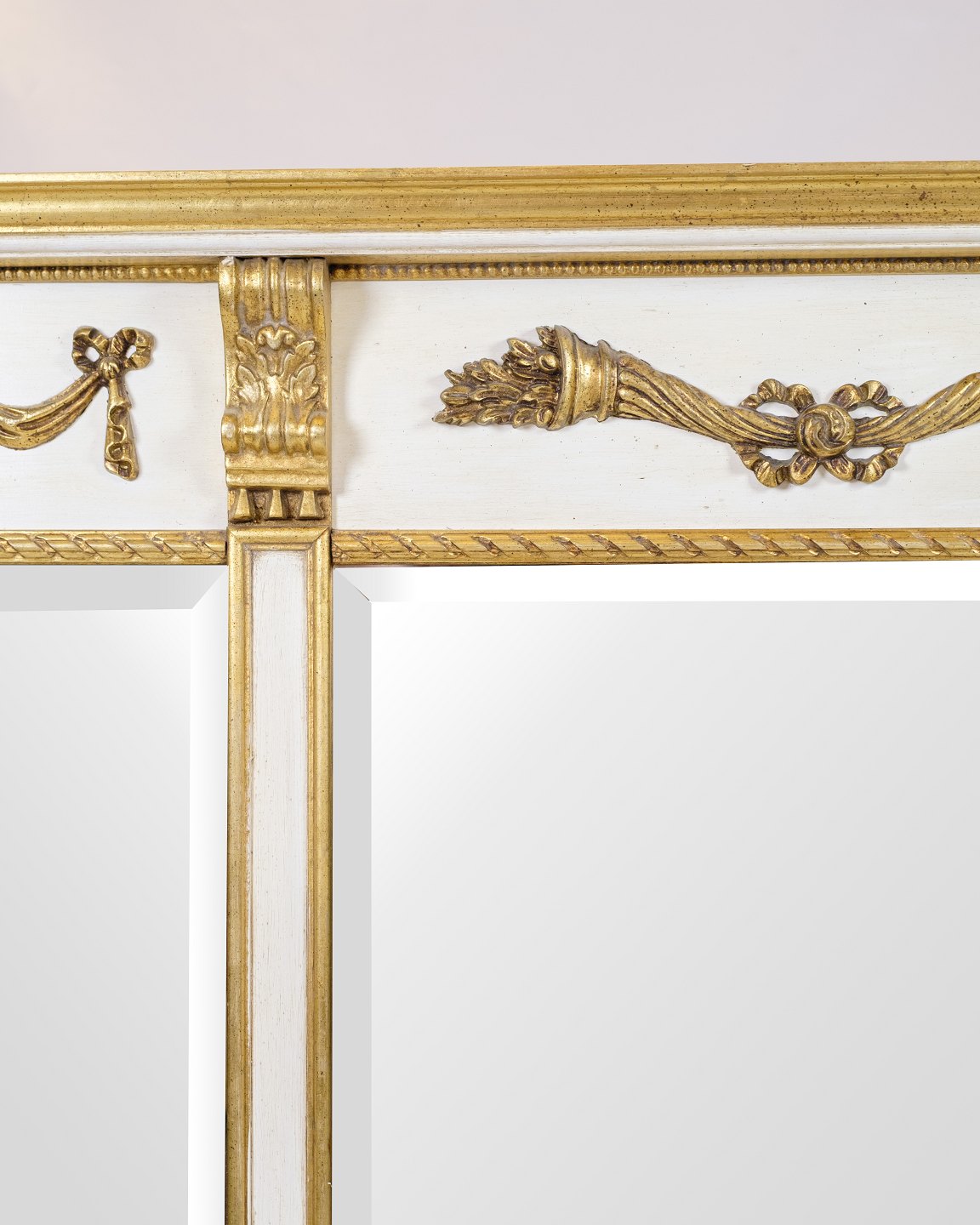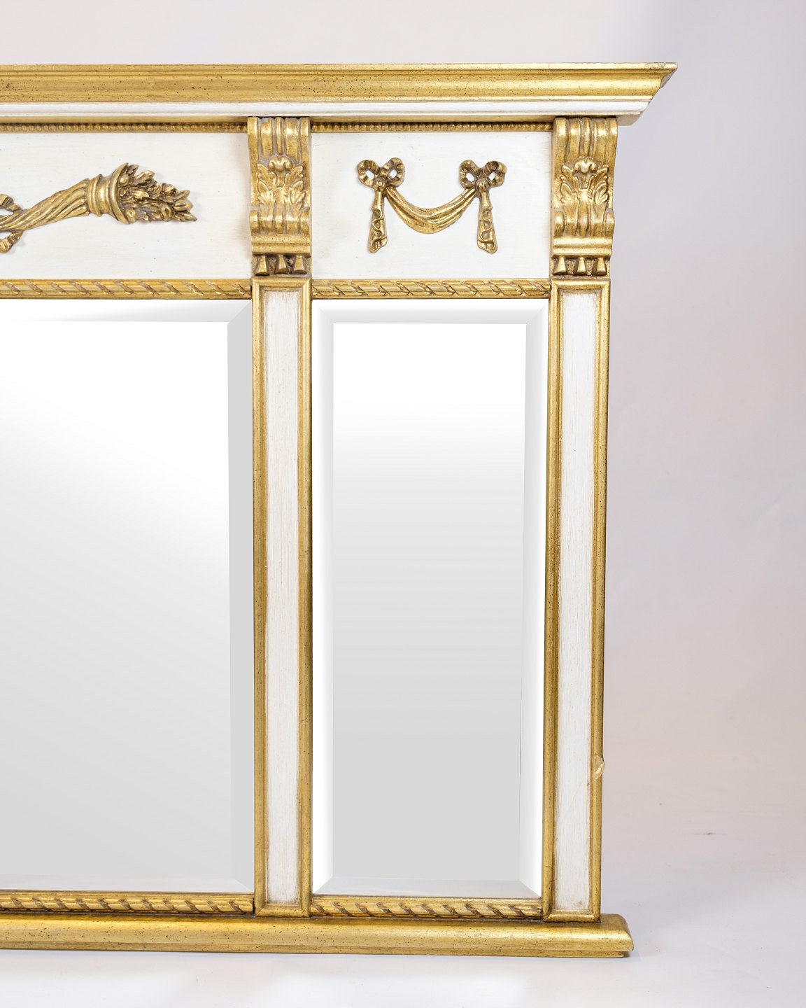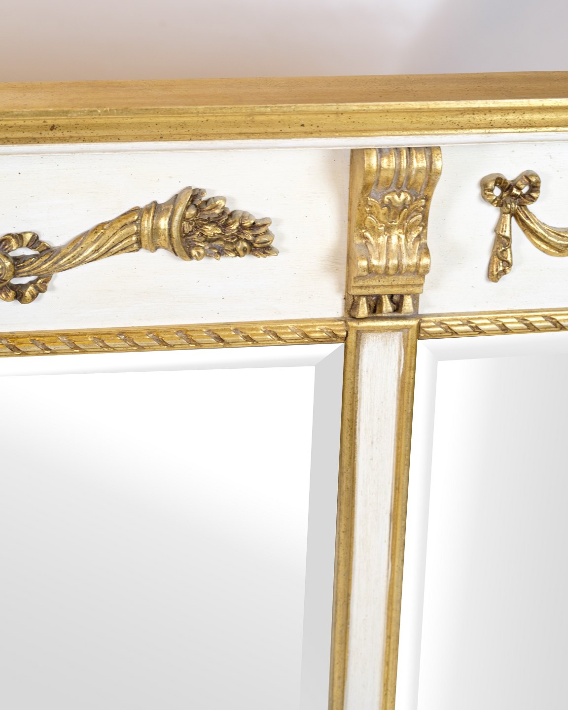Large wall mirror in empire style with gilded frame in white and gold. The mirror is decorated with decorative ornaments that give a classic and elegant expression.