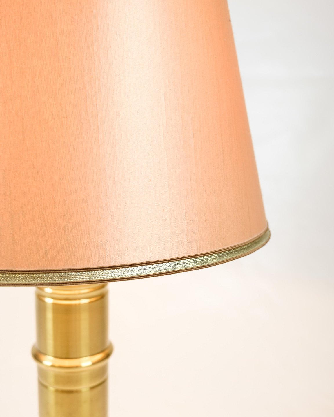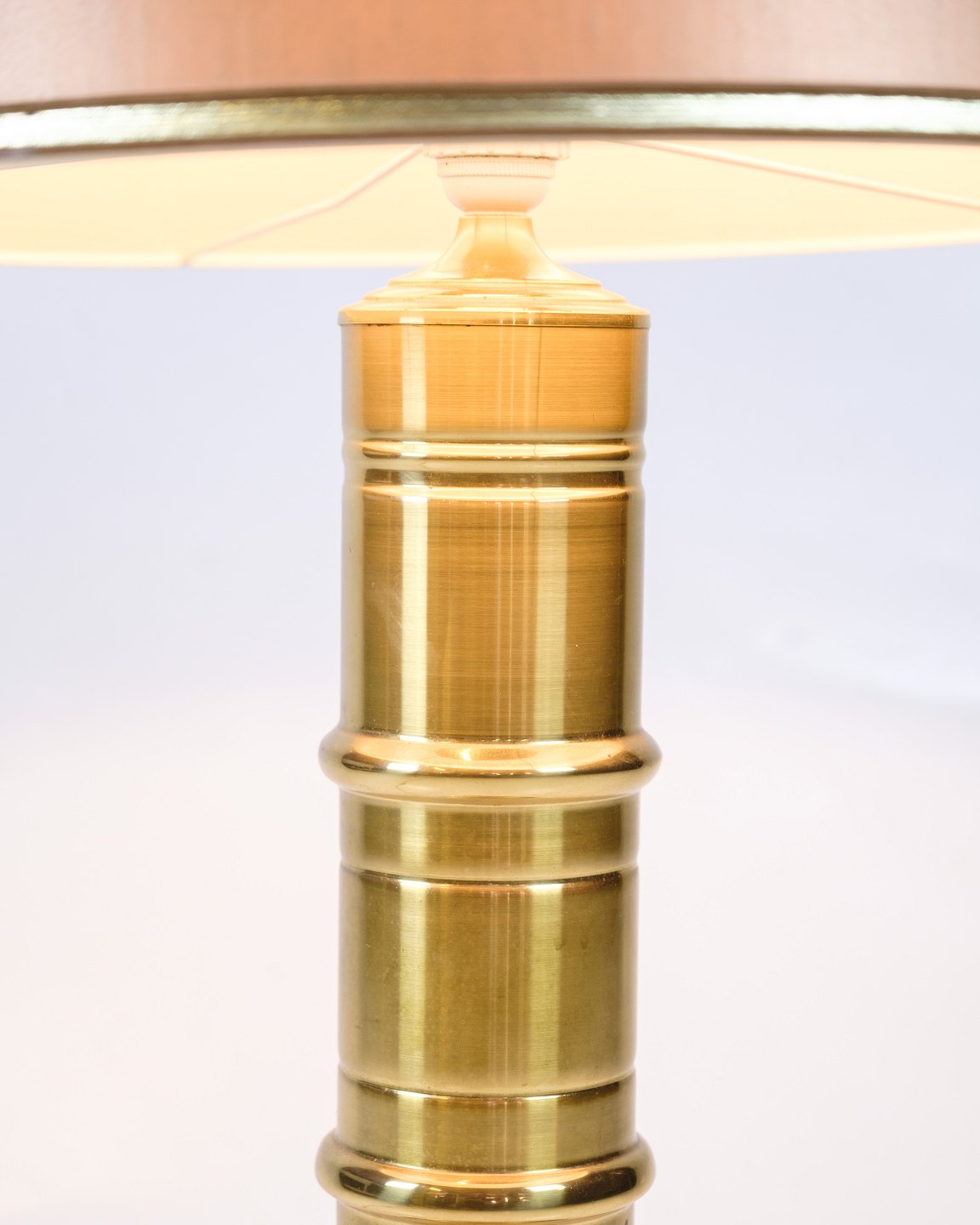 SoldSet of 2 vintage table lamps from the 1970s with brass feet and pink lampshades. Classic retro design.