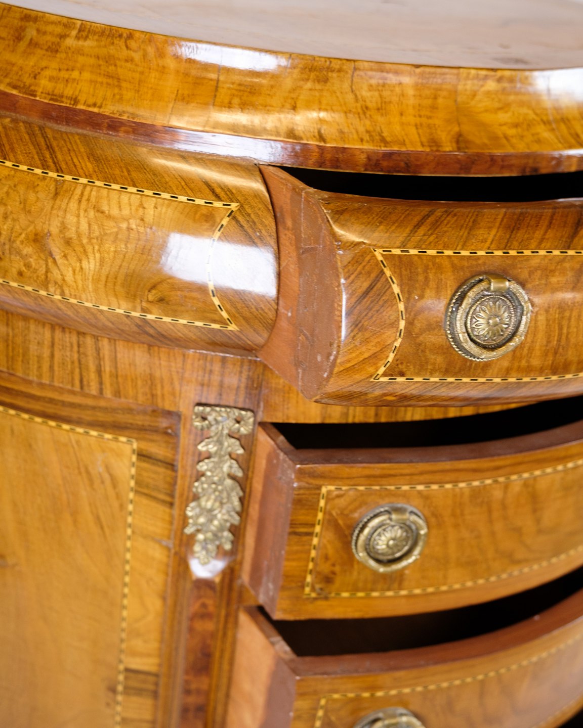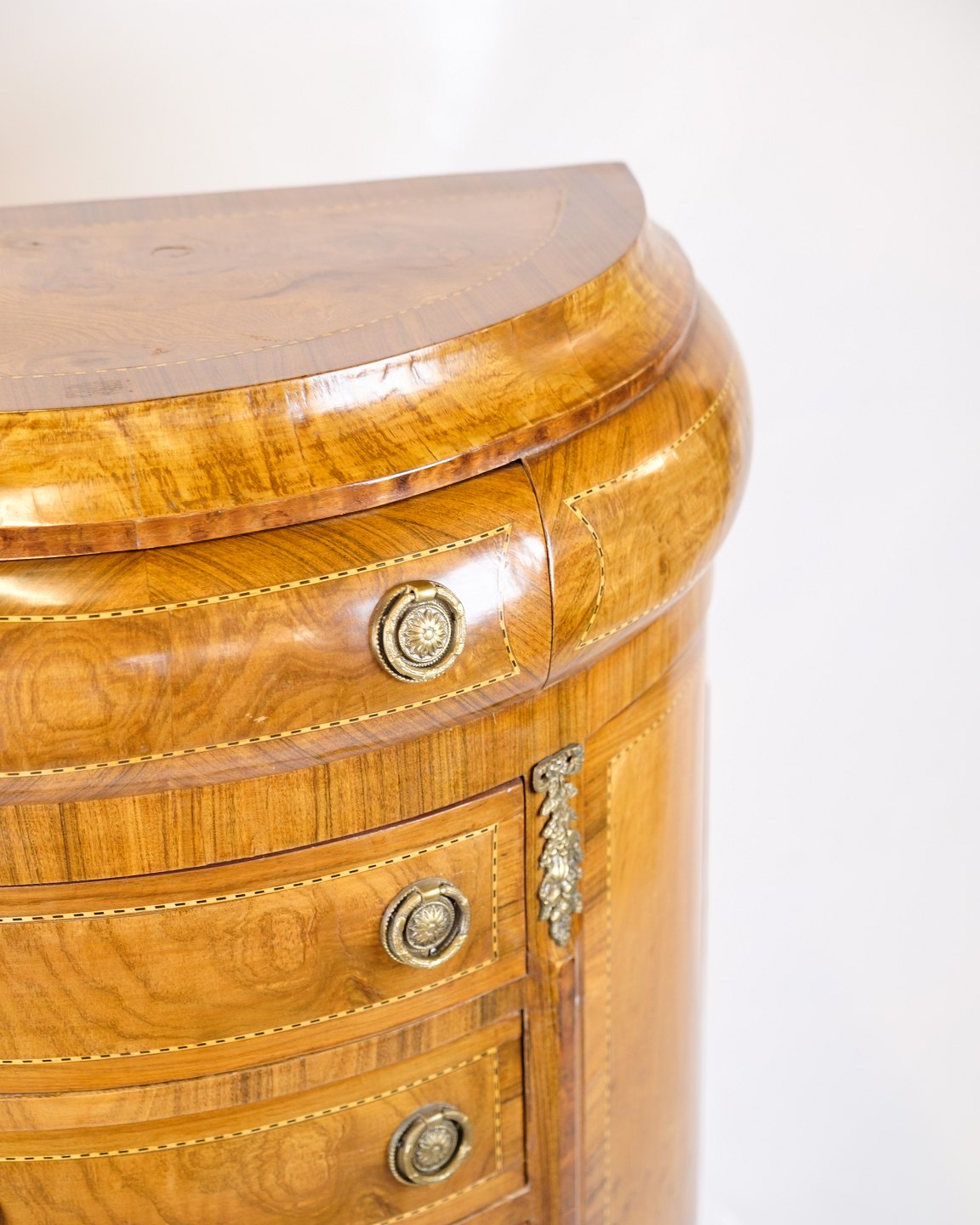 Antik høj kommode fra 1890’erne udført i klunkestil. Kommoden er fremstillet i rosentræ med smuk buet front og originale messinggreb.