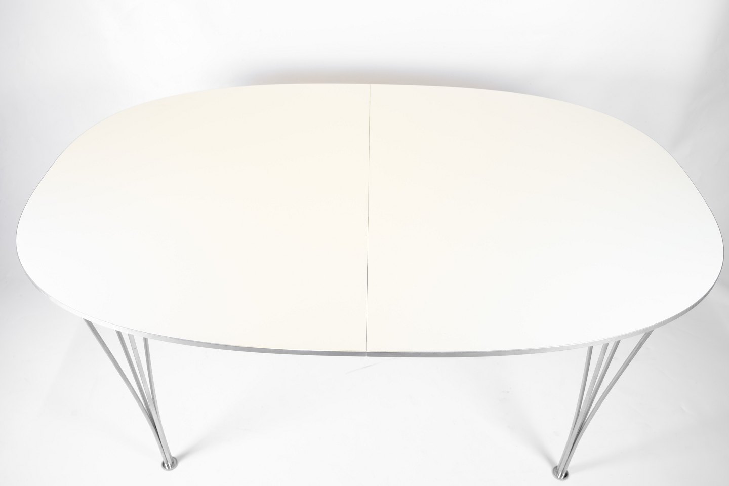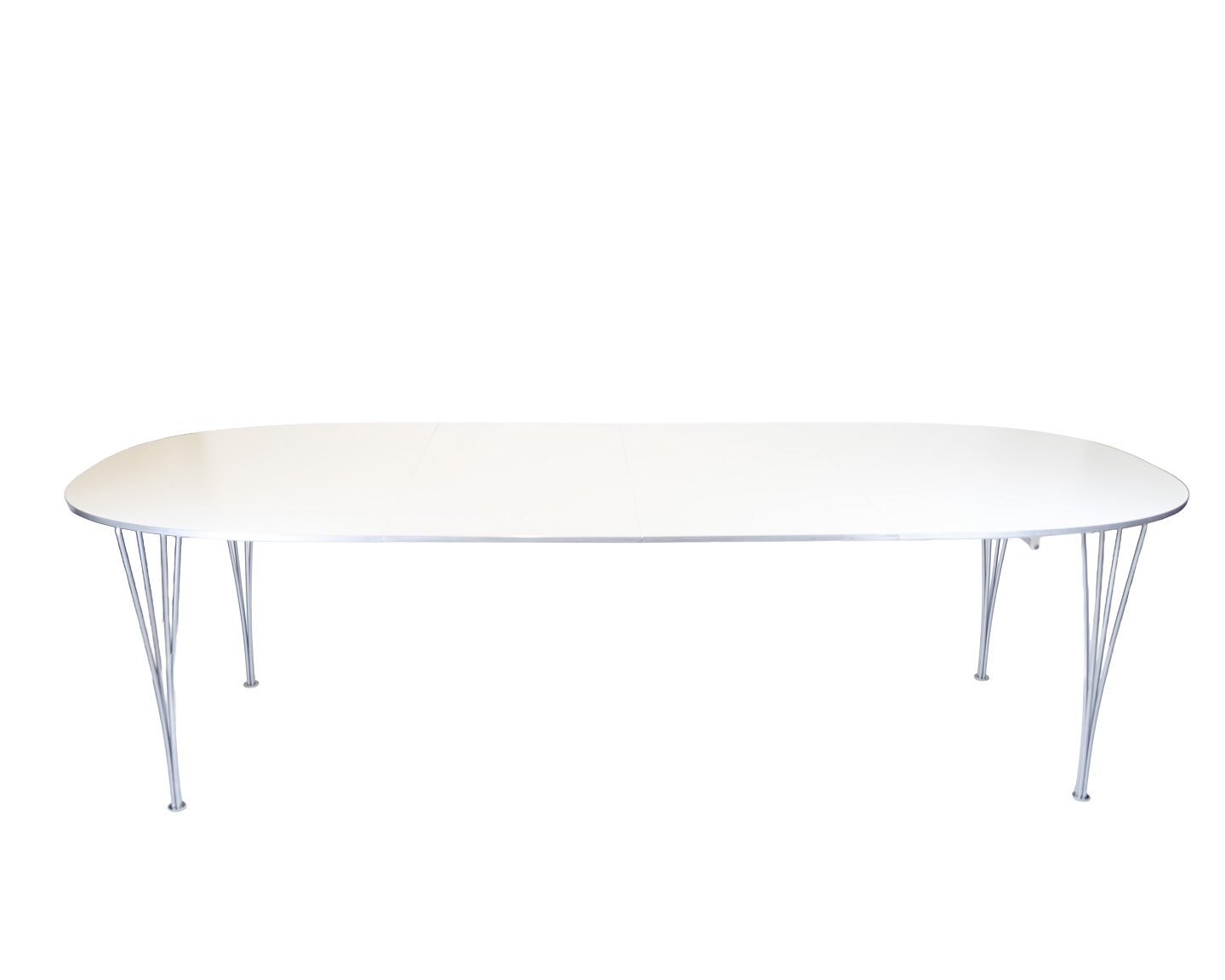 Superellipse dining table by Piet Hein & Arne Jacobsen for Fritz Hansen. White laminate with 2 extension leaves. Produced in 2005