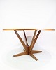 Round teak coffee table, designed by Holger Georg Jensen and produced by Kubus in the 1960s. The tabletop is made of teak veneer with a beautiful star-patterned grain, which gives the table an exclusive and vibrant expression. The base has a distinctive design that both emphasizes the sculptural character of the table and provides a solid construction.