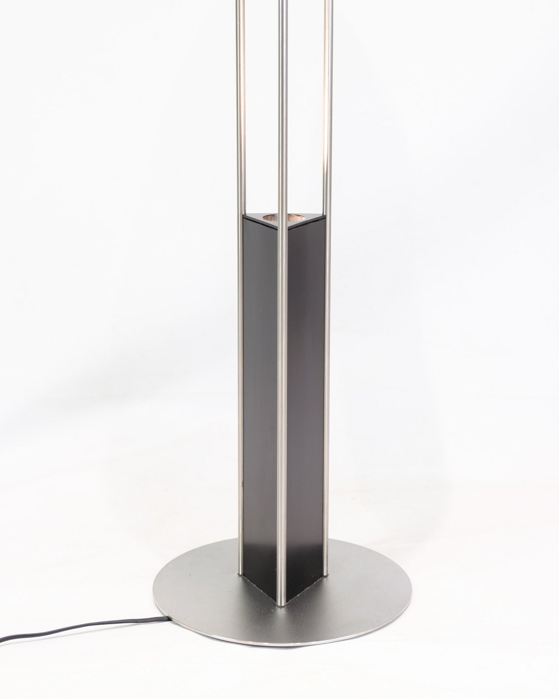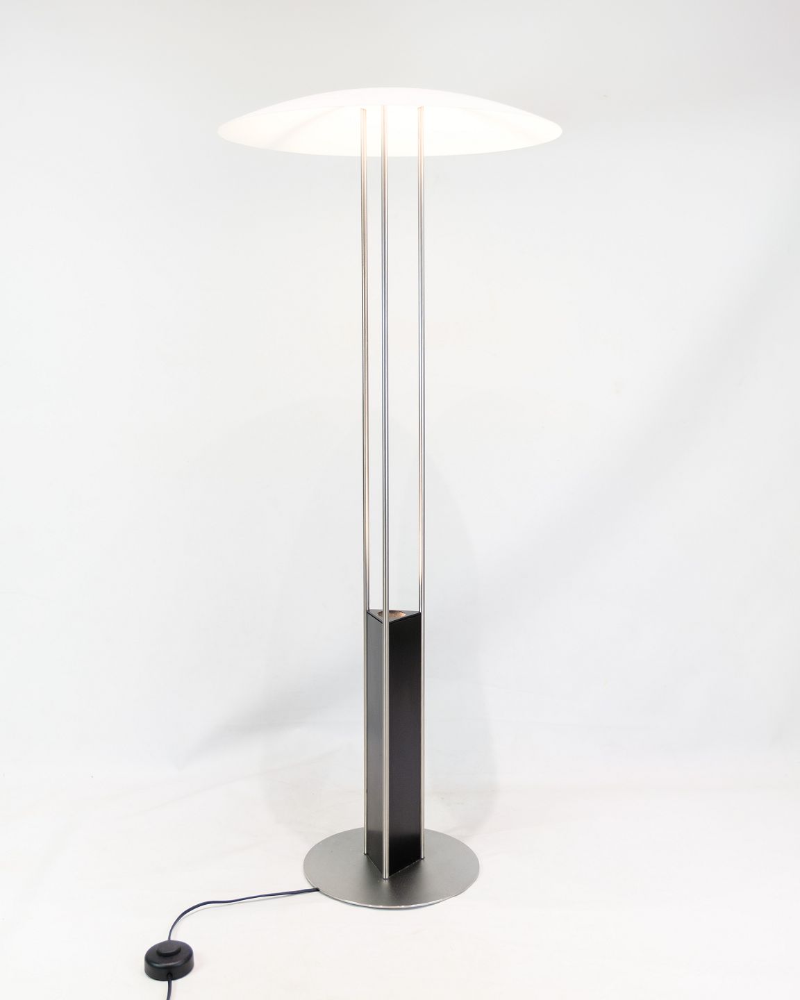 Gino gulvlampe, model Gino, designet af Bjarne Frost og Ole Jespersen i 1980’erne og produceret af Nordisk Solar Compagni. Stellet er forkromet metal og top skærmen er lavet af hvidlakeret metal.