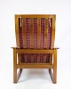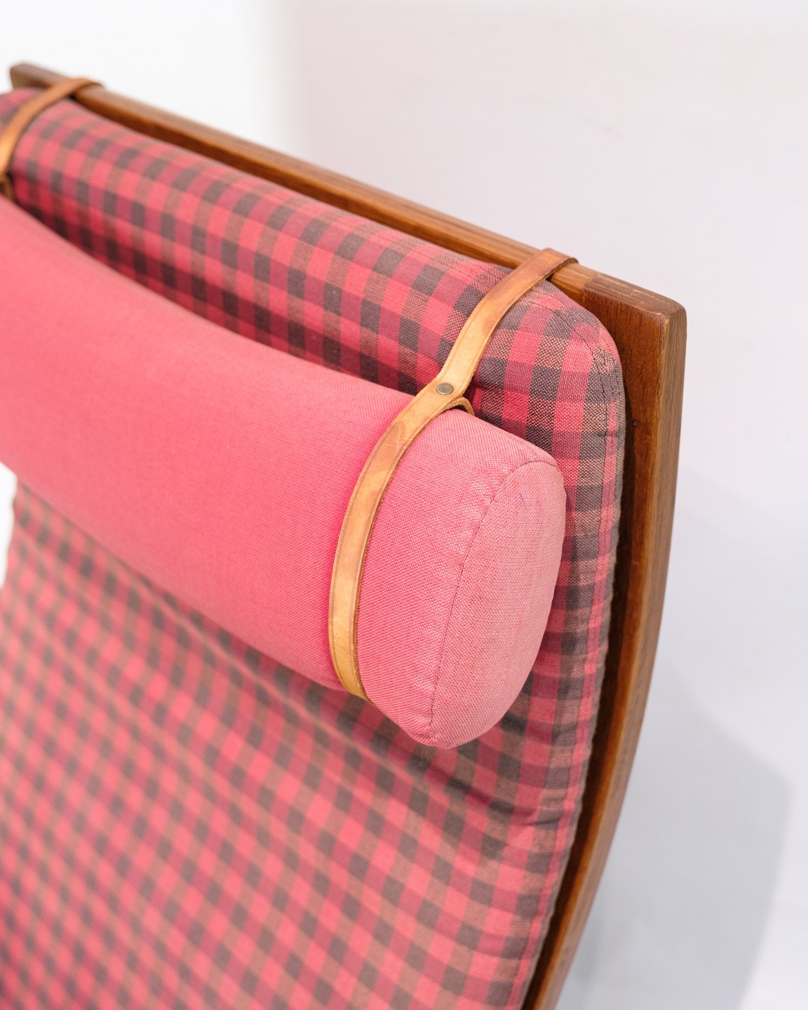 Original Slædestol, model BM2254, designet af Børge Mogensen i 1958 og udført af Fredericia Stolefabrik. Stolen er lavet i olieret egetræ med tappede samlinger og løse hynder i rødt/ternet stof samt nakkepude.