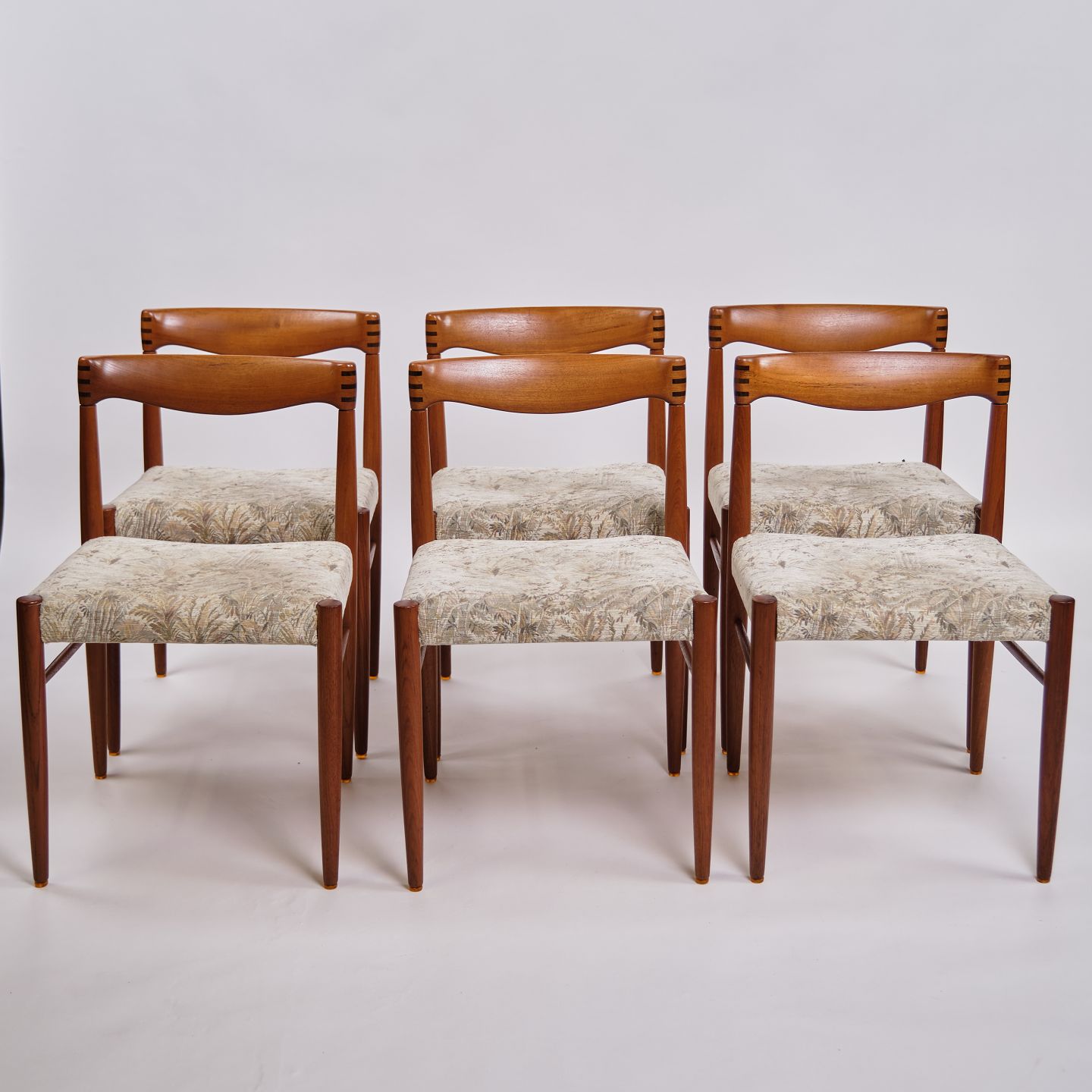 Sæt af seks spisebordsstole af Henry W. Klein for Bramin. Teaktræ og lys polstring. Danmark, 1960’erne. H: 75 cm, B: 48 cm, D: 43 cm, SH: 45 cm.