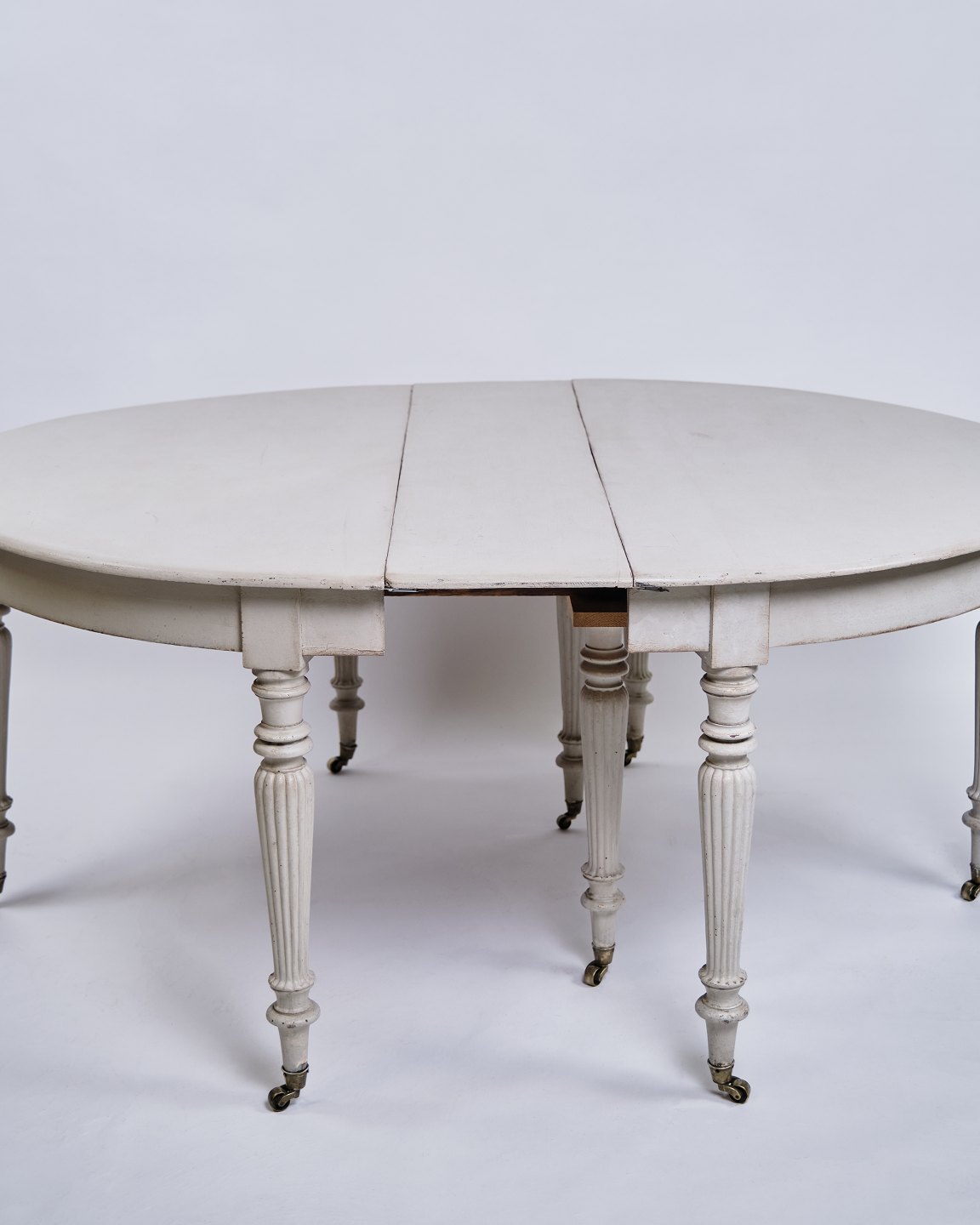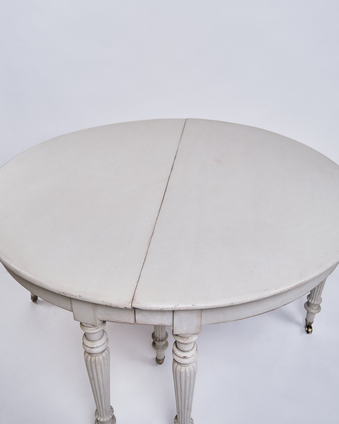 Gustaviansk rundt spisebord fra 1780’erne. Gråmalet med messinghjul. Med 1 plade á 30 cm og 4 á 60 cm.