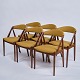 Sæt af seks spisebordsstole, model 31 af Kai Kristiansen. Teak med karry gul hallingdal polstring. Dansk design fra 1960.