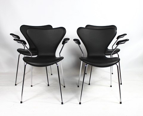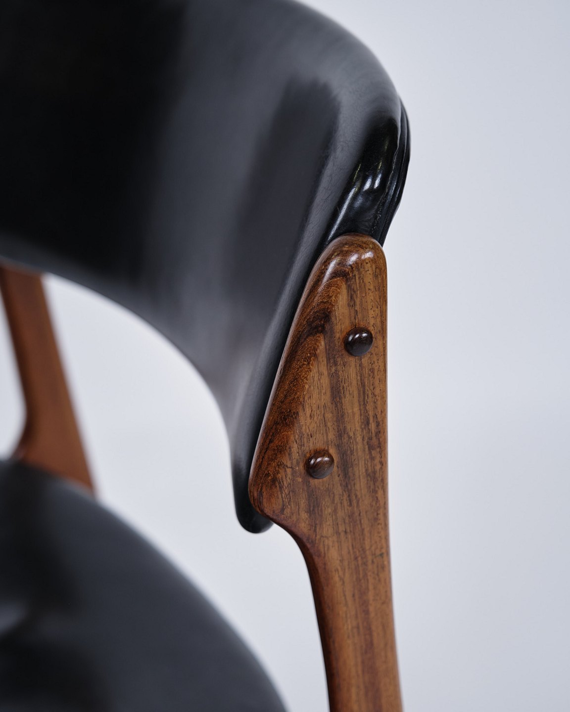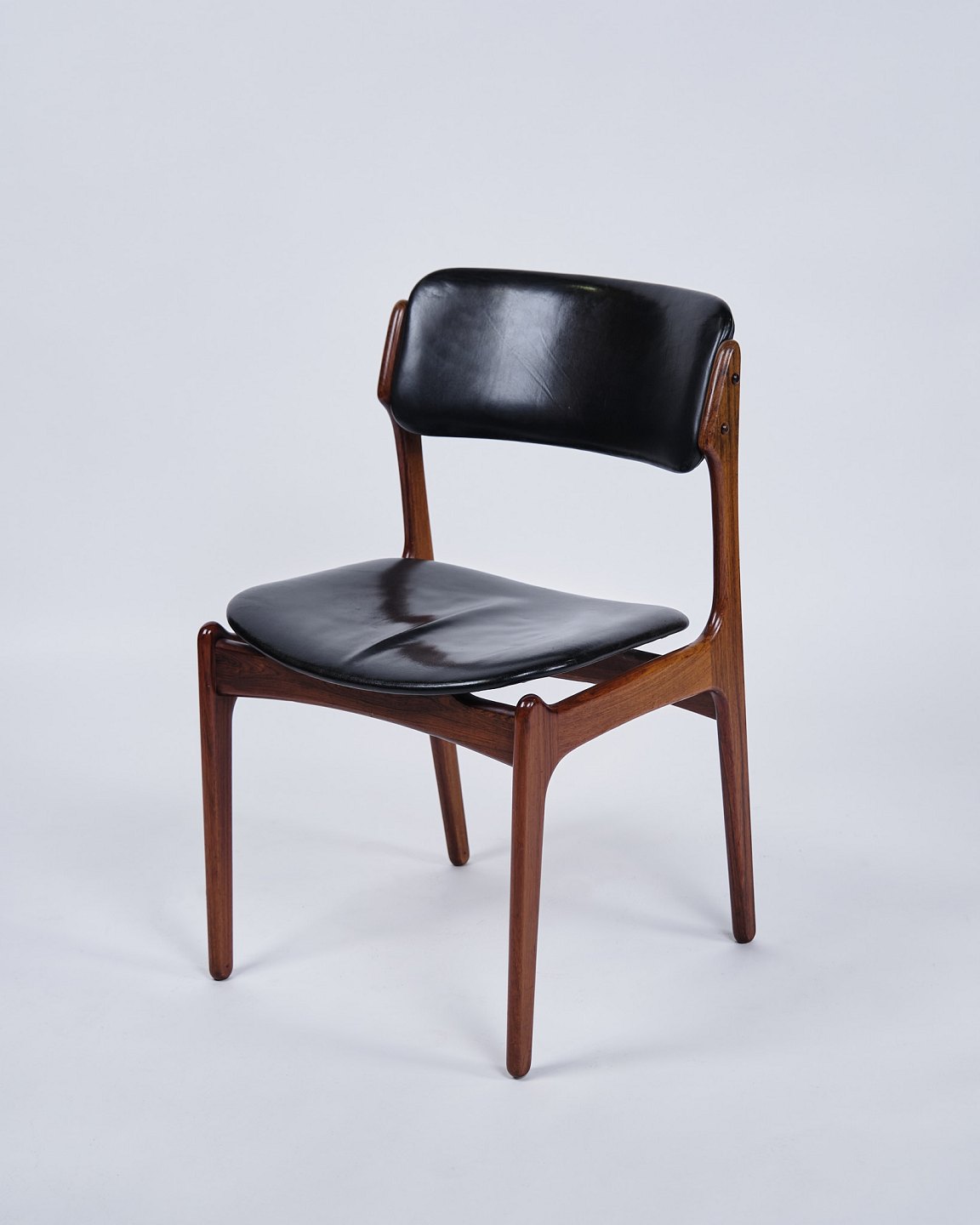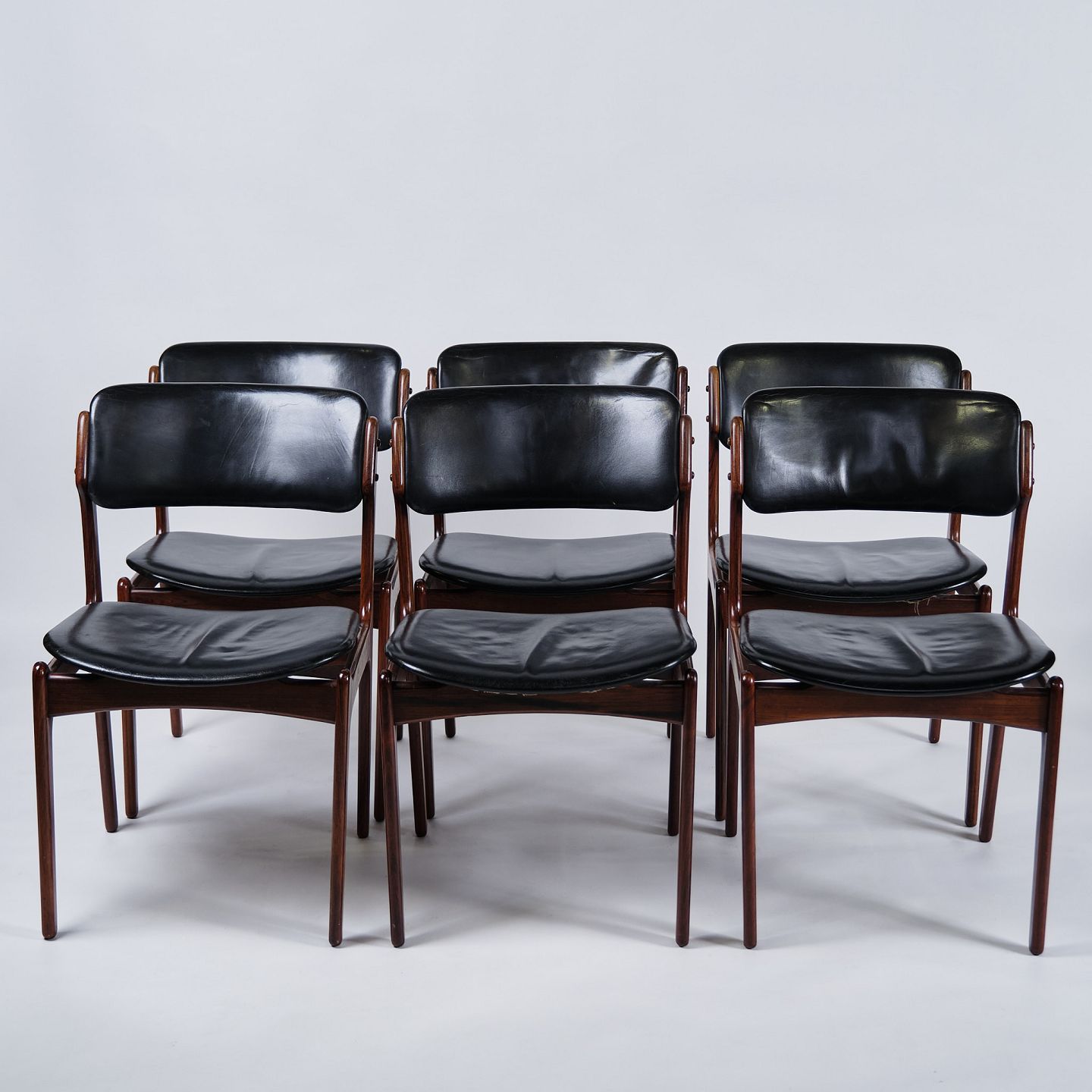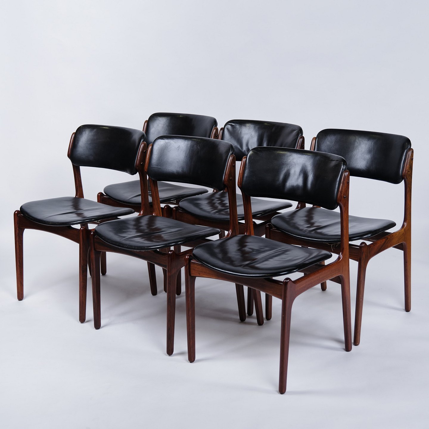 Set of six Erik Buch dining chairs, model OD49. Rosewood with black leather. O.D. Møbler, 1950s.
