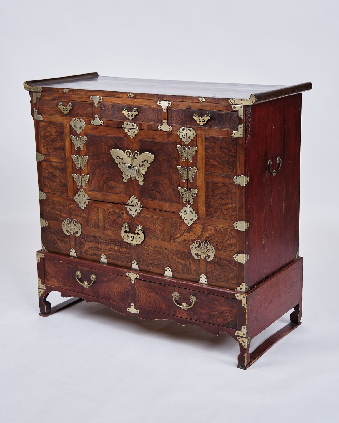 Antique Korean Bandaji chest/dresser from the 1900s, traditionally used as a wedding chest. Made of dark wood with decorative brass fittings, which highlight the craftsmanship and the rich cultural history of the chest.