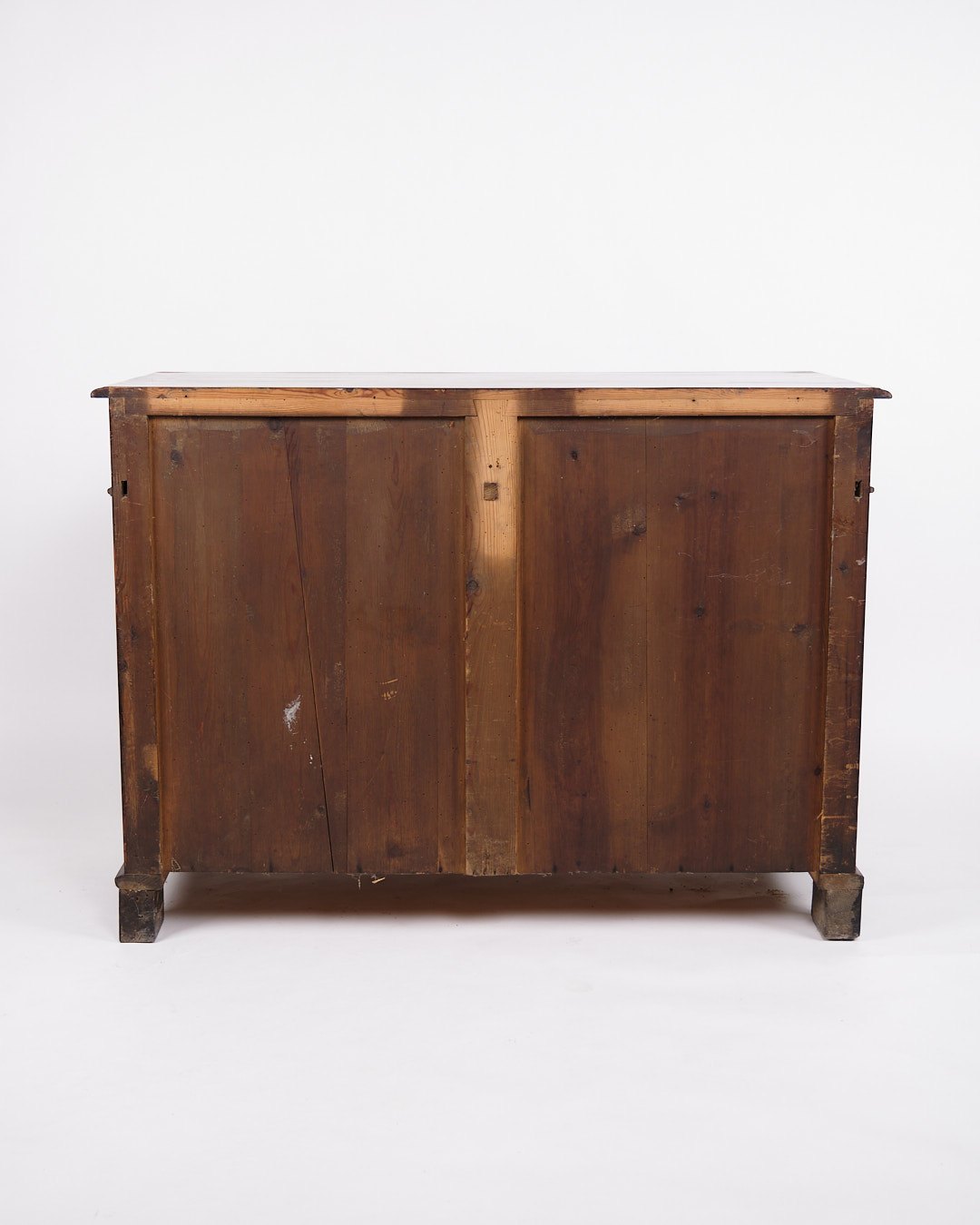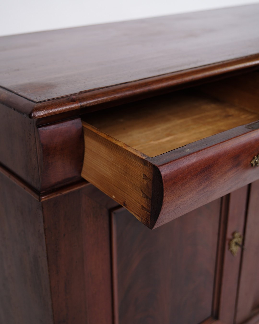 lav antik skænk fra 1880’erne, udført i håndpoleret mahogni. Skænken er indrettet med faste hylder og fremstår med tidstypiske detaljer, der vidner om 1800-tallets solide snedkerhåndværk.