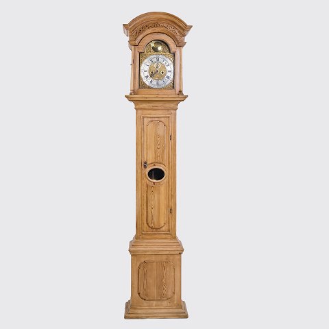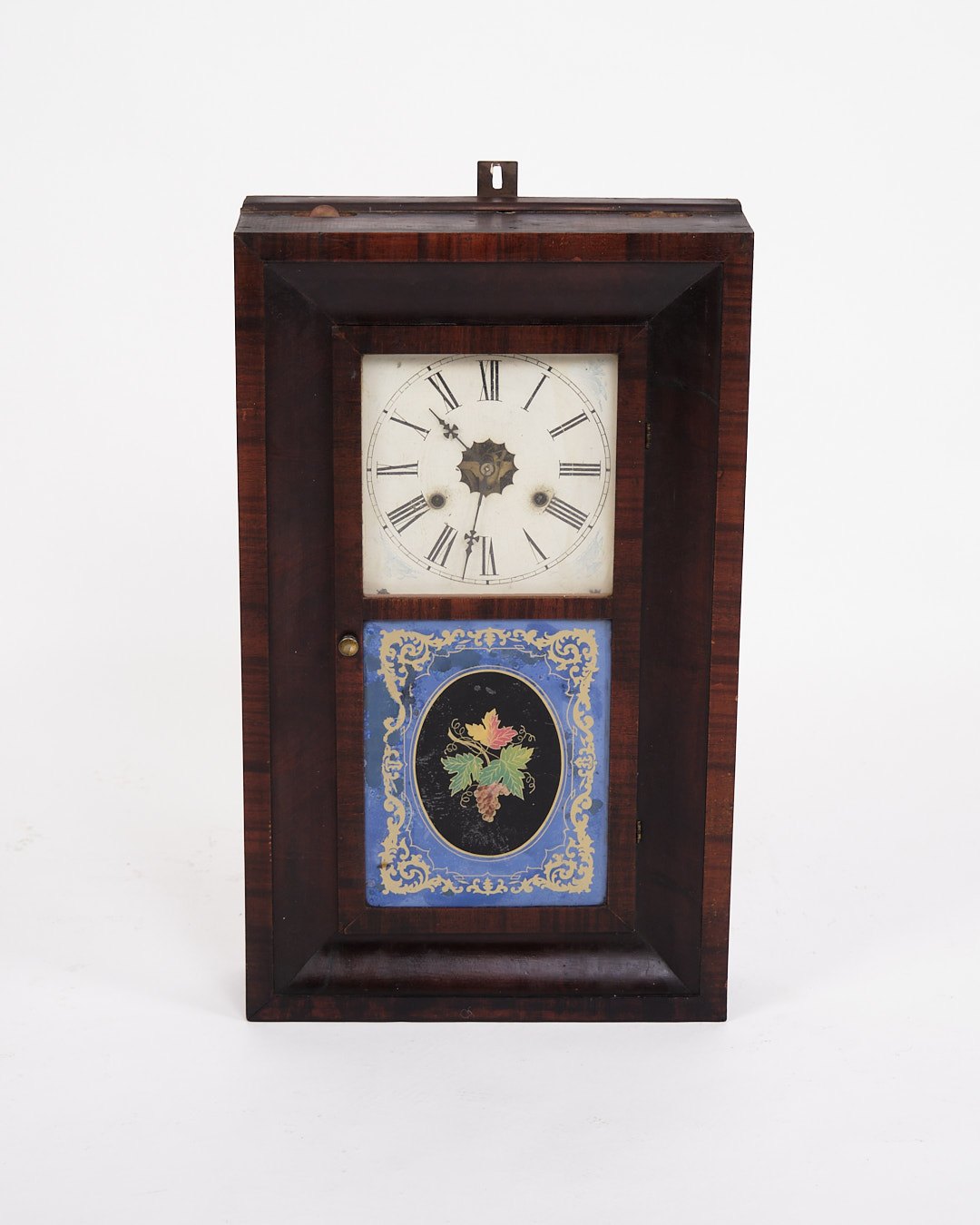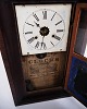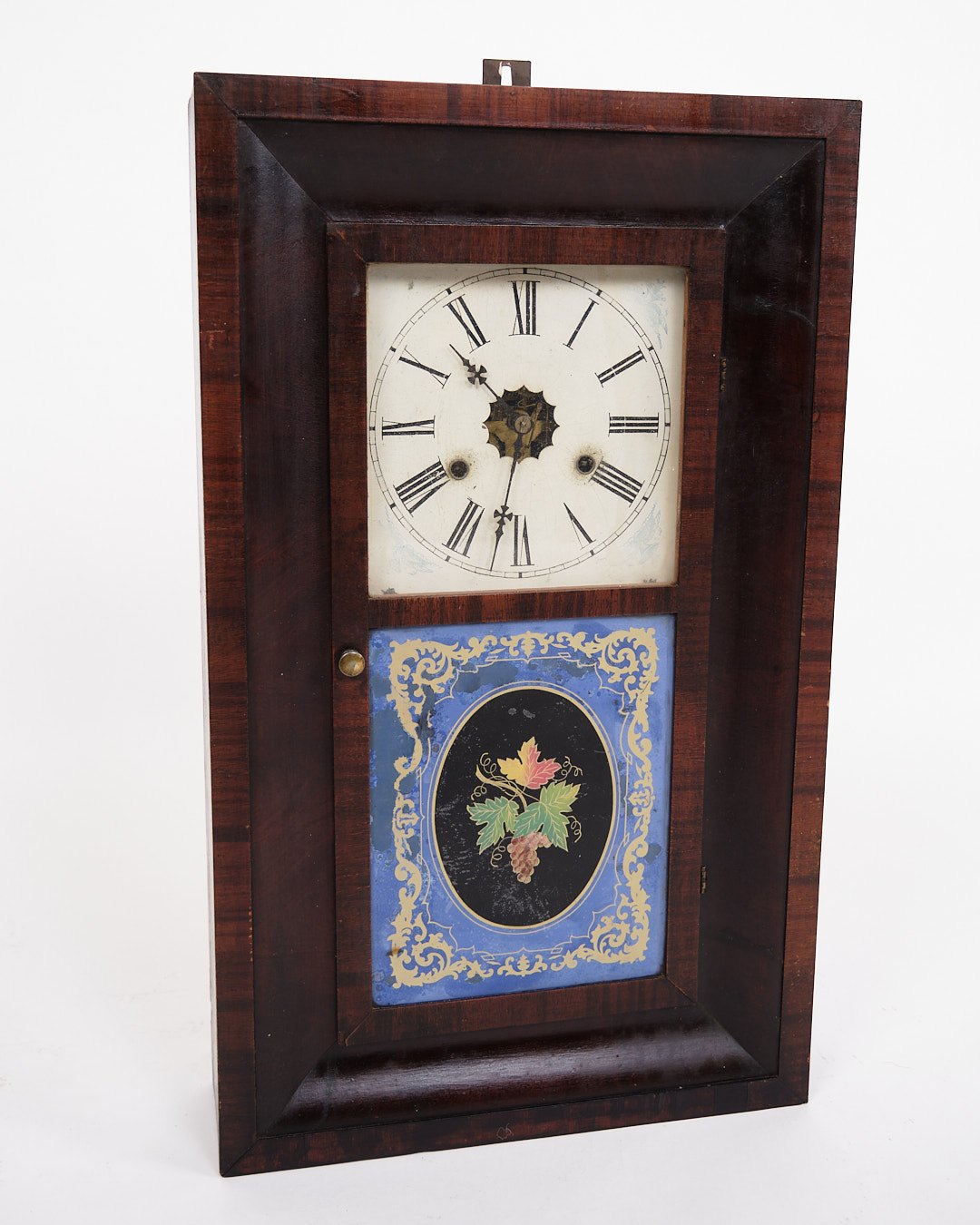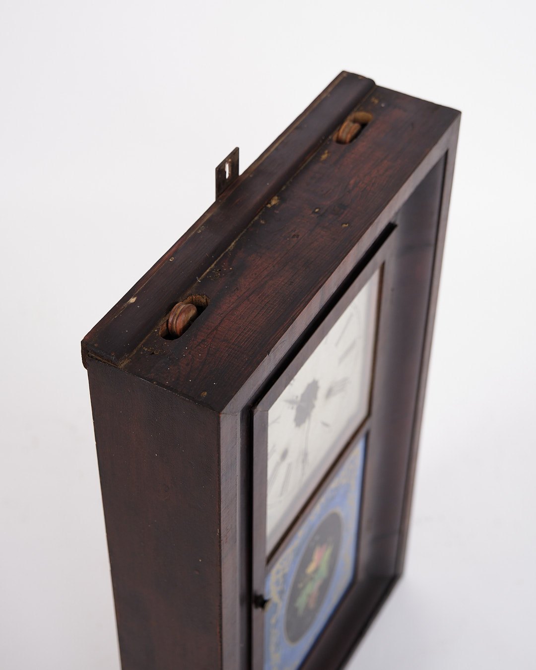 Dekorativt amerikanerur fra 1800-tallet, udført i mørkt træ. Uret har en klassisk urskive med romertal og en bemalet glasrude, der giver et charmerende og tidstypisk udtryk.