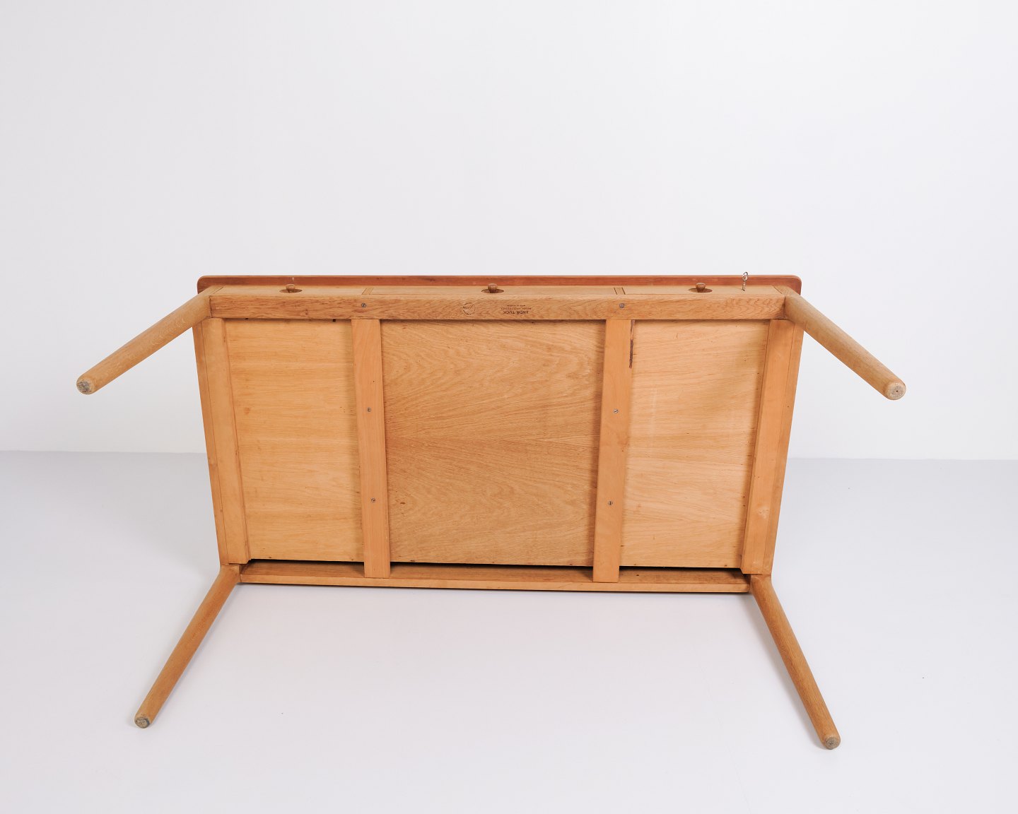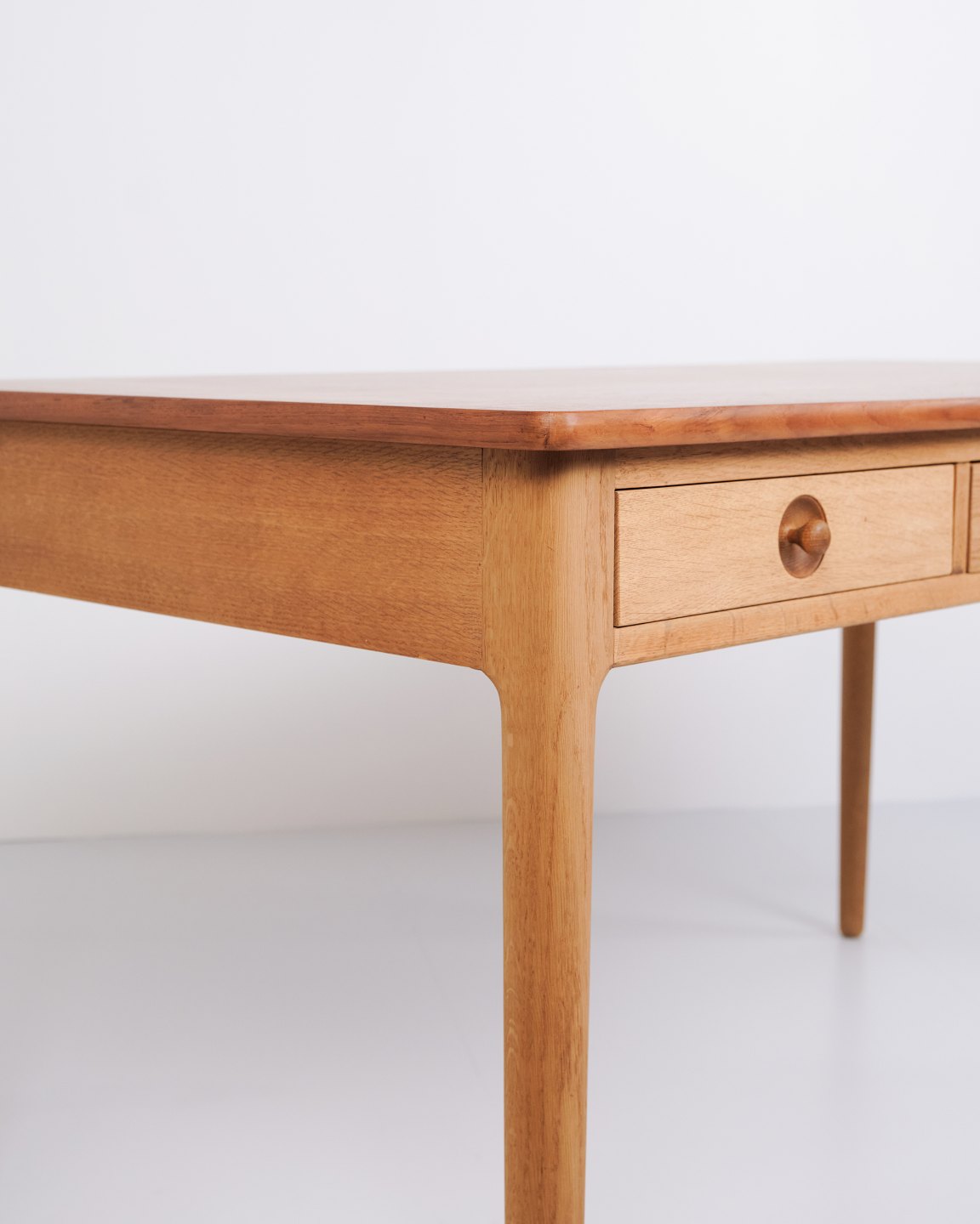 Skrivebord designet af Hans J. Wegner og produceret af Andreas Tuck i 1960’erne. Bordet er udført i teak med benkonstruktion i eg – en klassisk materialekombination, der fremhæver Wegners sans for proportioner og naturlig balance. Bordet har skuffer i fronten.