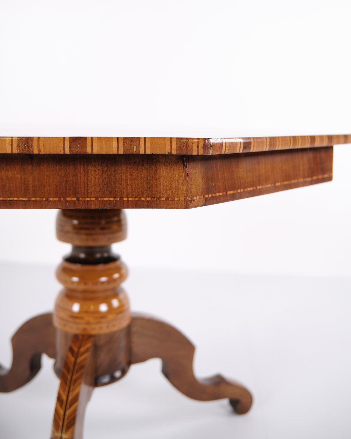 Octagonal column table from Italy, dated to the 1850s. The table is richly decorated with hand-laid intarsia, which emphasizes the geometric shapes and the overall decorative expression.