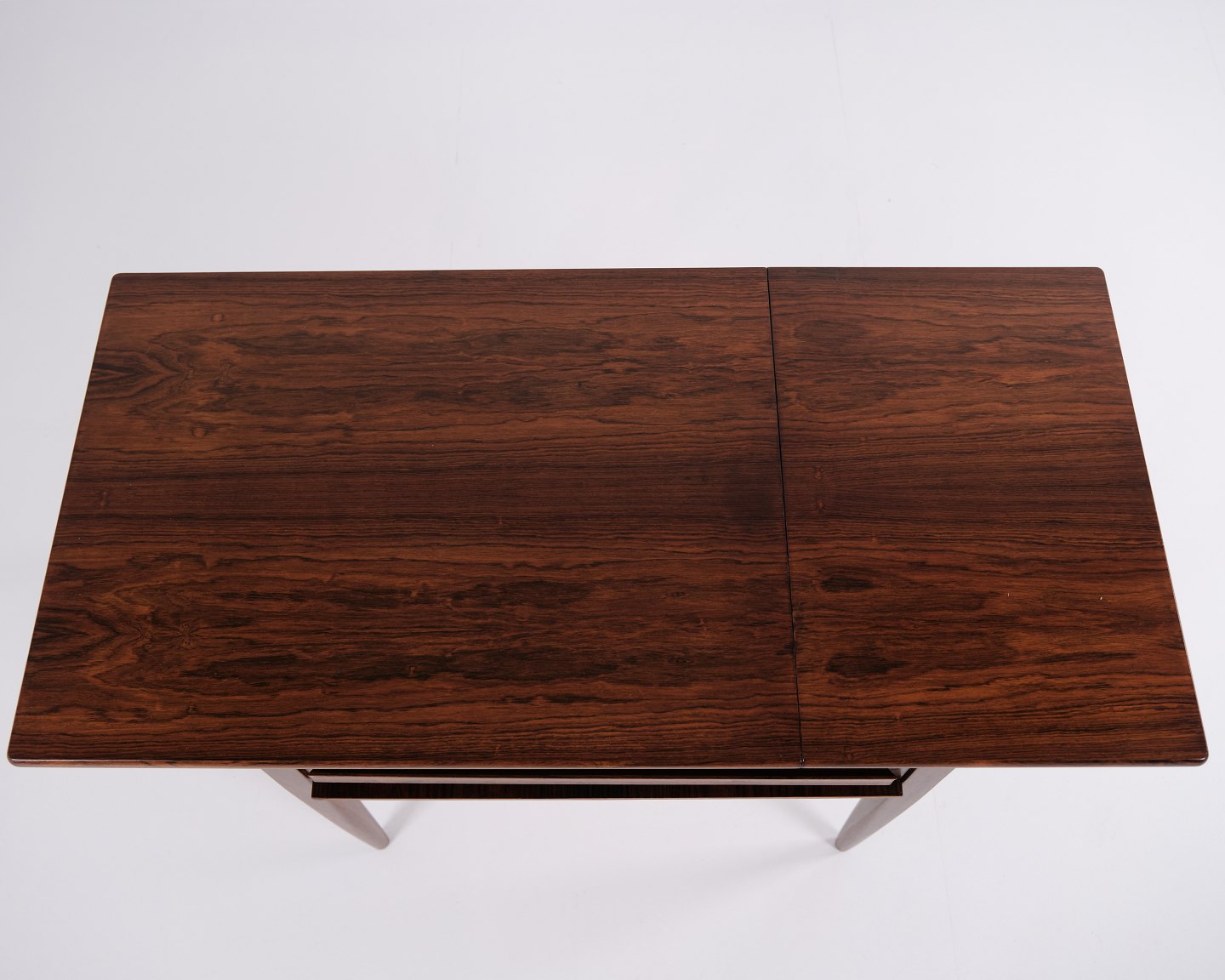 Foldbart sybord designet af Johannes Andersen og fremstillet af Silkeborg Møbelfabrik i 1960’erne. Bordet er udført i palisander og har både skuffe og udklappelig bordplade, hvilket gør det særligt funktionelt til opbevaring og arbejde.