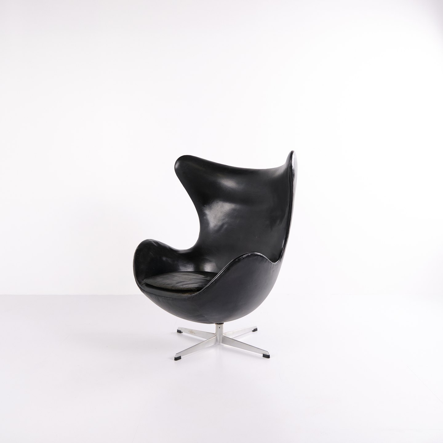 Egg chair designed by Arne Jacobsen and produced by Fritz Hansen. Early model upholstered in black original leather and fitted with an aluminium base. A classic Danish design icon from an earlier production period, characterised by its organic shape and high-quality leather finish.