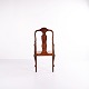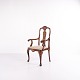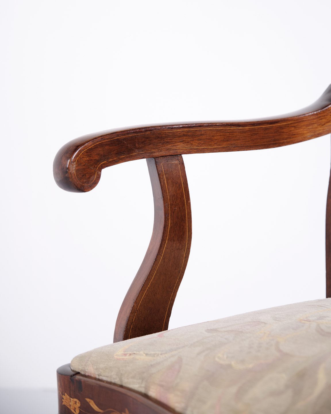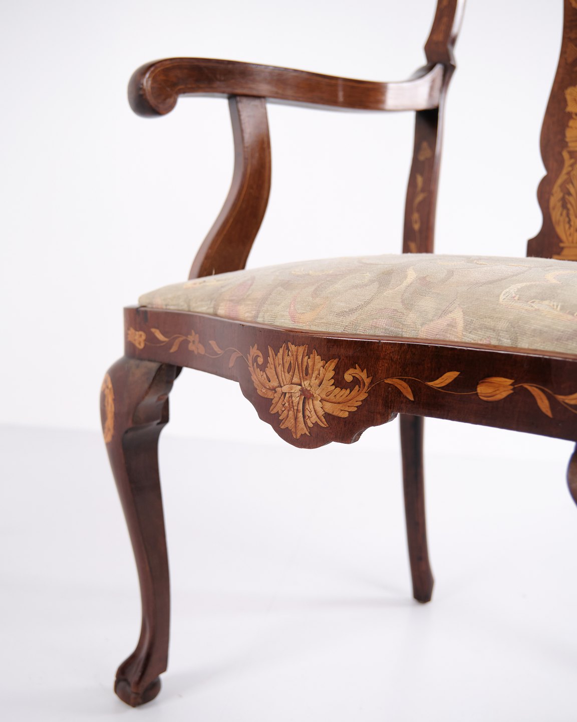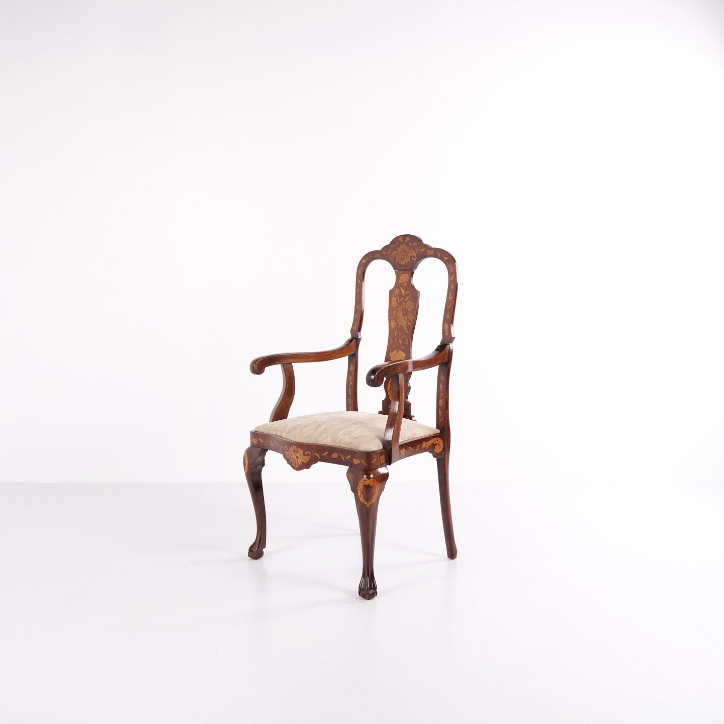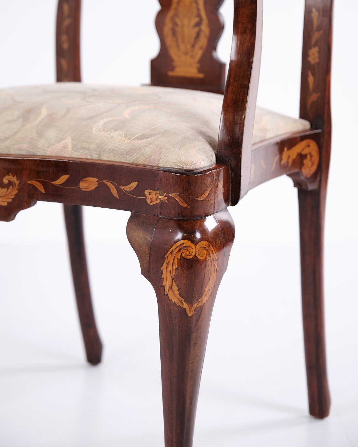 Mid-18th century armchair in Queen Anne style, crafted in walnut with detailed fruitwood inlay. The decoration features floral, bird and butterfly motifs. Finished with hand-polished shellac, enhancing the warm tone of the wood and the refined craftsmanship.