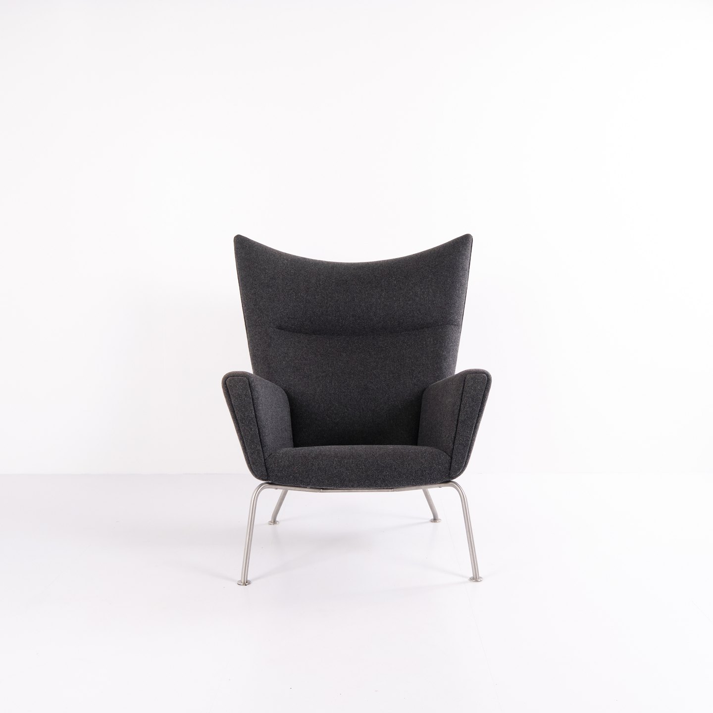 CH445 Wingchair designed by Hans J. Wegner and produced by Carl Hansen & Søn. Upholstered in grey Hallingdal fabric with matching footstool. A classic high-back Wegner model with distinctive wings and excellent seating comfort. A well-known Danish design icon.