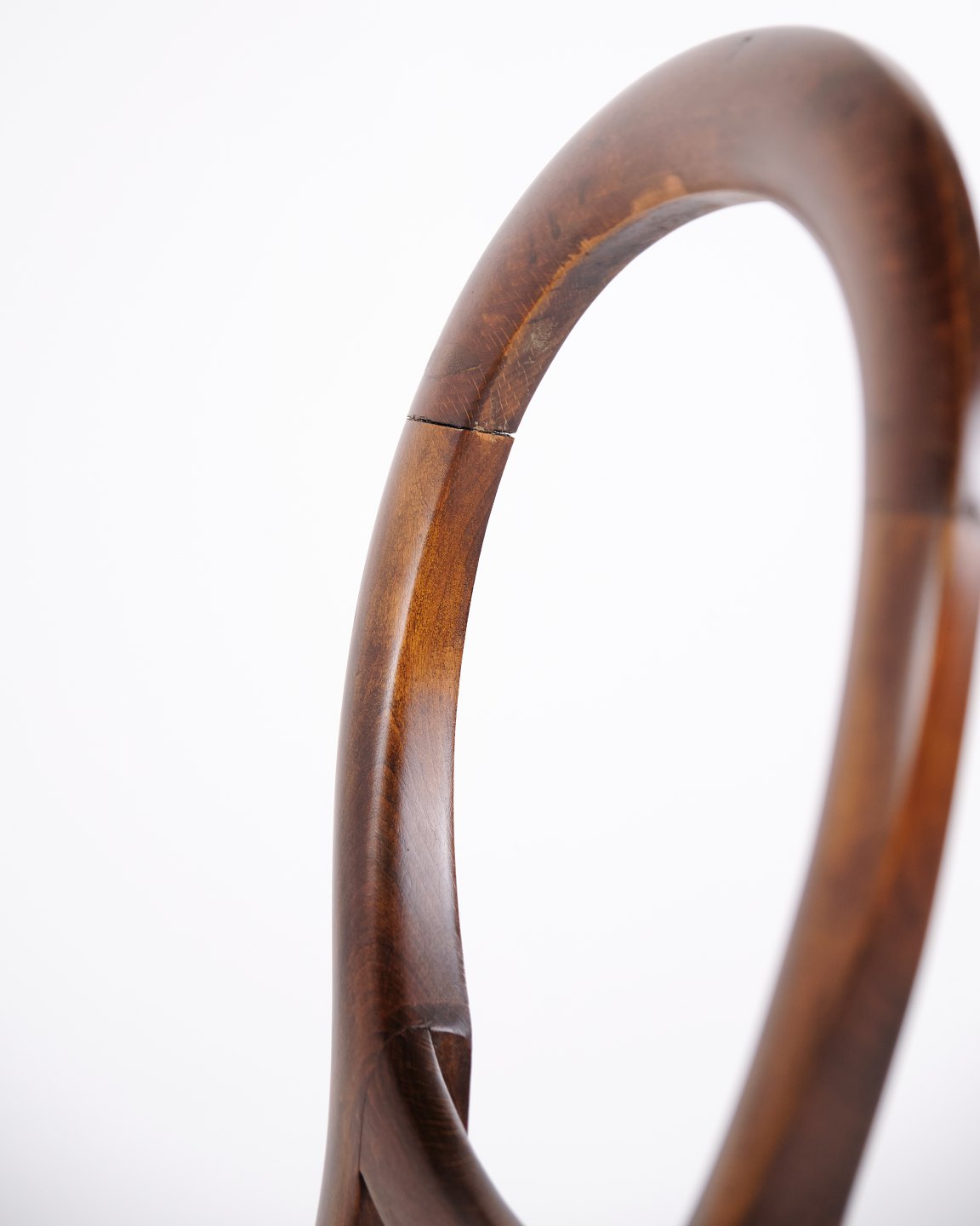Set of four salon/dining chairs from the 1860s, made of mahogany and upholstered in light floral fabric. Rococo-inspired design with carved details and classic proportions. Elegant chairs for dining rooms, living spaces or hallways.