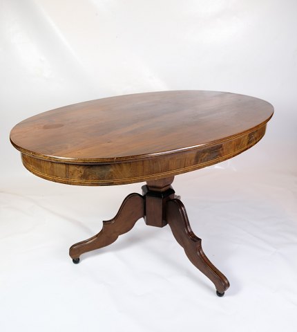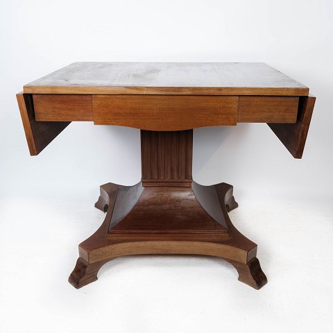 Søjlebord i sen Empire stil fra ca. 1840’erne, udført i mahogni med rige udskæringer og klassisk formsprog. Bordet kan udvides med fire tillægsplader og fungerer både som spisebord og dekorativt møbel i større rum.