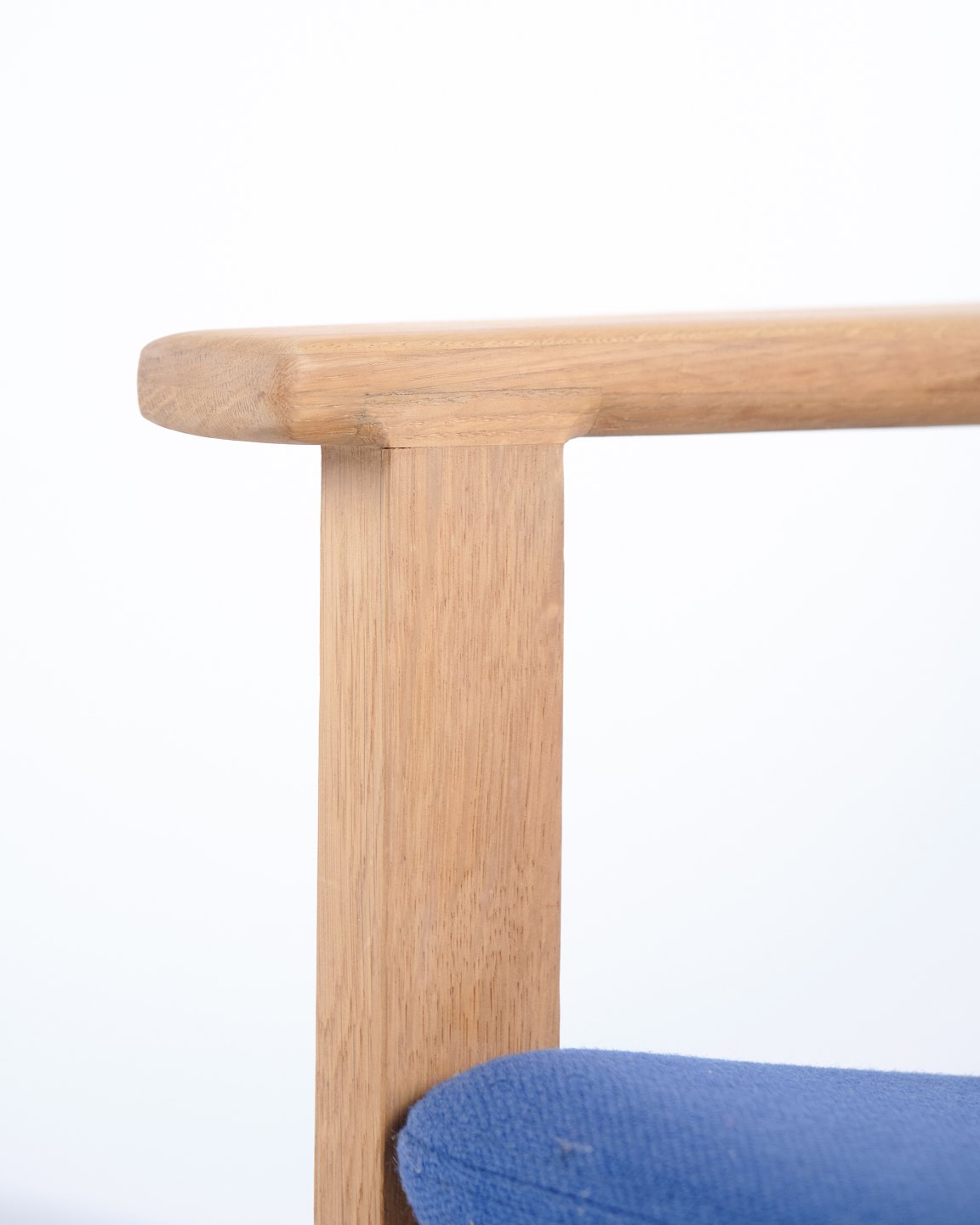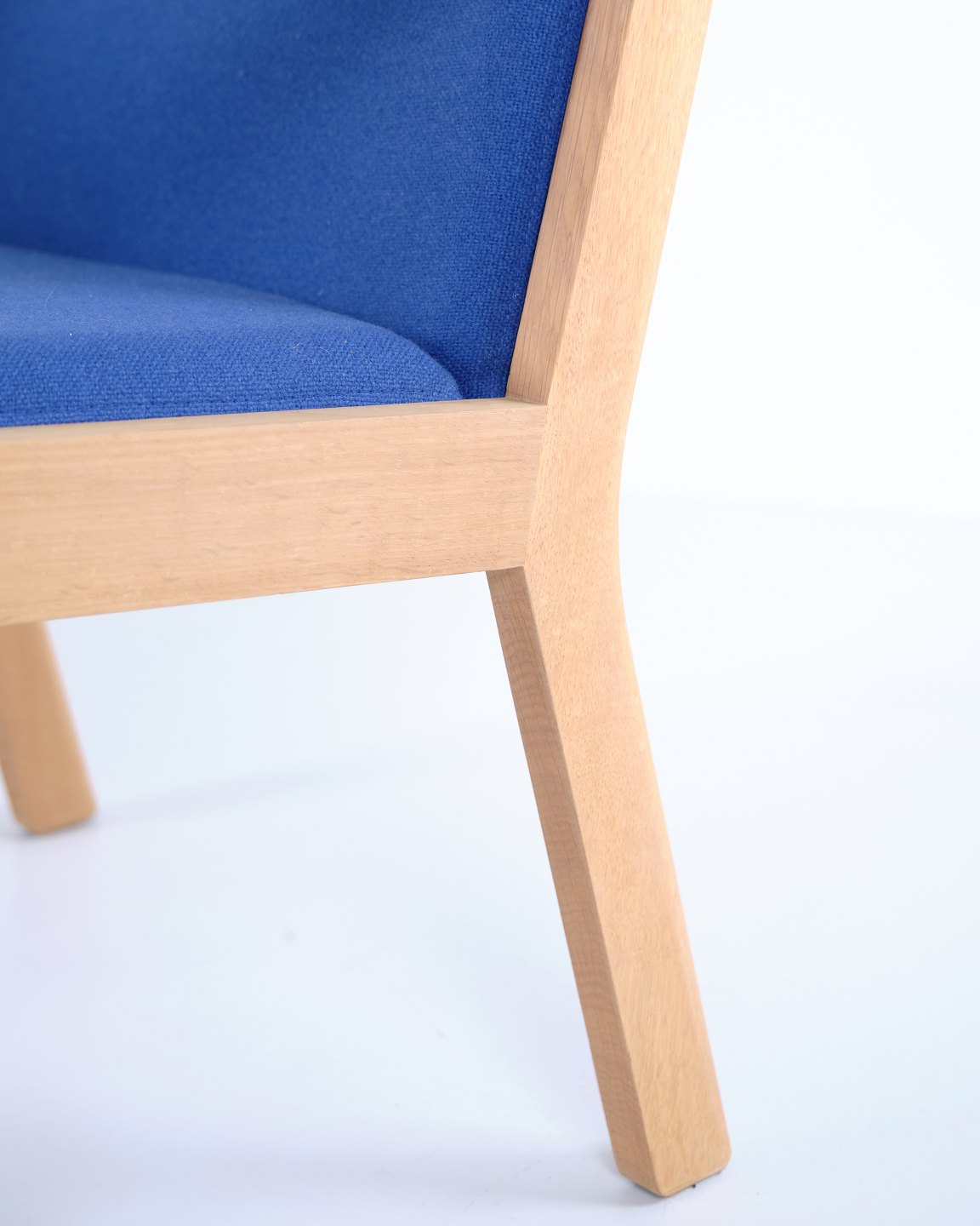 Lounge chair model GE 284 designed by Hans J. Wegner and produced by Getama. Made with a solid oak frame and loose cushions upholstered in blue wool. A classic Wegner design offering comfort and a compact form suitable for both modern and traditional interiors.