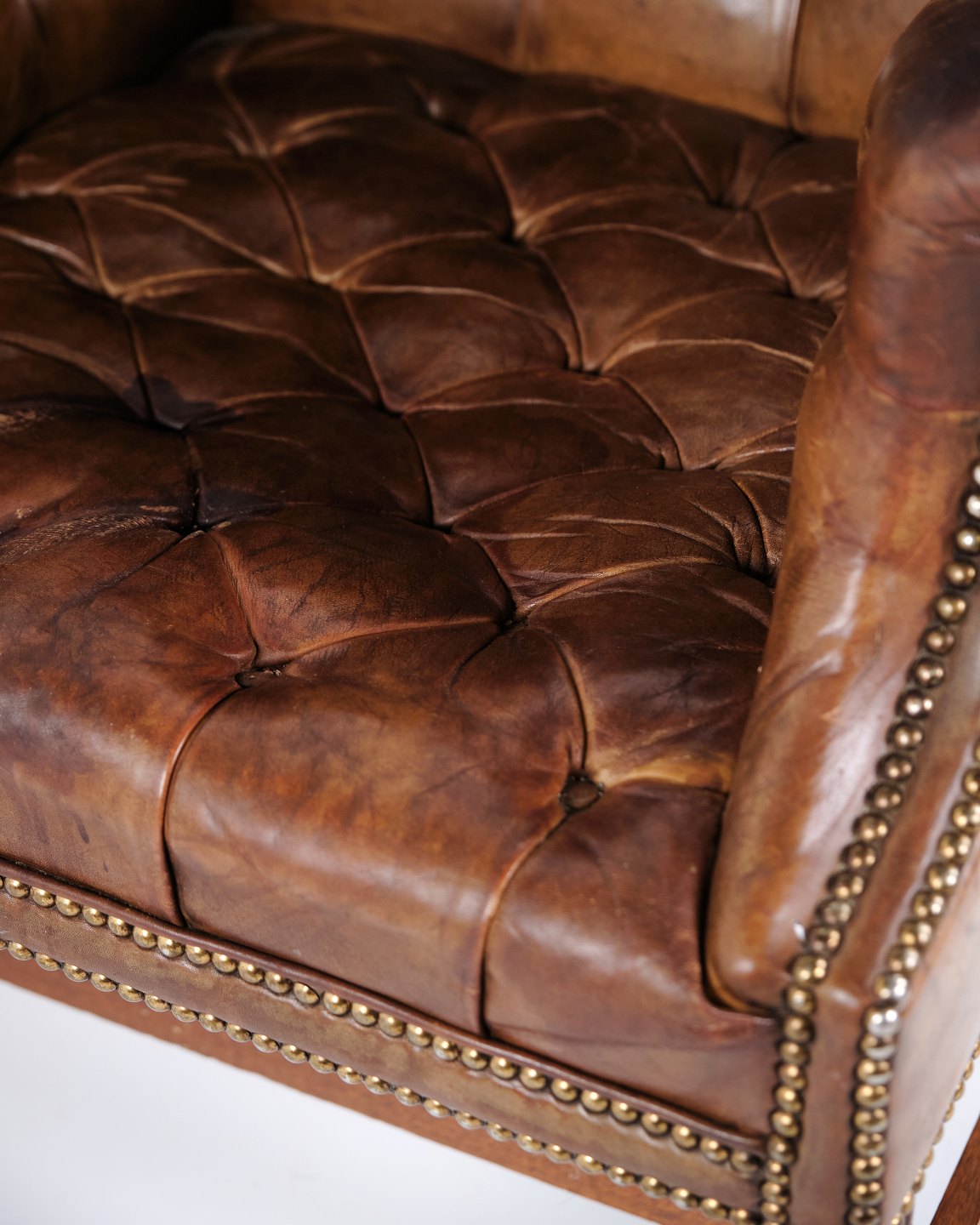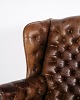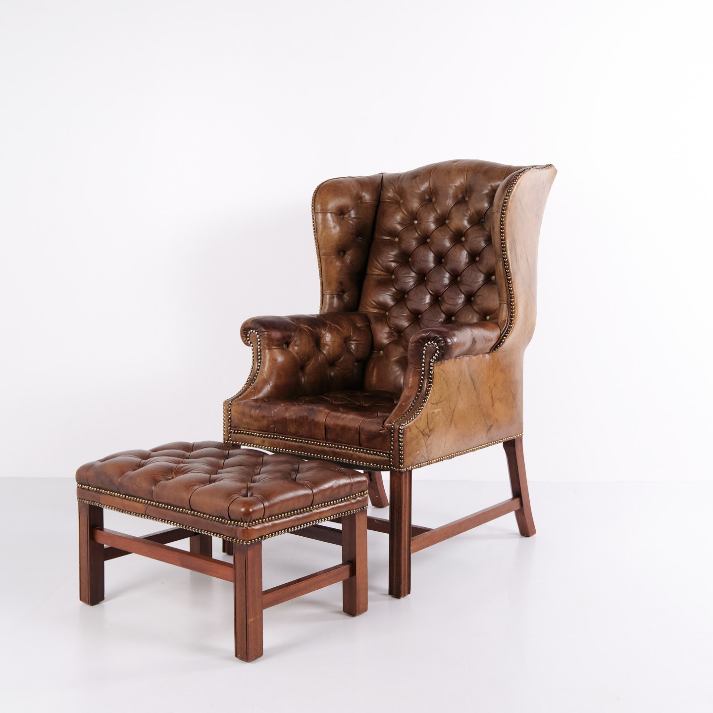 High-quality wingback armchair from around 1910 in brown original leather. Classic high-back model with pronounced wings and solid frame. Includes matching footstool. Designed in the style of the George III period with well-preserved original leather and attractive patina.