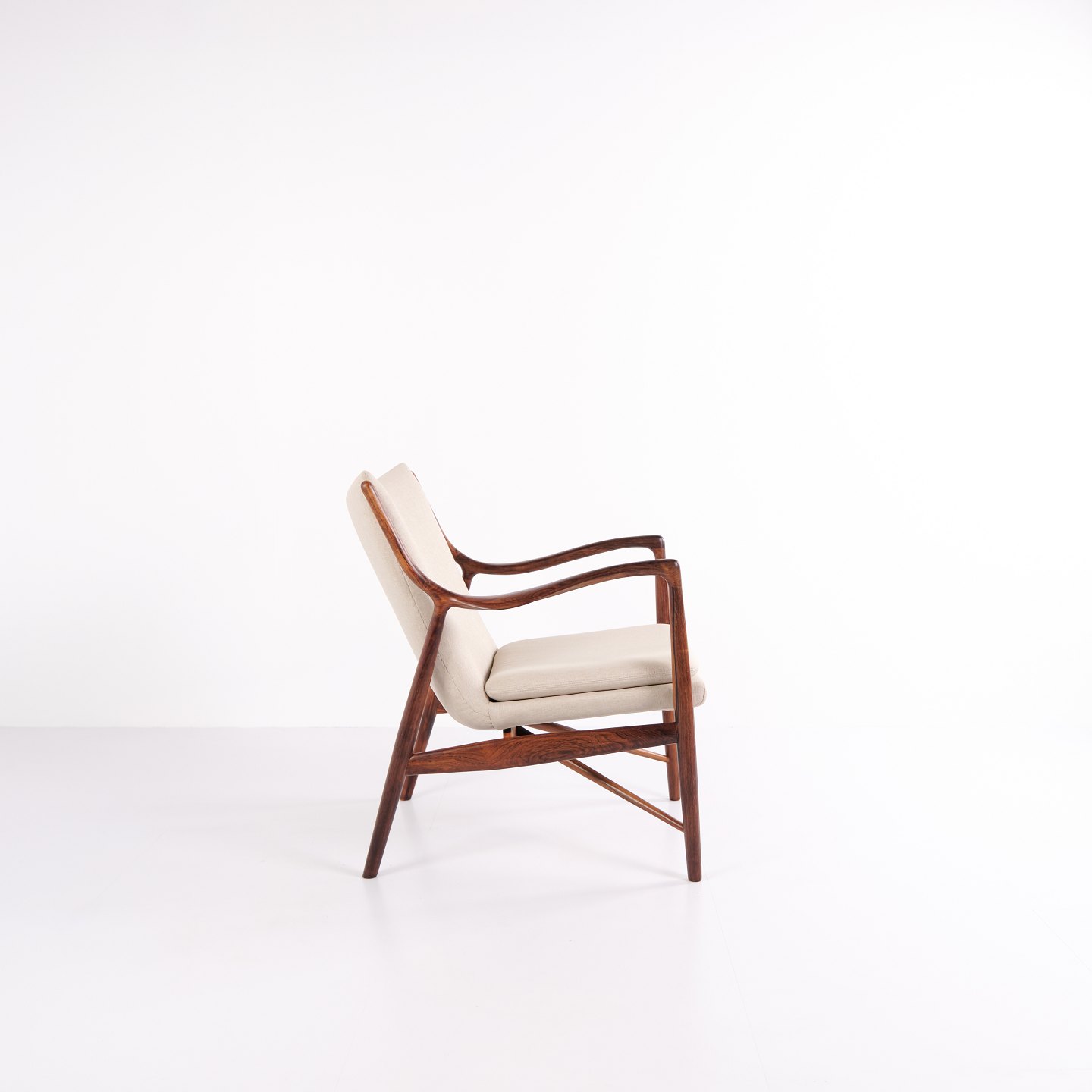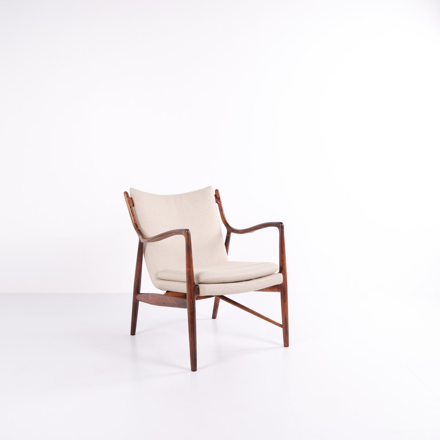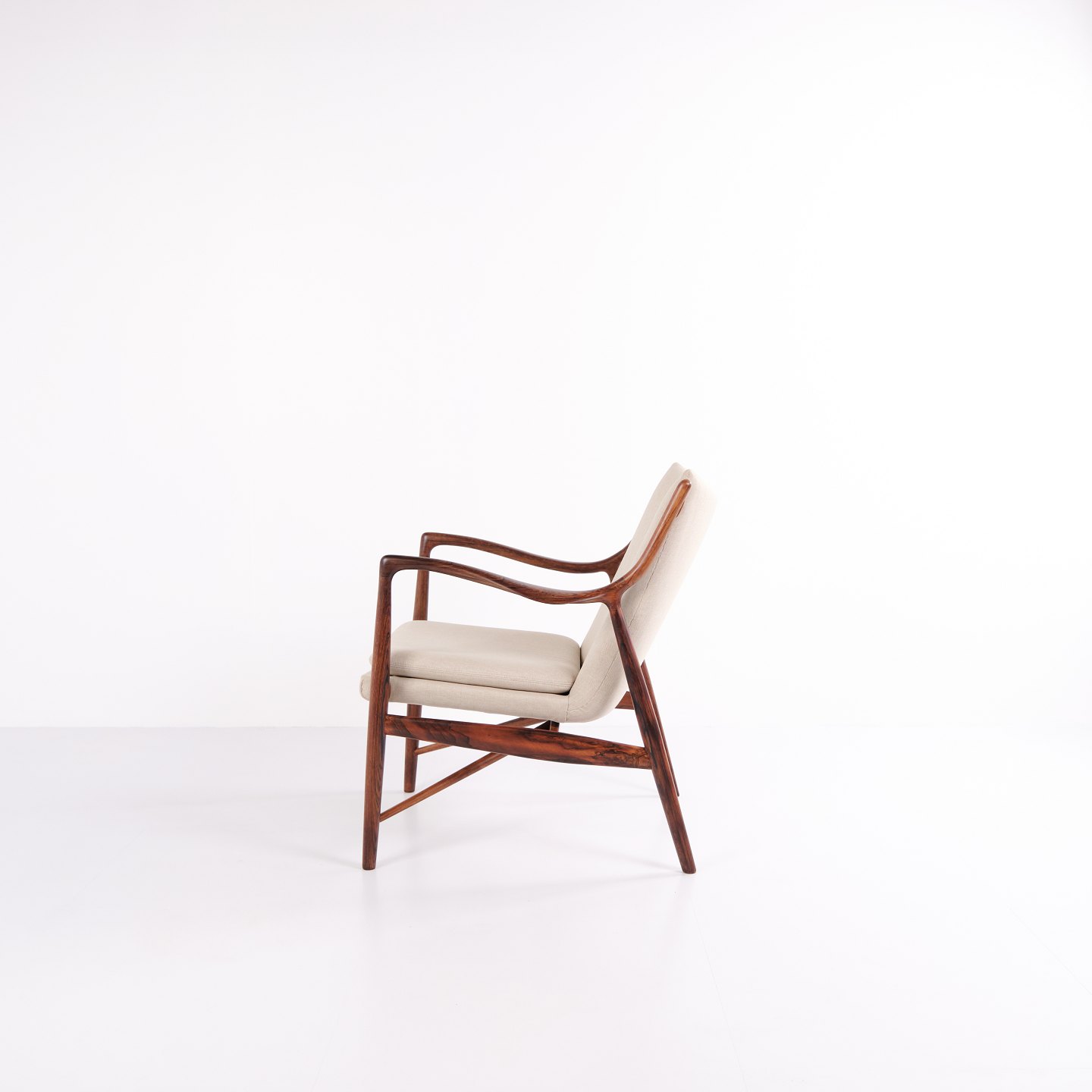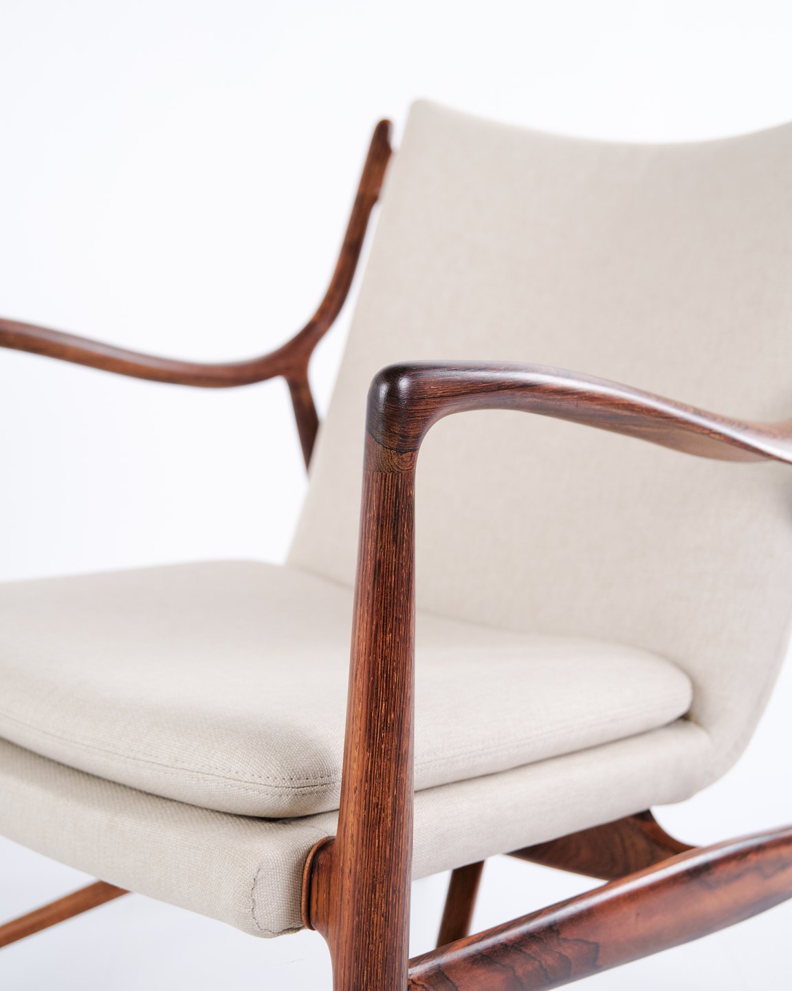 Iconic armchair, model NV45, designed by Finn Juhl and made by master cabinetmaker Niels Vodder in the 1950s. The chair is made of rosewood with a cantilevered seat and back upholstered in light fabric, which highlights Finn Juhl's characteristic sculptural design and light construction.
