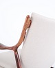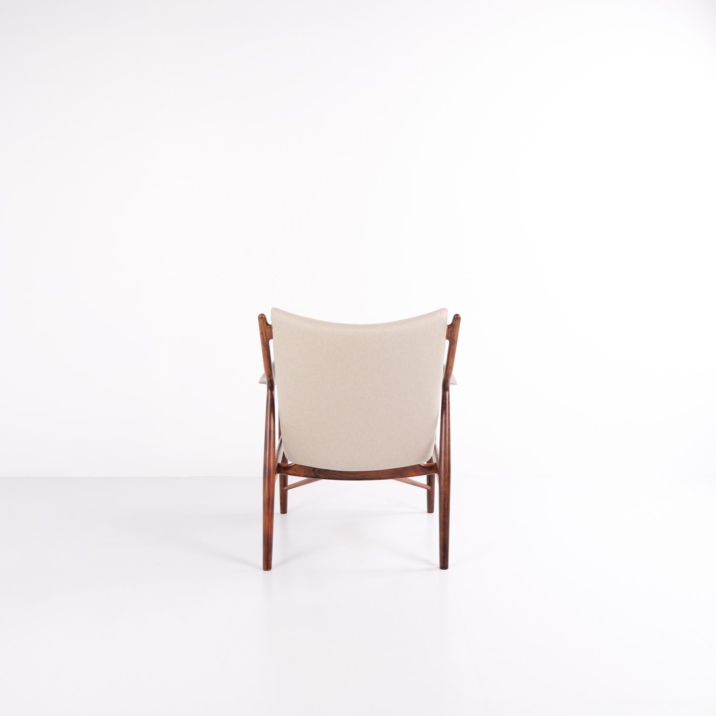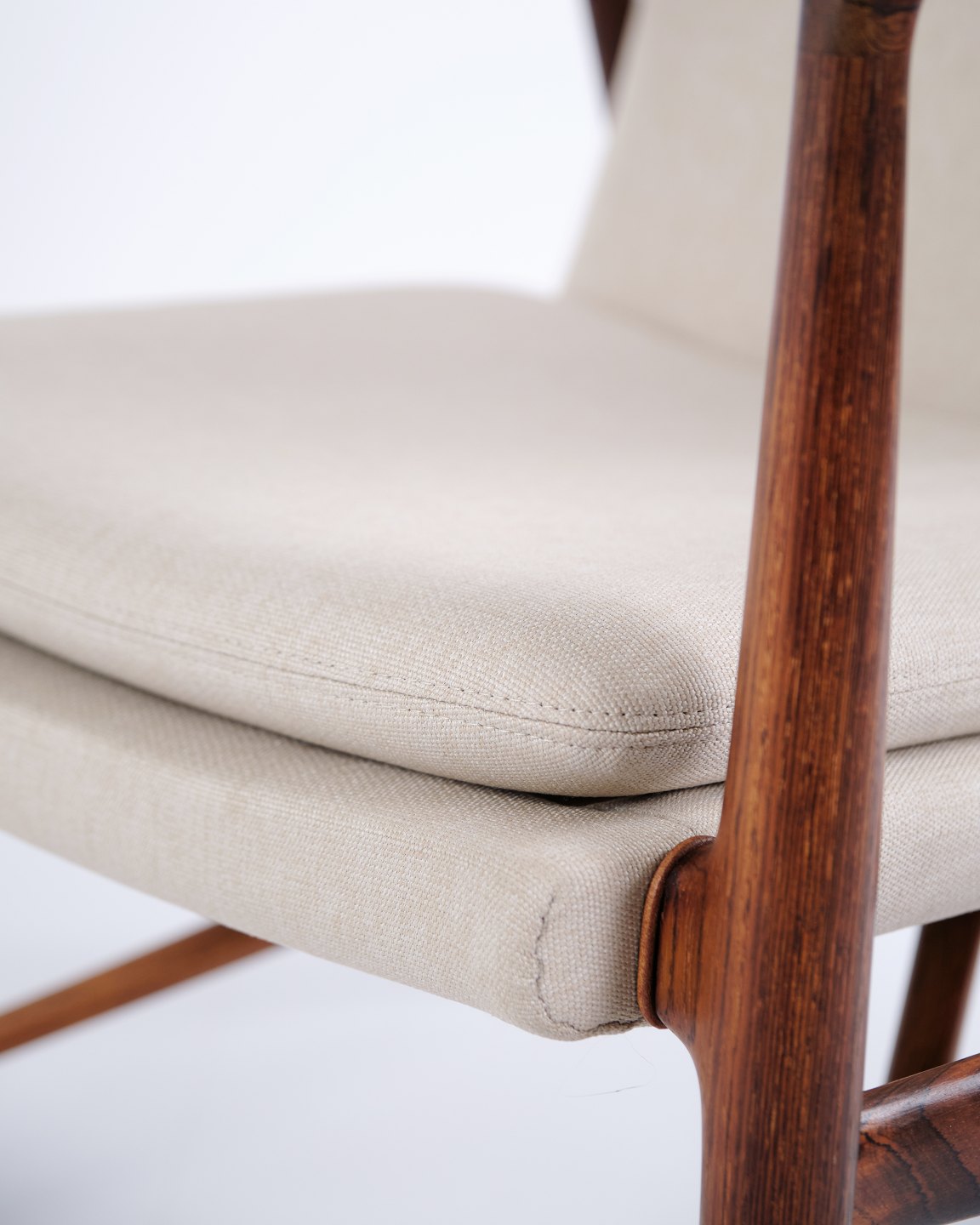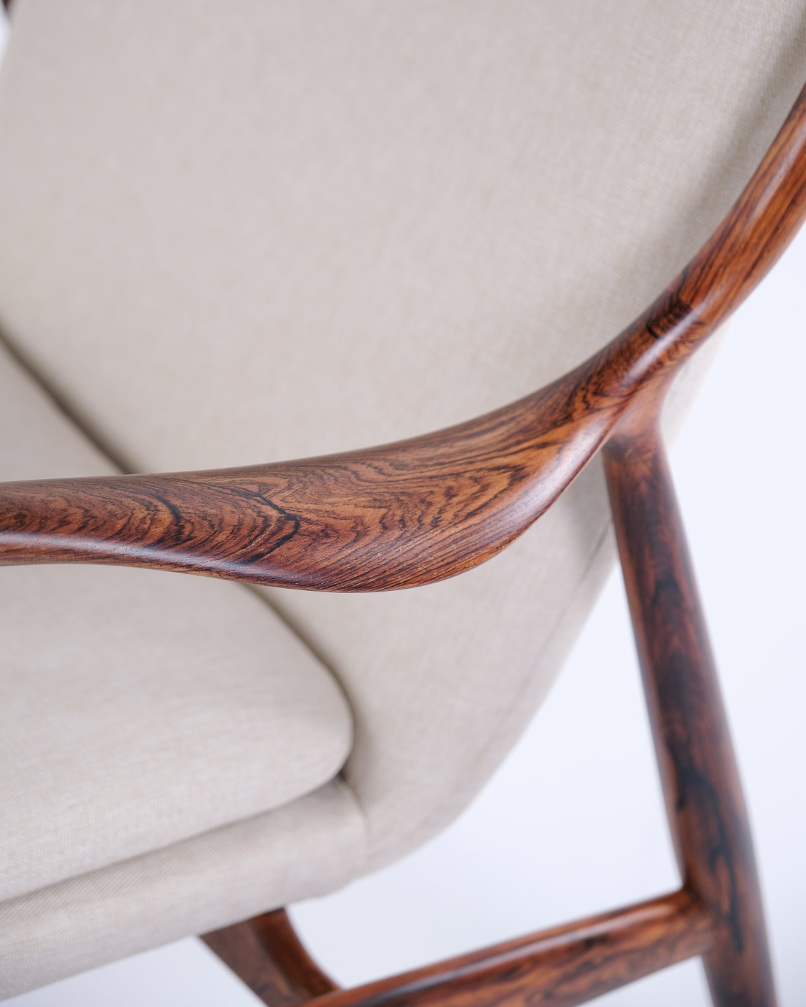 Iconic armchair, model NV45, designed by Finn Juhl and made by master cabinetmaker Niels Vodder in the 1950s. The chair is made of rosewood with a cantilevered seat and back upholstered in light fabric, which highlights Finn Juhl's characteristic sculptural design and light construction.
