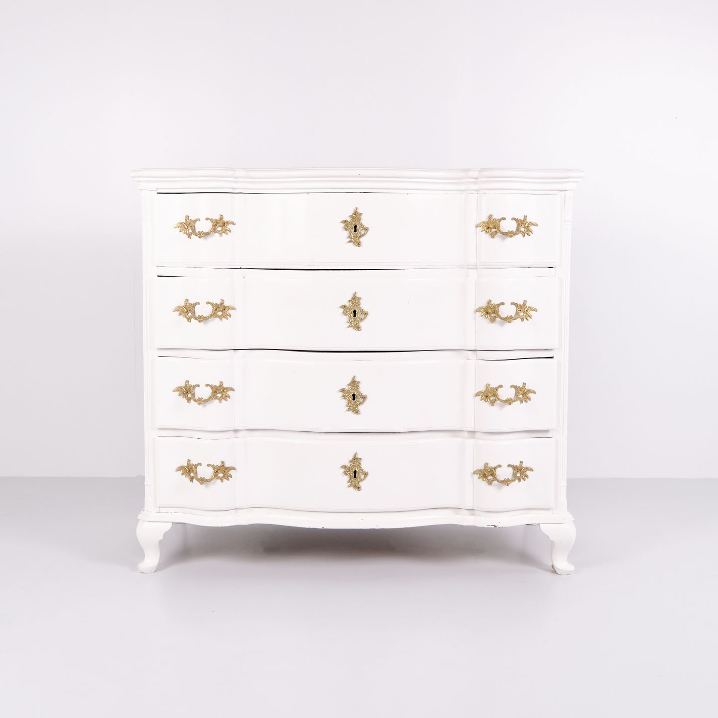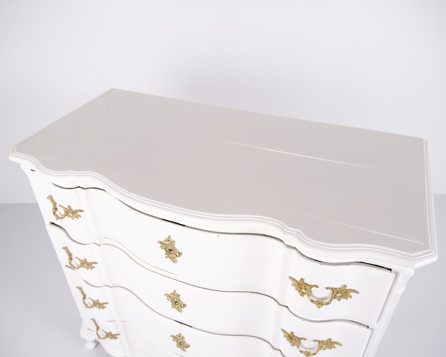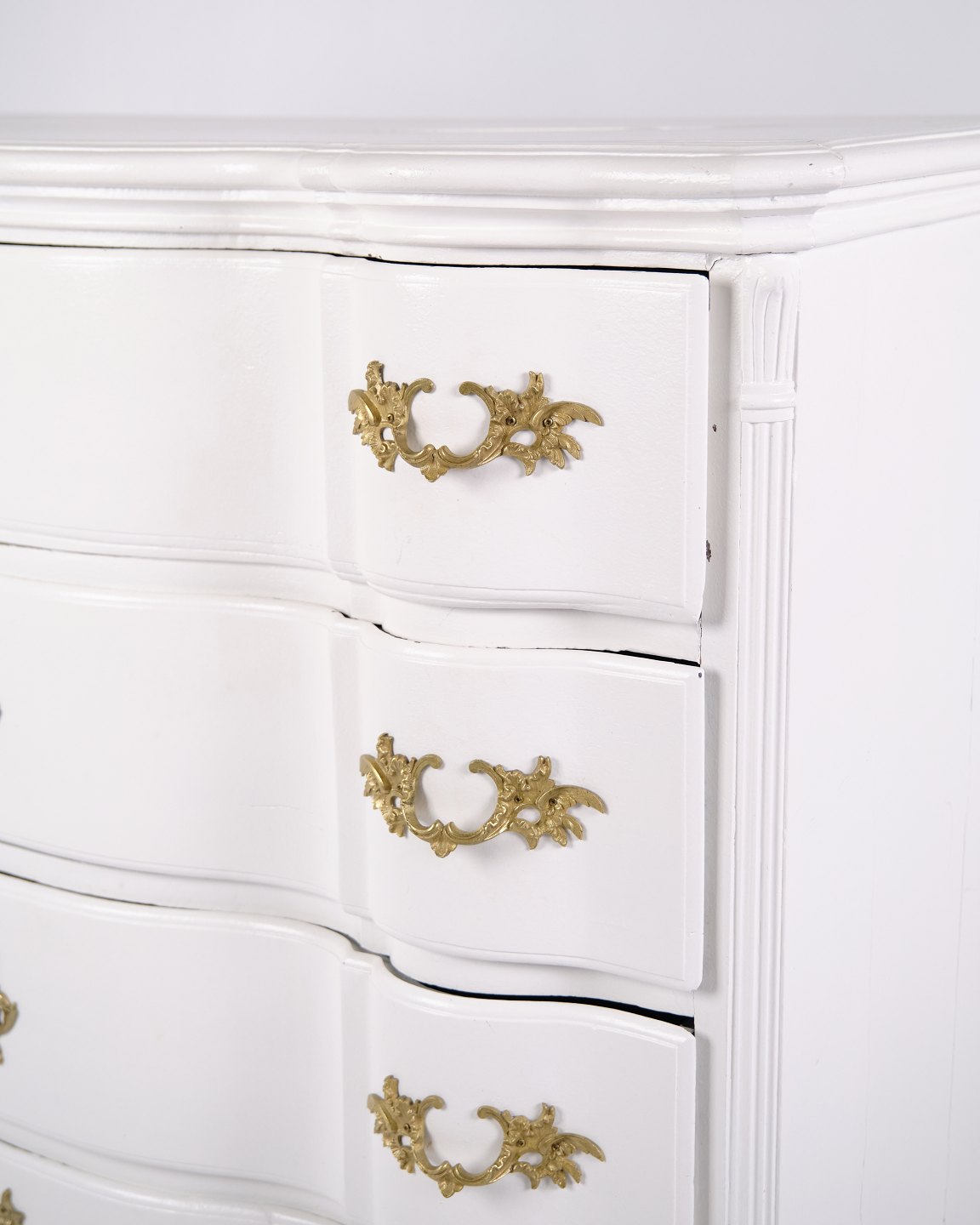 Antique baroque chest of drawers from the 1760s, painted white with brass handles. Four drawers and a distinctive baroque design. Historical and decorative piece of furniture.