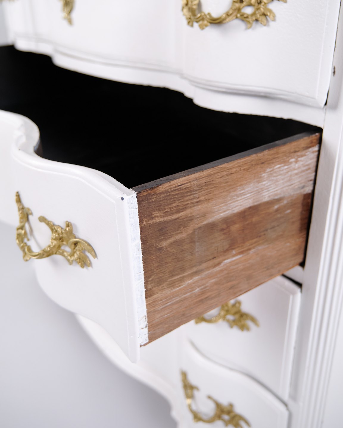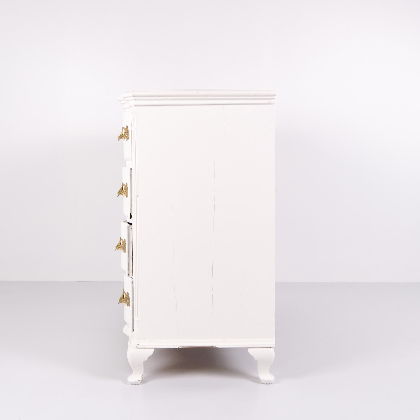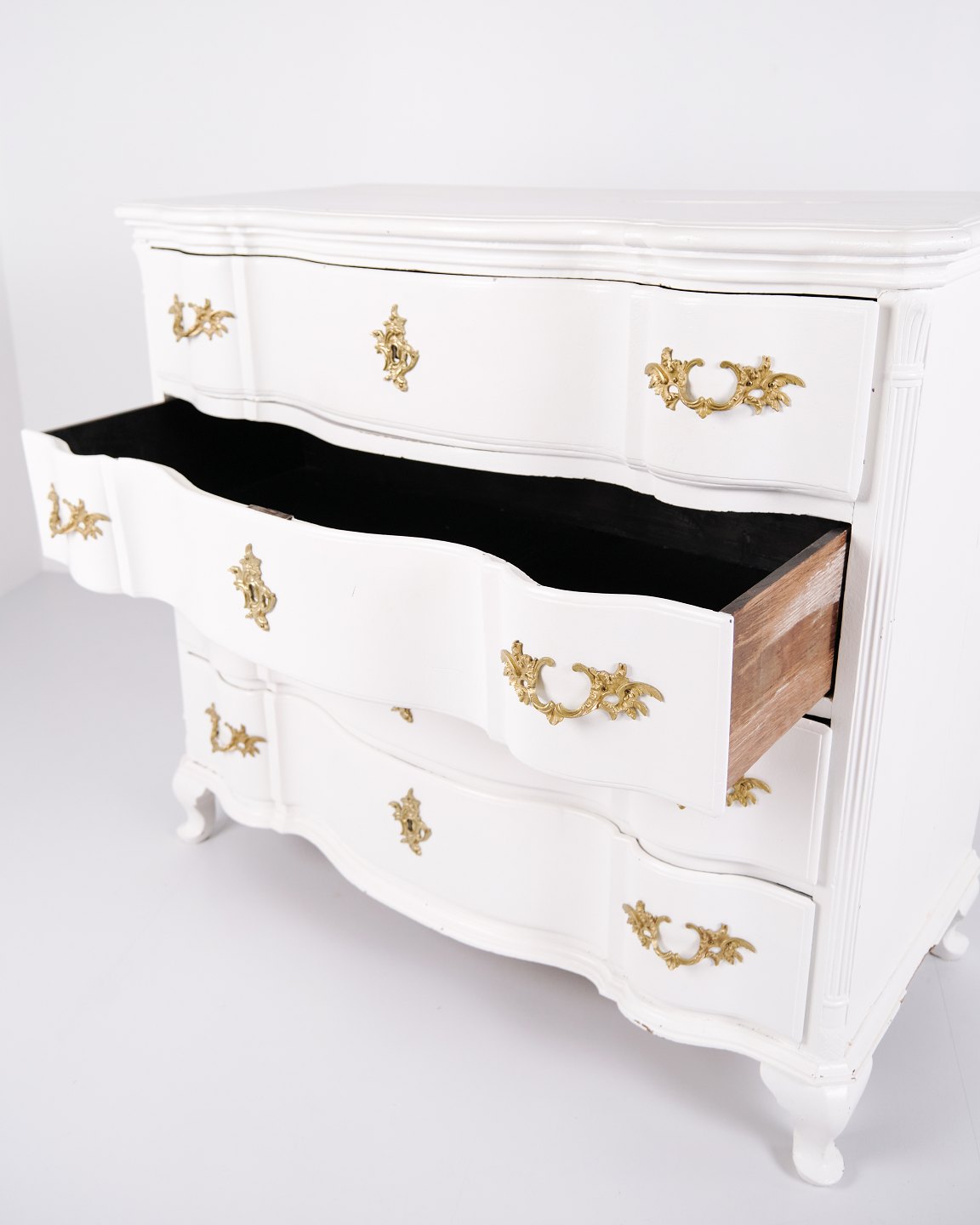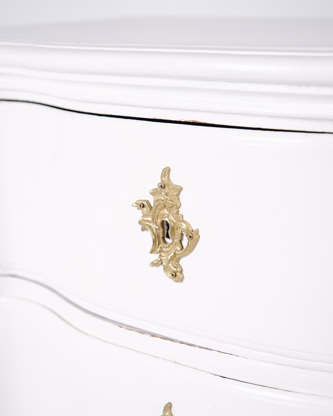 Antique baroque chest of drawers from the 1760s, painted white with brass handles. Four drawers and a distinctive baroque design. Historical and decorative piece of furniture.