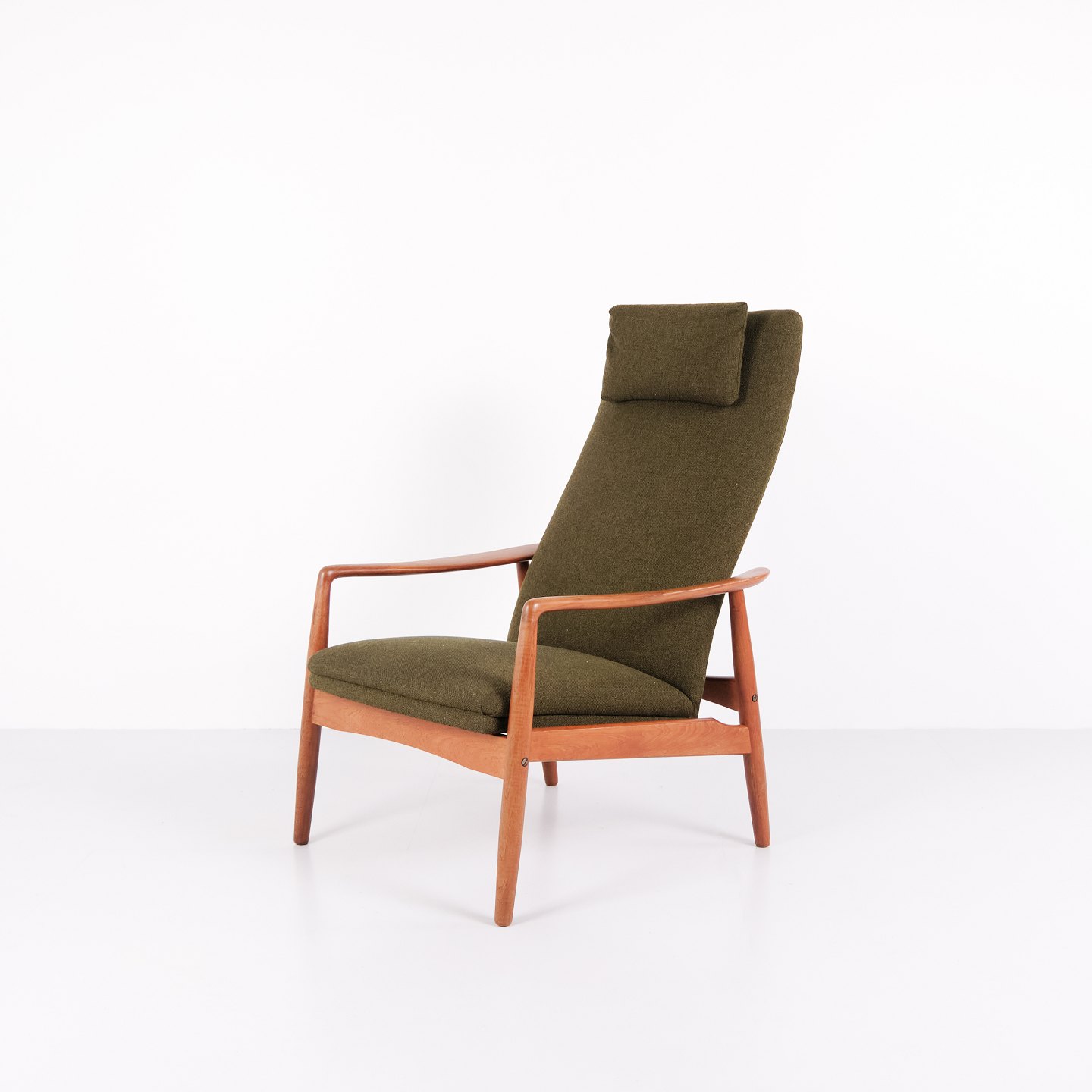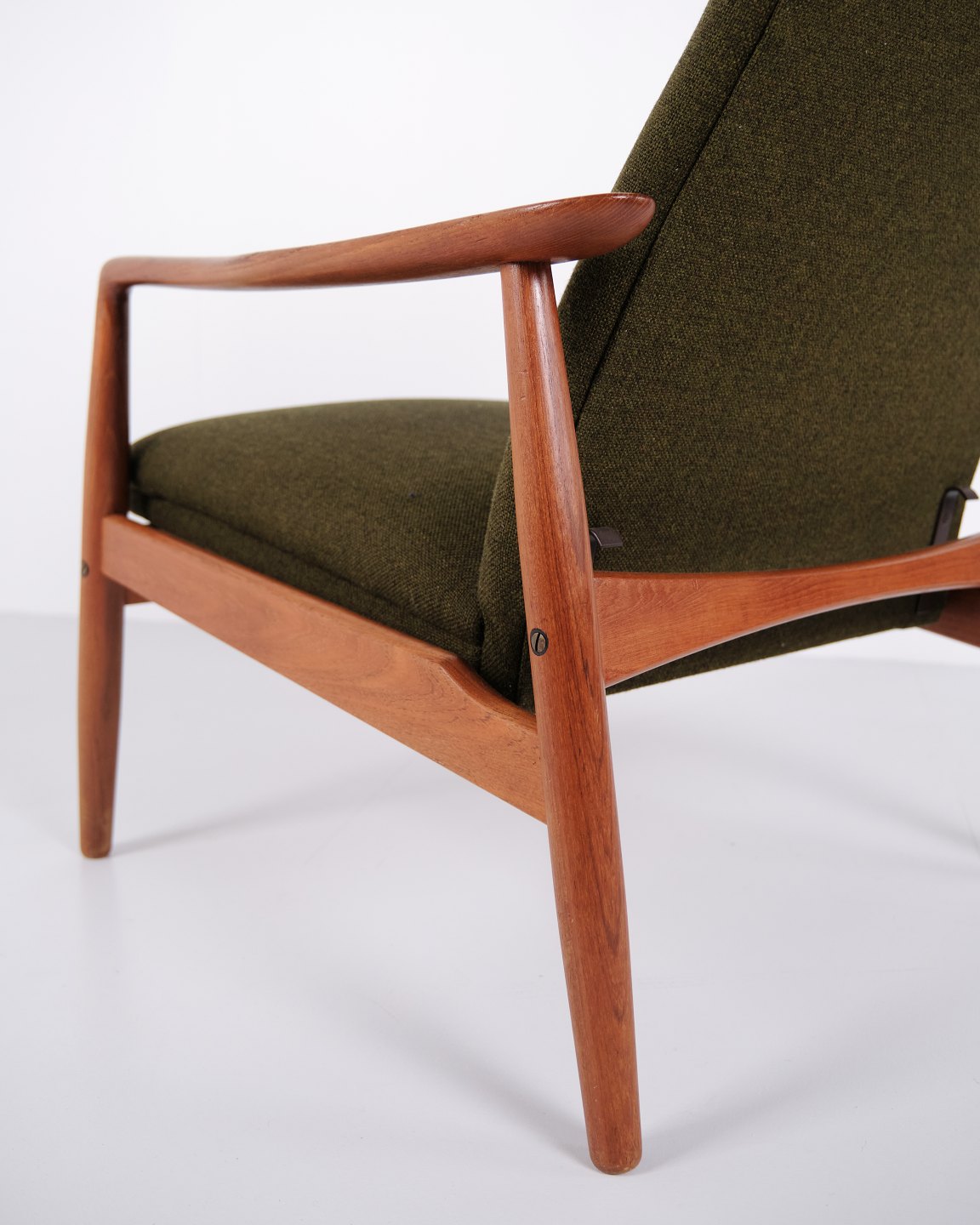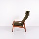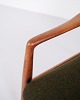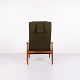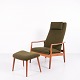 A pair of easy chairs with ottoman designed by Alf Svensson for Fritz Hansen. Teak and green fabric. Scandinavian design from the 1960s with a focus on comfort.