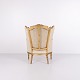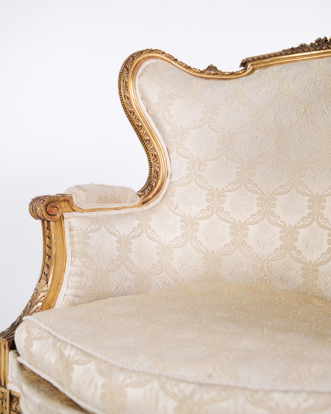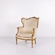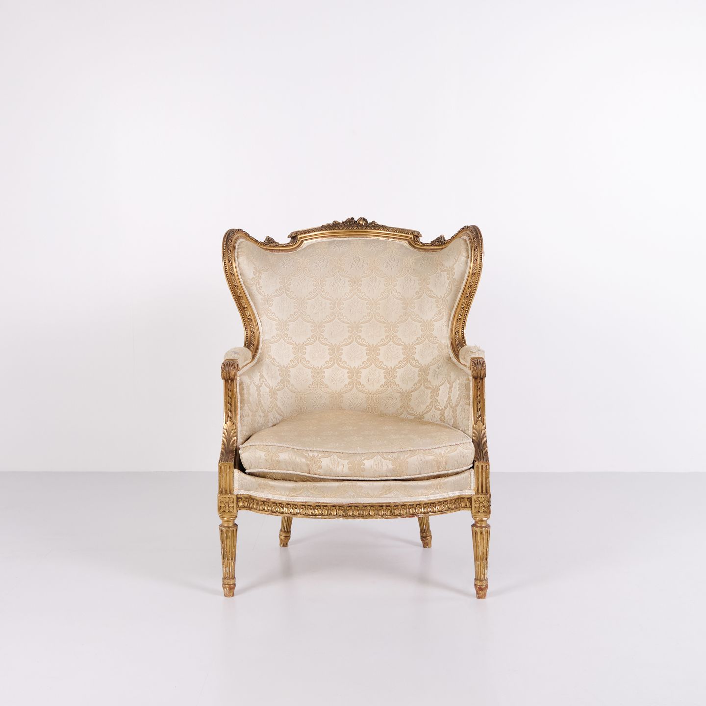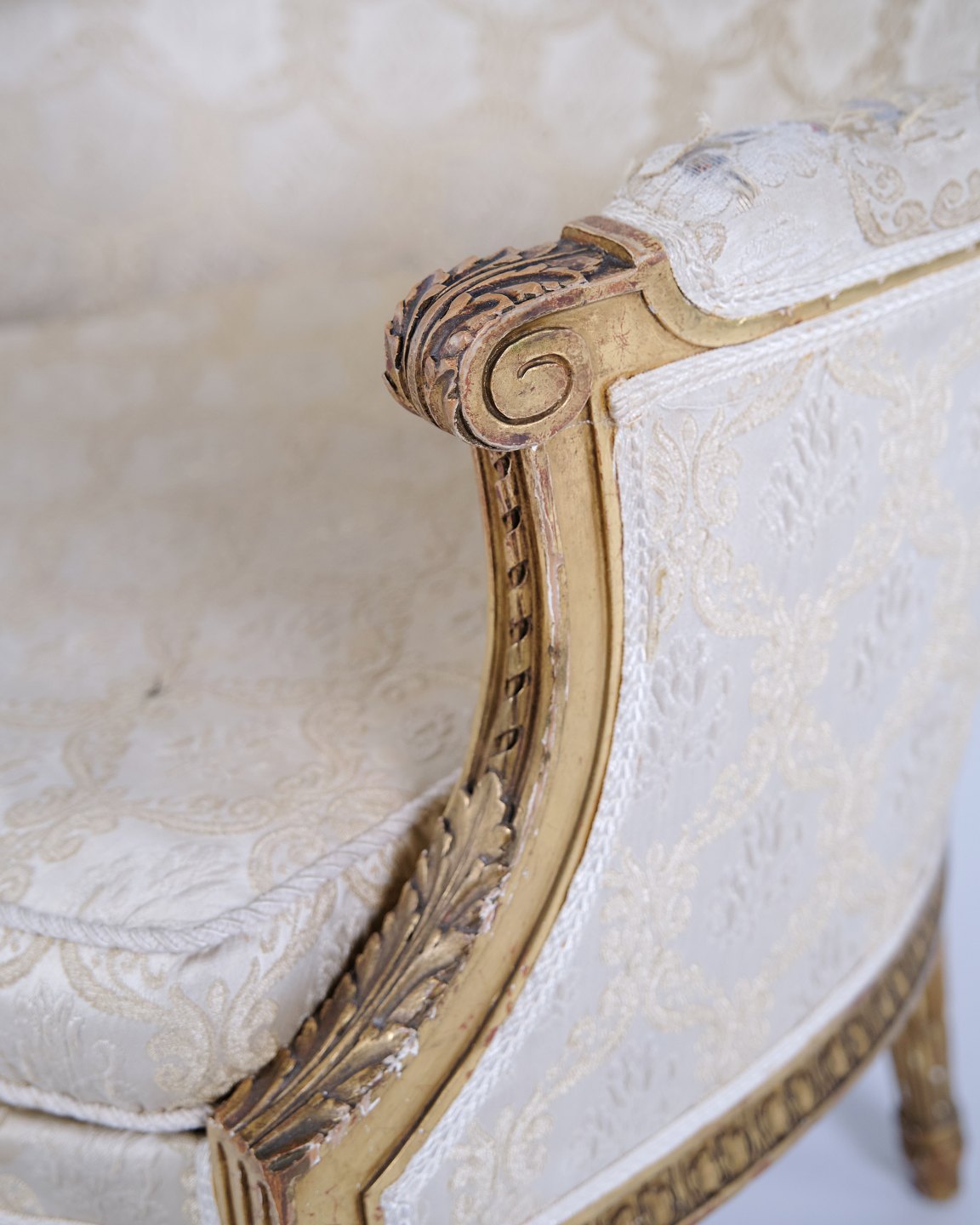 Antique bergère armchair from the 1860s in Louis XVI style. Gilded wood and light upholstery.