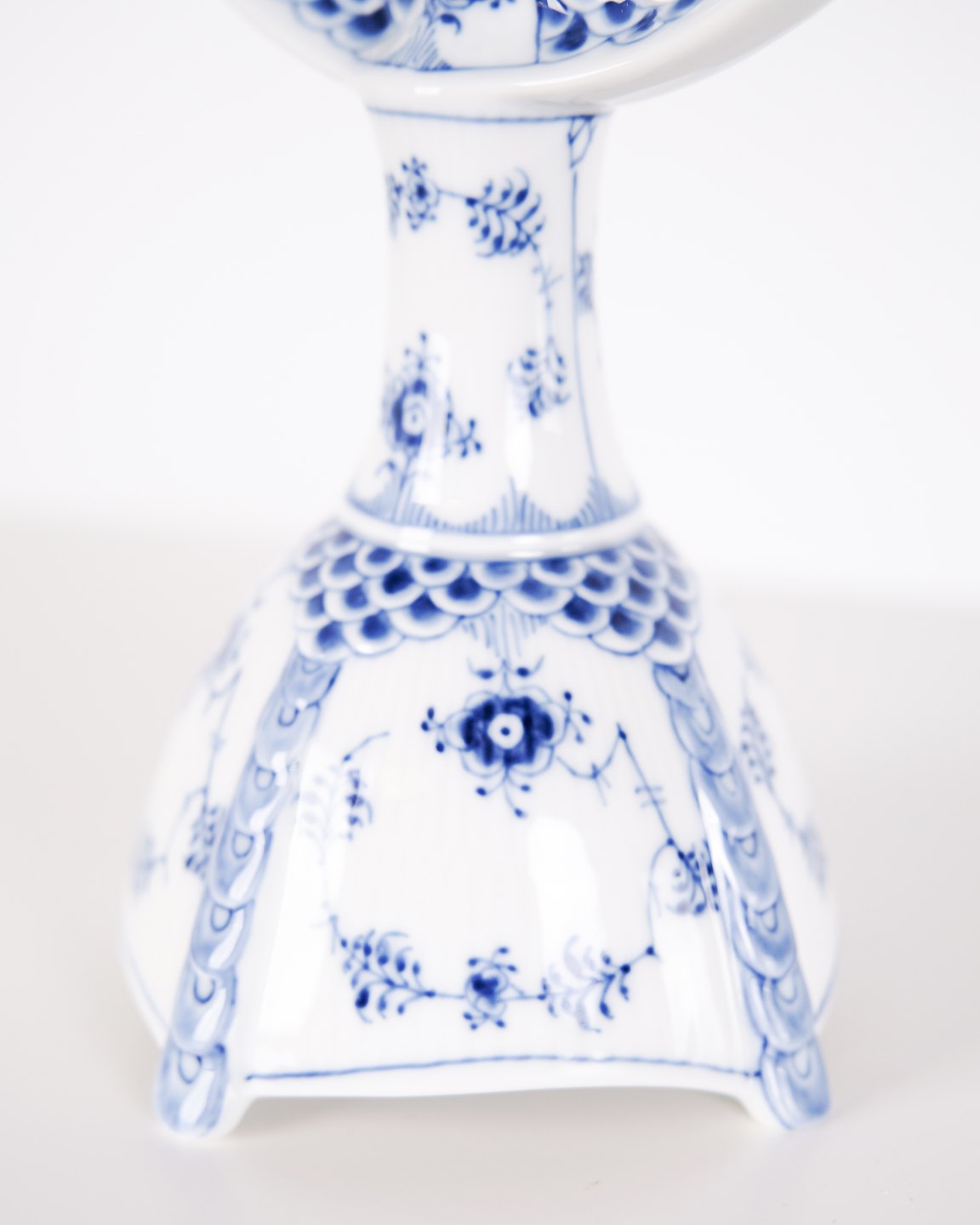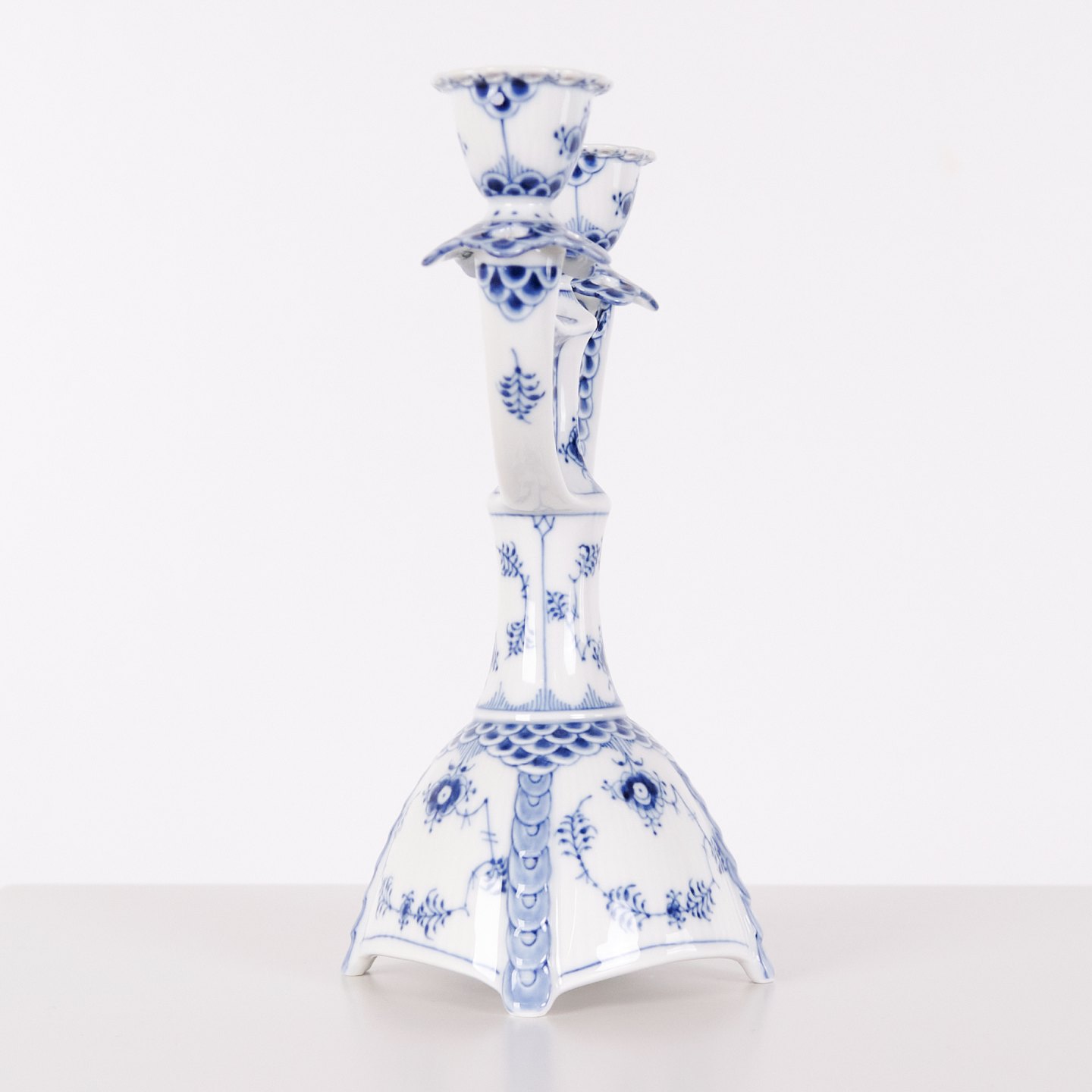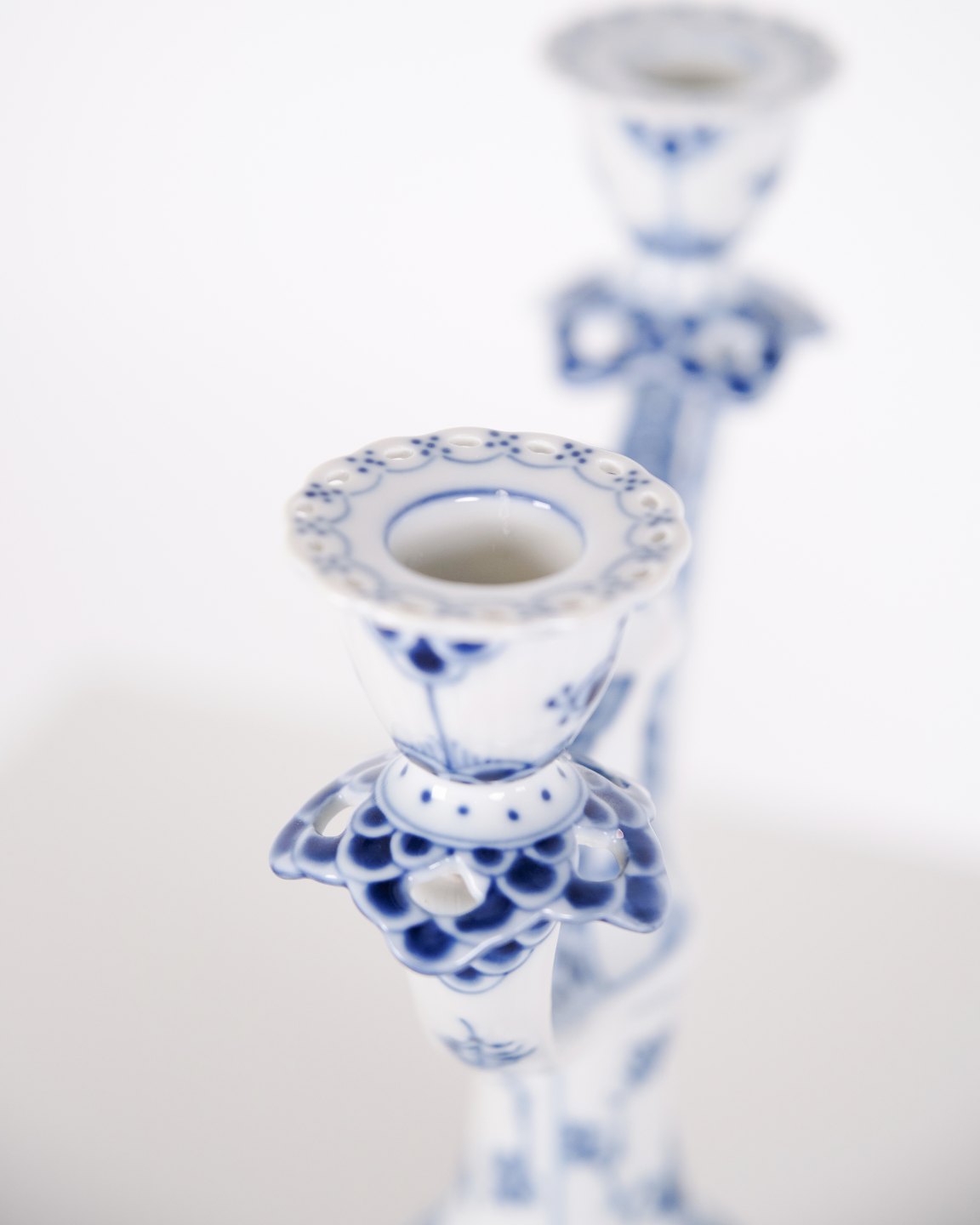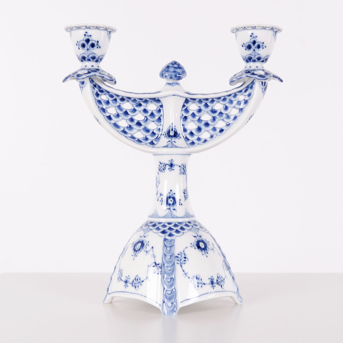 Two-arm candlestick in Blue Fluted Full Lace porcelain, model 1169, produced by Royal Copenhagen. Executed in hand-painted porcelain with the characteristic openwork lace border and underglaze decoration. Produced as first quality and part of Royal Copenhagen’s traditional tableware production.