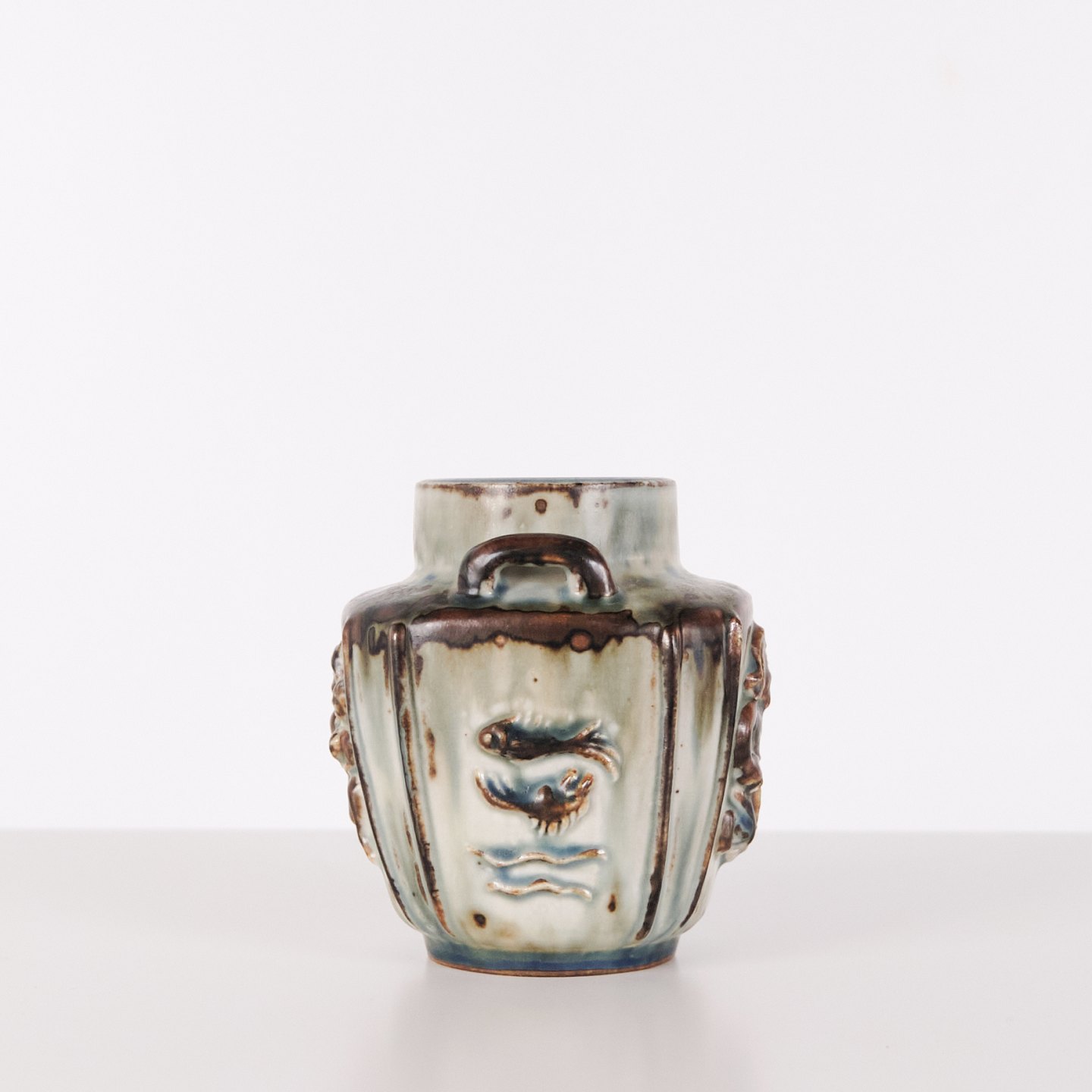 Stoneware vase designed by Bode Willumsen for Royal Copenhagen. The vase is modelled with relief decoration and was produced at Royal Copenhagen in Denmark between 1969 and 1973. Marked with monogram and model number 20121. An example of Danish ceramic design from the late 20th century.