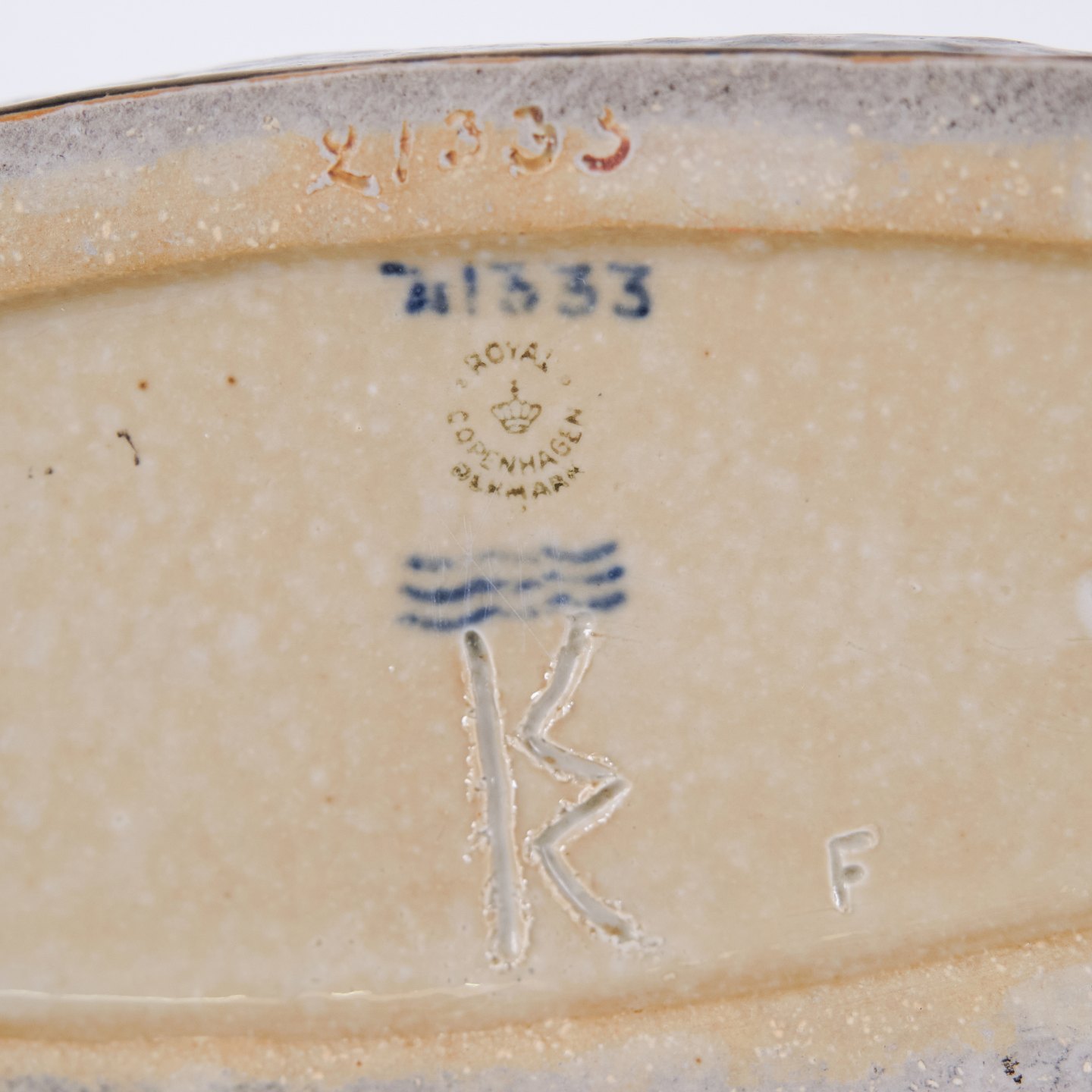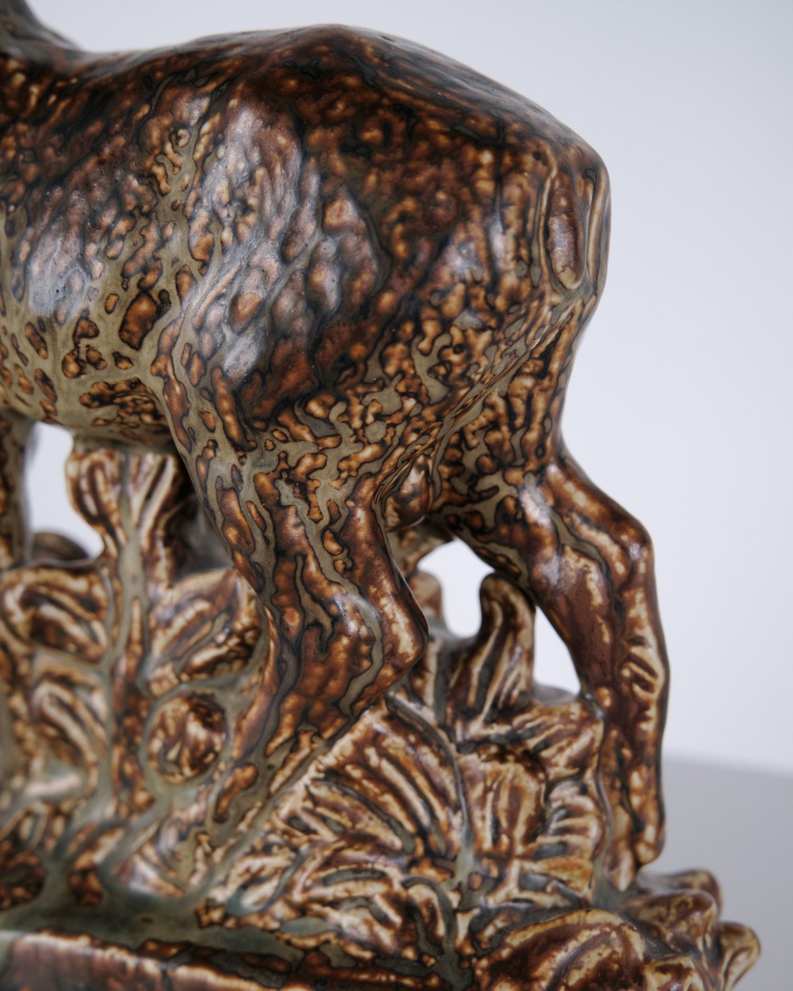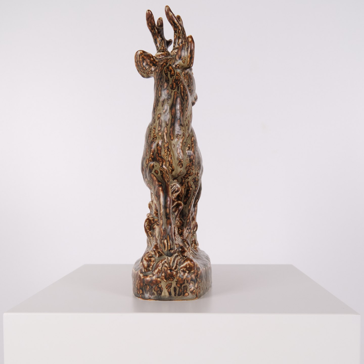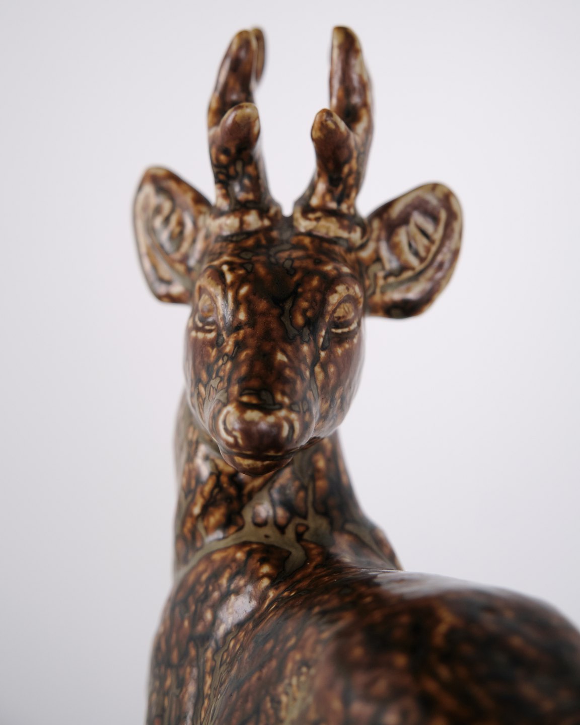 Stoneware figure depicting a standing deer, model no. 21333, designed by Knud Kyhn for Royal Copenhagen. The figure is executed in stoneware and belongs to Kyhn’s animal sculptures produced at Royal Copenhagen in the mid-20th century.