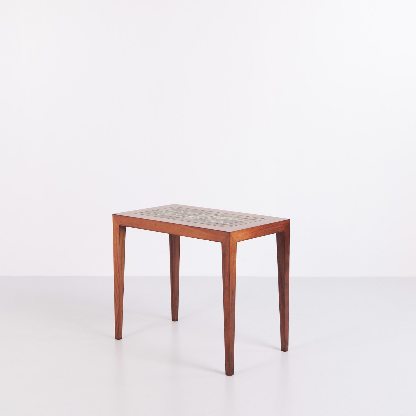 Side table, model 163, designed by Severin Hansen and produced by Haslev Møbelsnedkeri. The table is made of wood and features inset green faience tiles designed by Nils Thorsson for Royal Copenhagen. The combination of cabinetmaking and ceramic tiles is characteristic of Danish furniture from the 1960s.