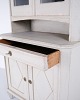 The cabinet stands on elegant, tapered legs and features an upper section with glass doors, giving it a light and classic appearance. Inside there are four shelves in the display section, while the lower section includes both a practical drawer and storage space.