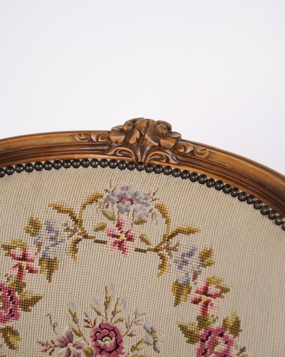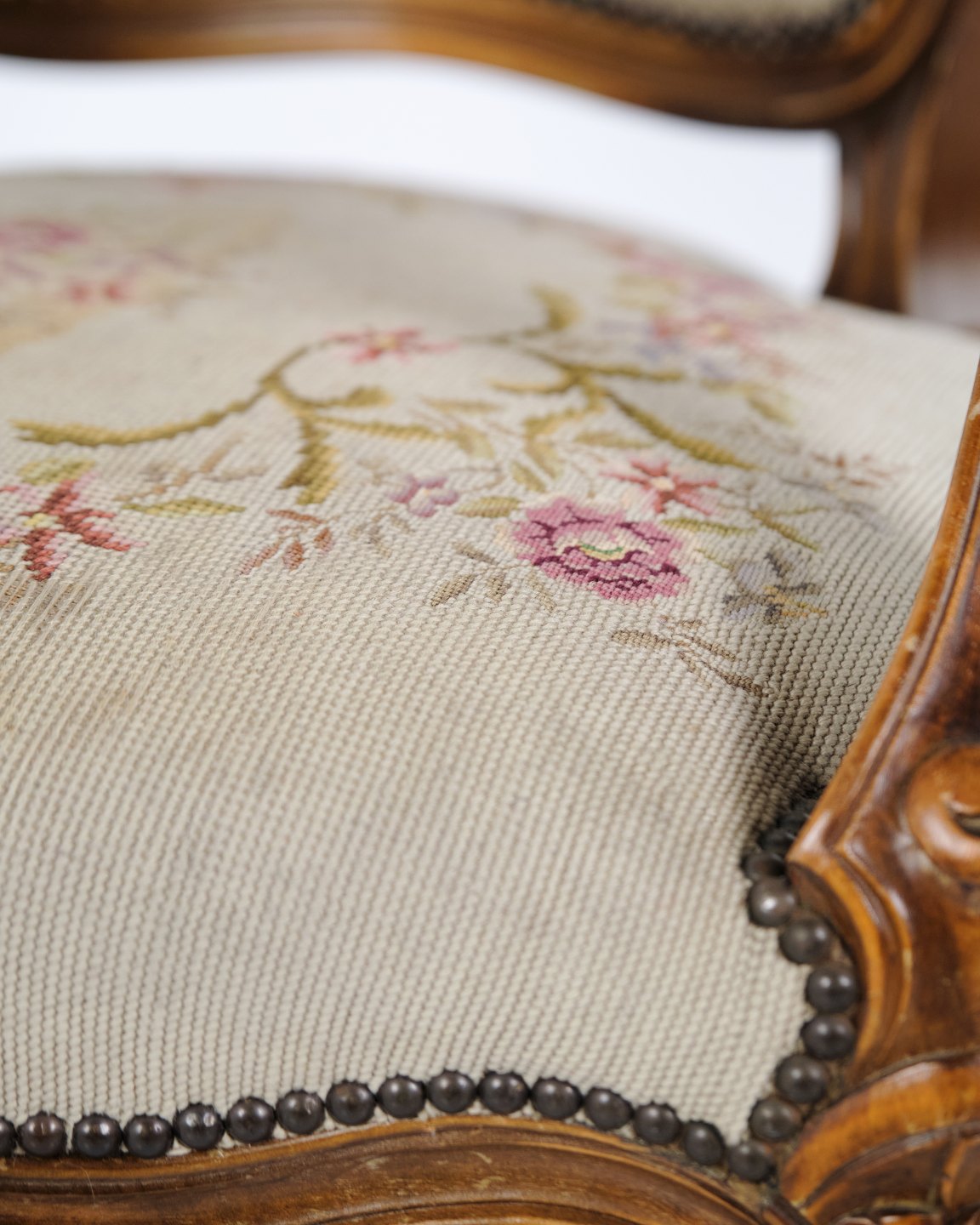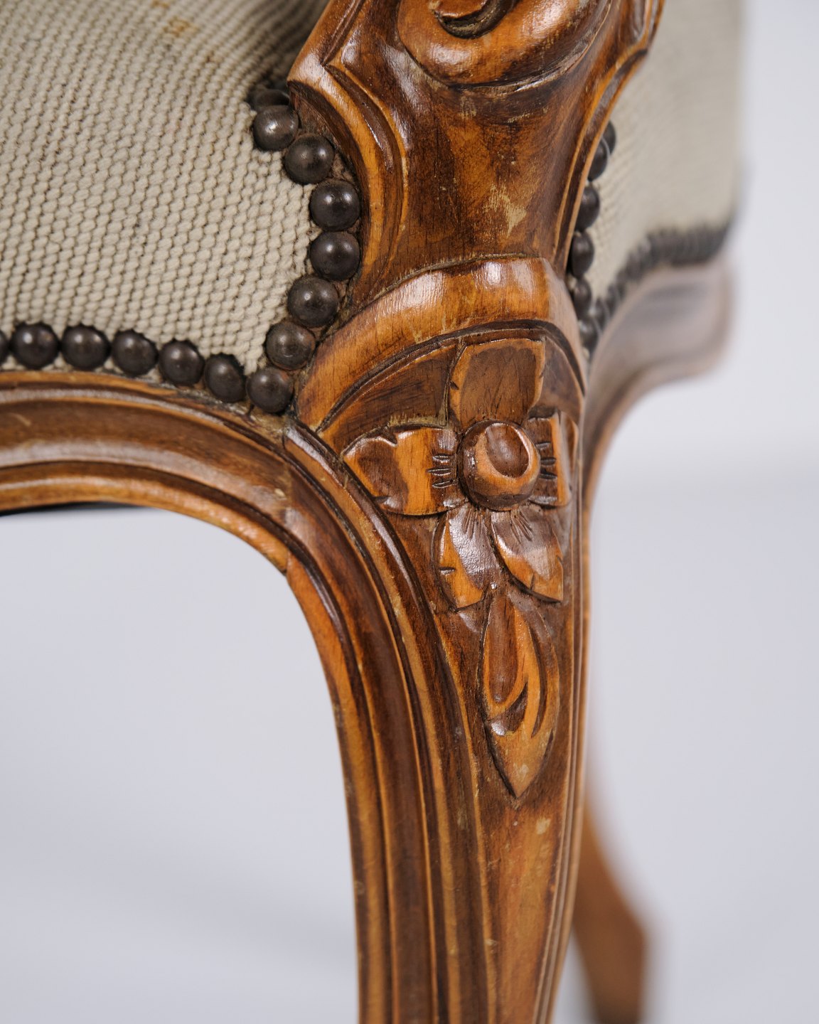 Neo-Rococo armchair from the 1930s with curved legs and floral fabric. Classic and decorative piece of furniture with a romantic expression.