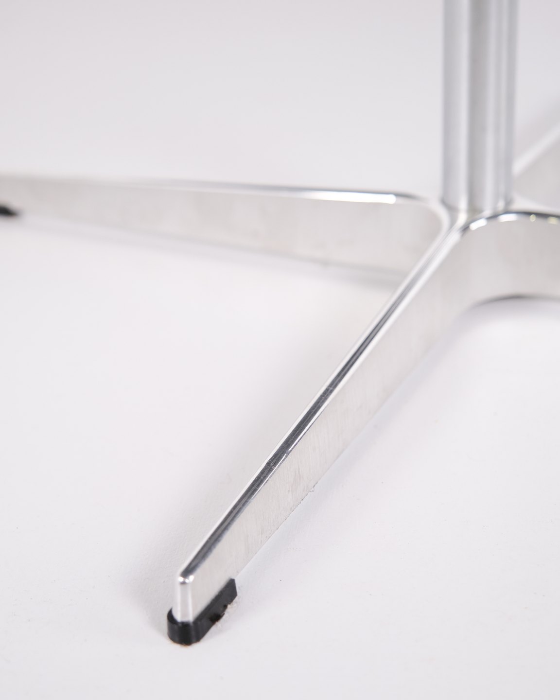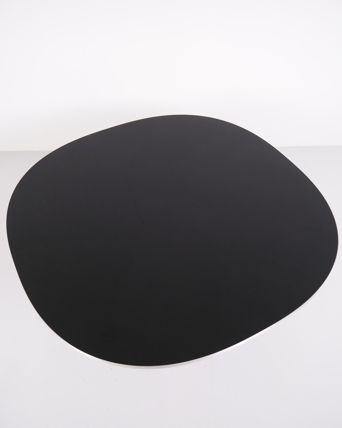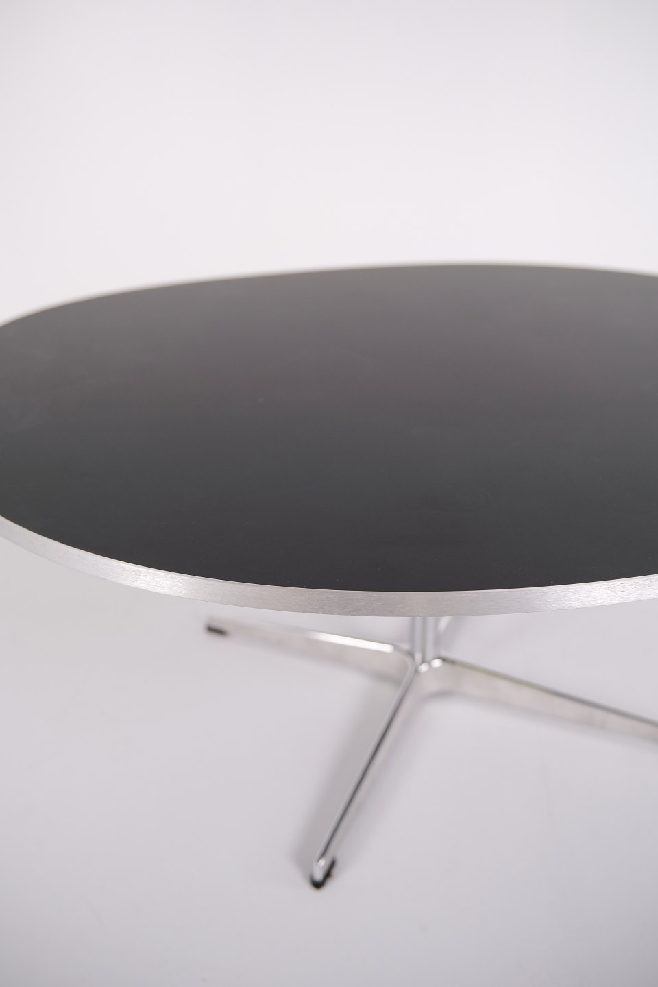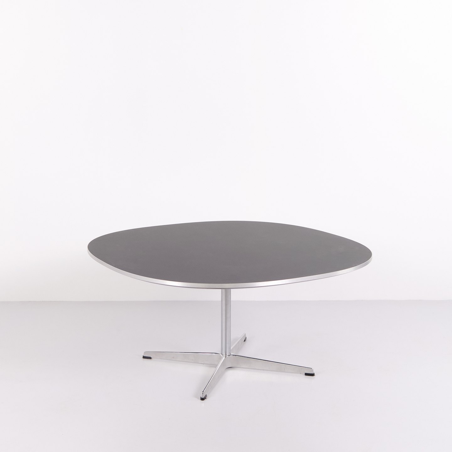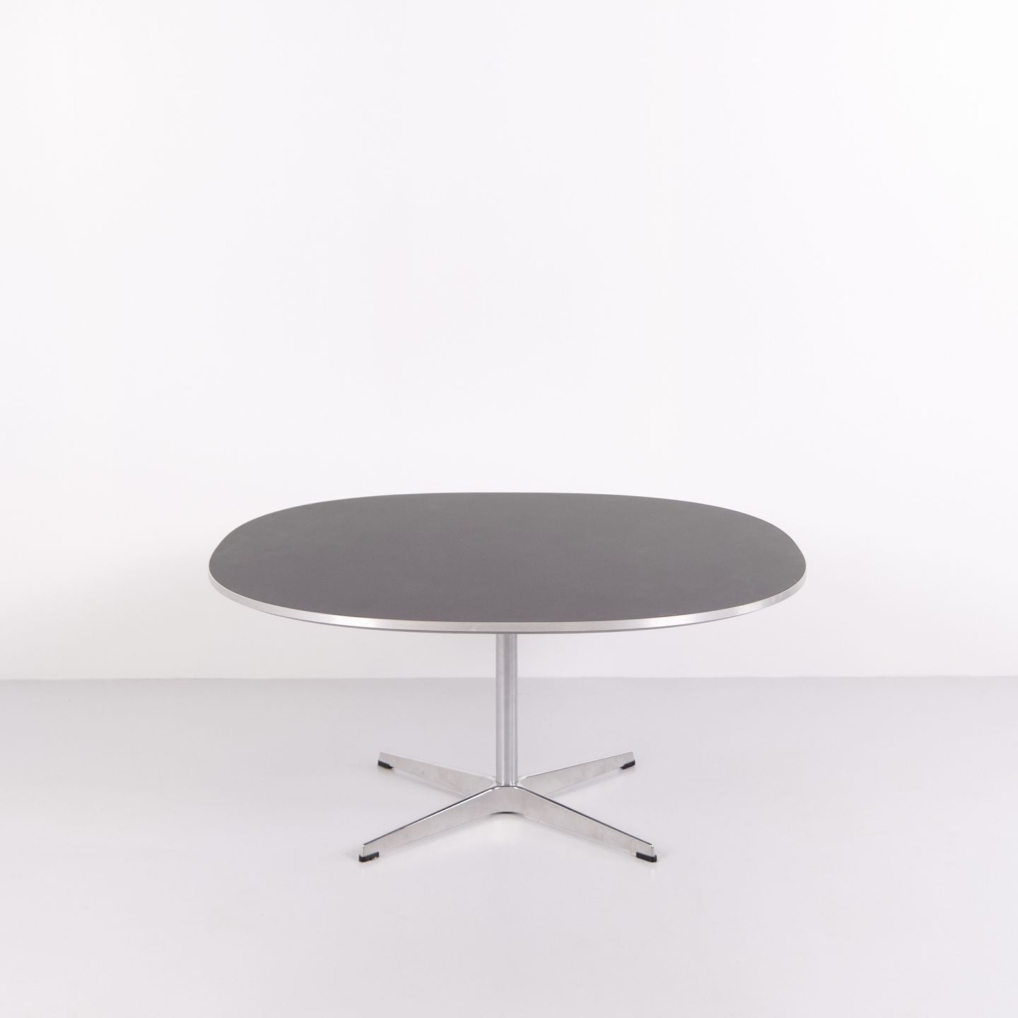 This example was manufactured by Fritz Hansen in 2023 and features an aluminium base with a black laminate tabletop. The table represents a contemporary example of this classic Danish design.